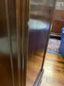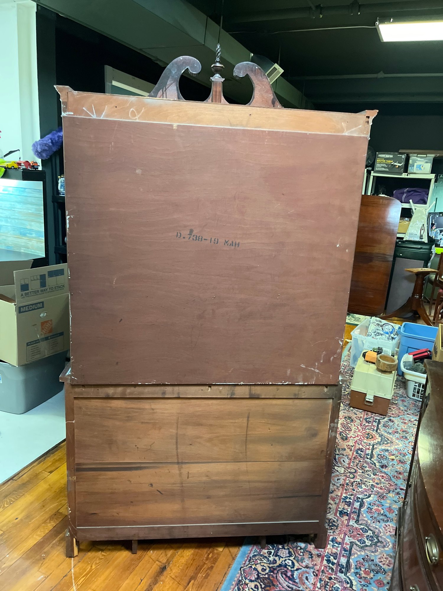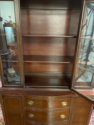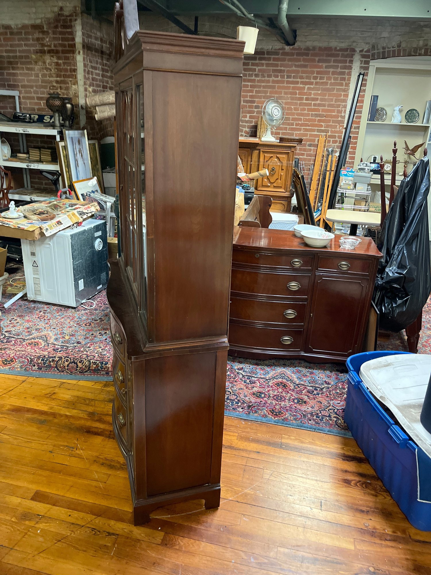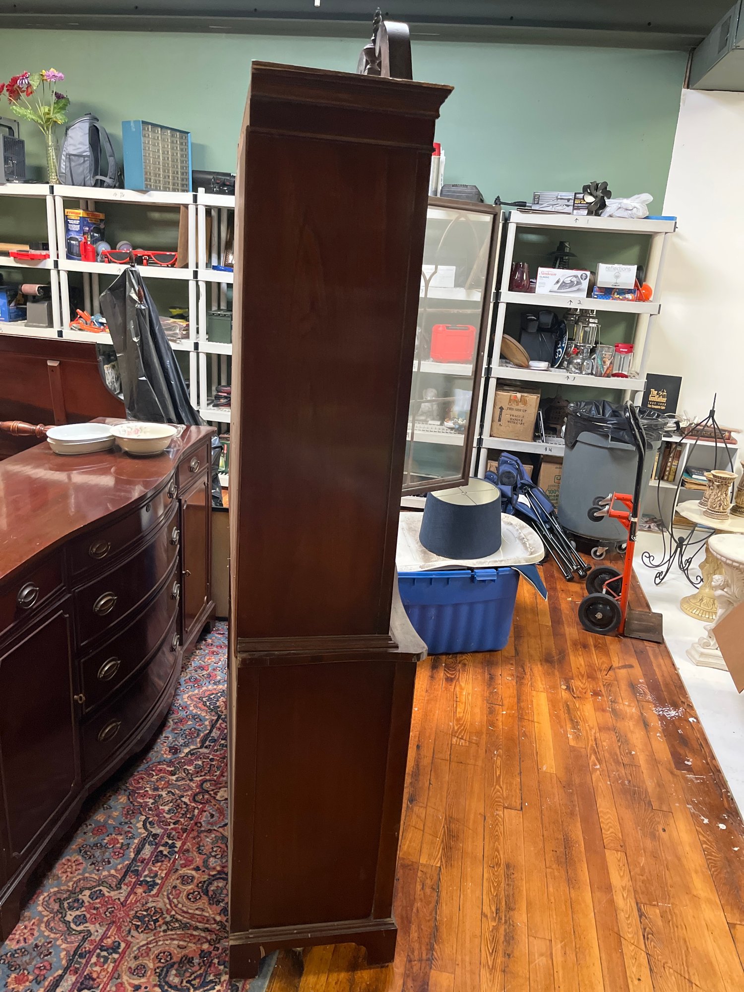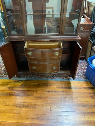 Measurements are 45 inches wide 48 inches tall 15 inches in depth see pictures for details some scratches and nicks so nice piece has glass front with two shelves three drawers with two doors on the bottom