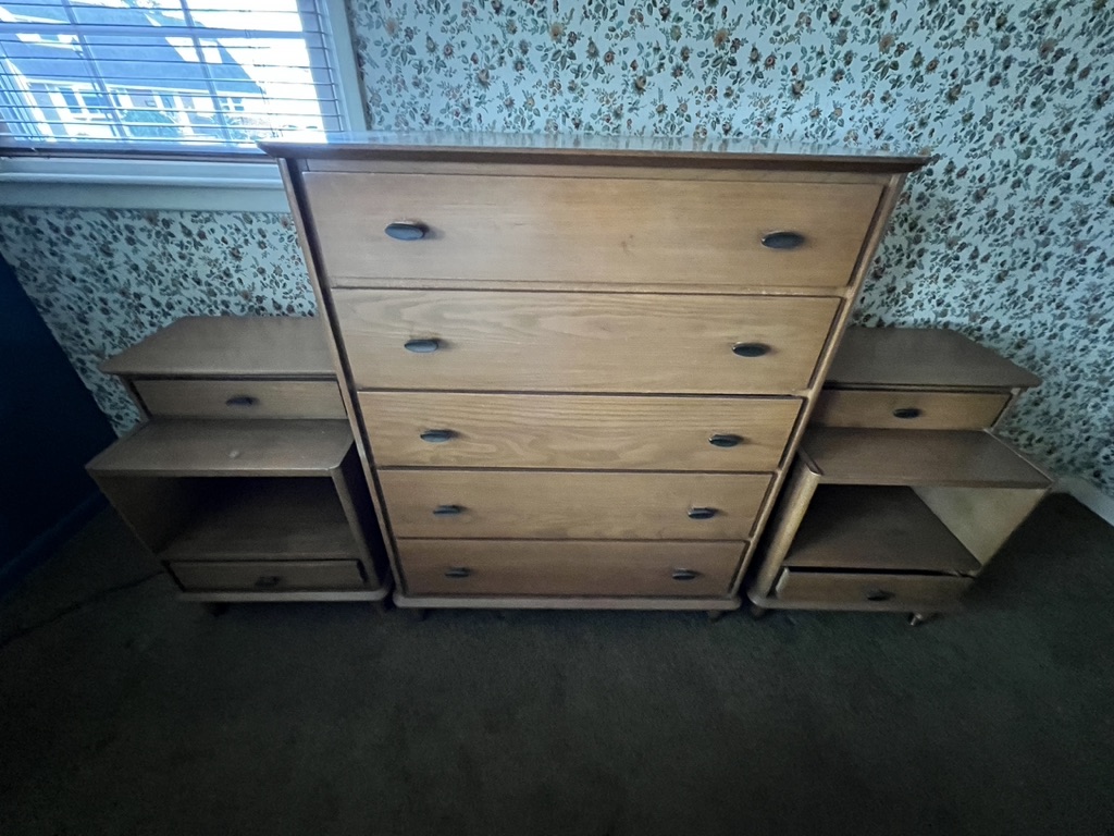 queen sized bedroom set, Vanleigh made of white ash wood, good condition, bed headboard with footboard, ladies dresser, with mirror, mans highboy, 2 end tables with shelves and drawer