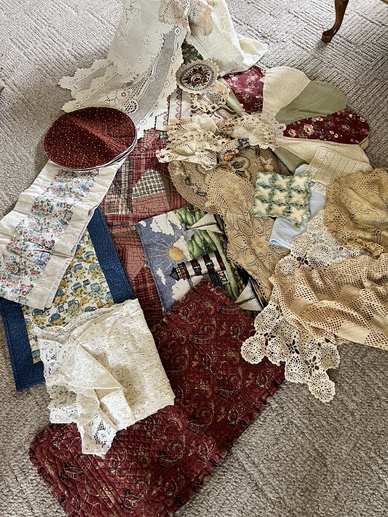 Multiple pieces of lace, runners, doilies, place mats, quilted runners, wall hangers, VERY generous lot