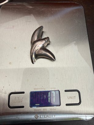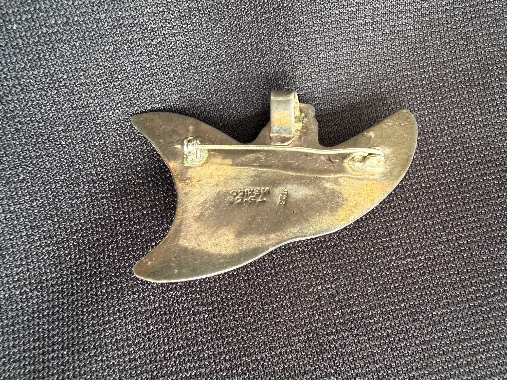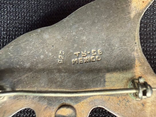 Totally unique and charming sterling silver brooch in the form of a manta ray, stamped 925 and "T5-5B Mexico" indicated the stamp of a silversmith in Taxco. Only one other example was found online, listed for $200 on eBay. Great find!
