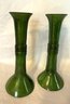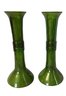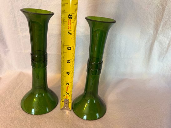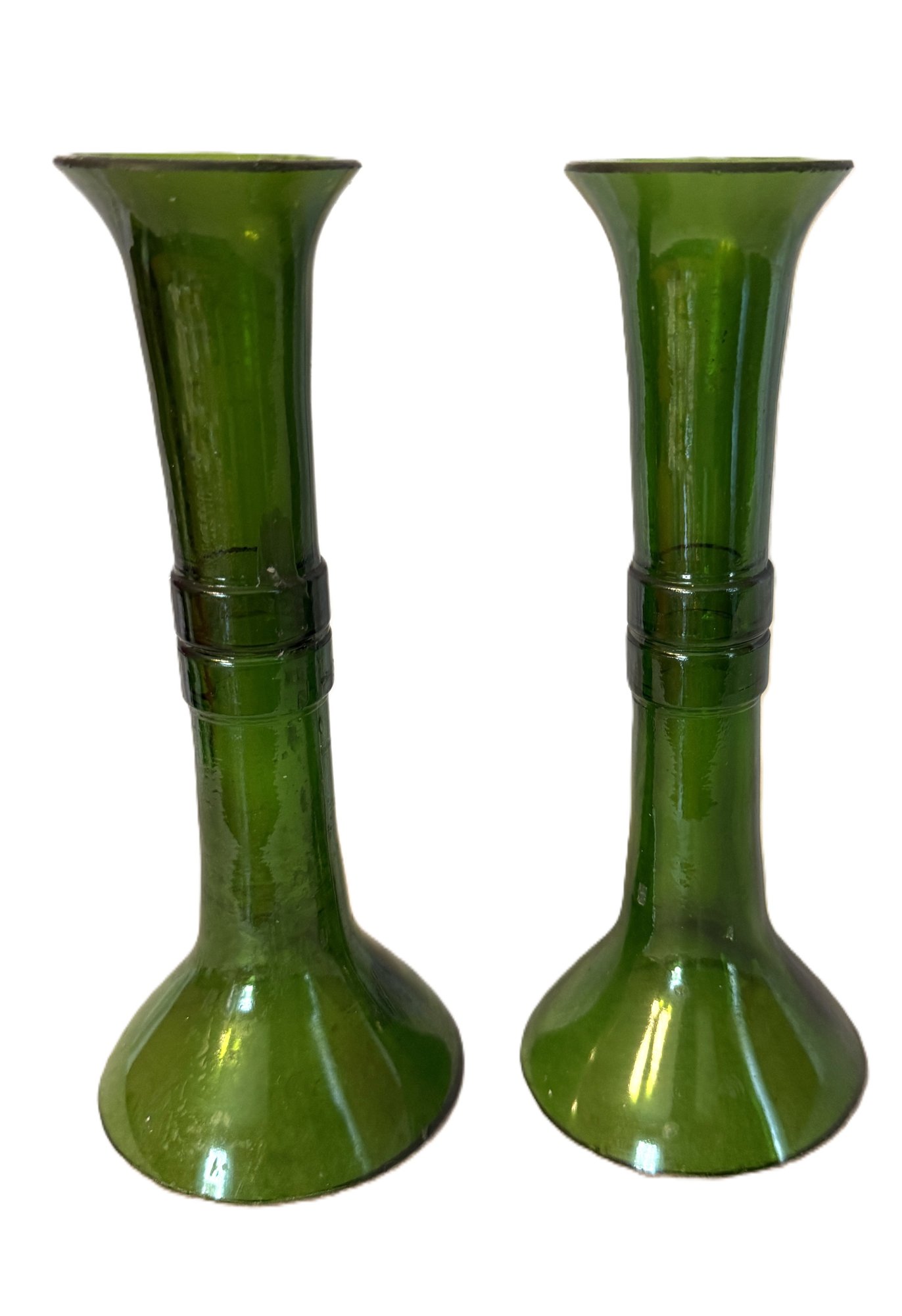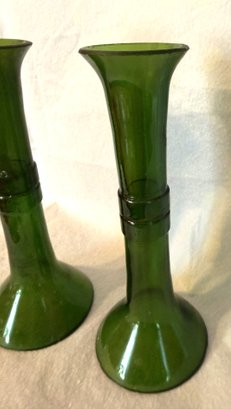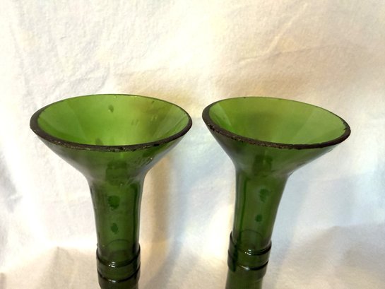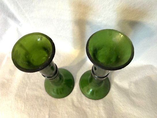 Vintage "tramp art" green glass from the necks of former wine bottles melted together to form candlesticks.