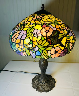 The lamp is a reproduction with a heavy shade that appears to be made of some kind of thick plastic material - it's difficult to determine it's exact composition.
