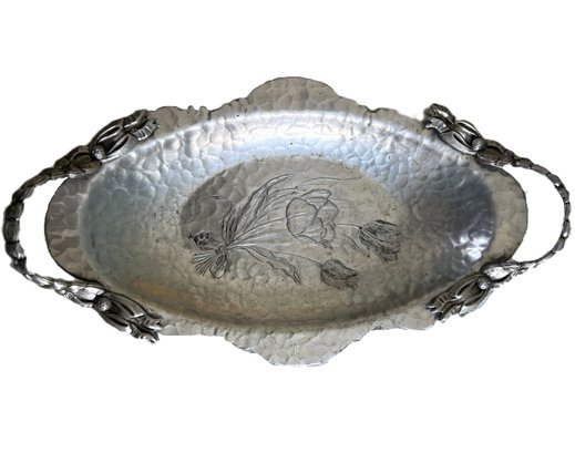 Beautiful vintage circa 1940s Rodney Kent Hand Wrought Creations hammered aluminum oval tray featuring a tulip and dogwood blossom and ribbon handle design.