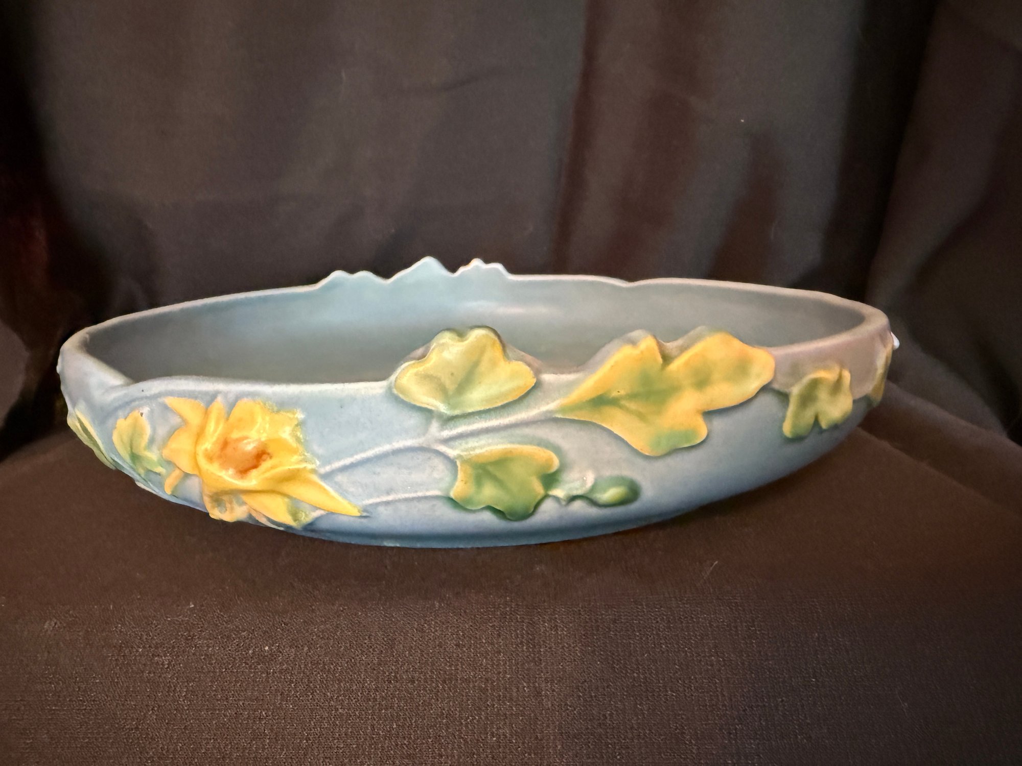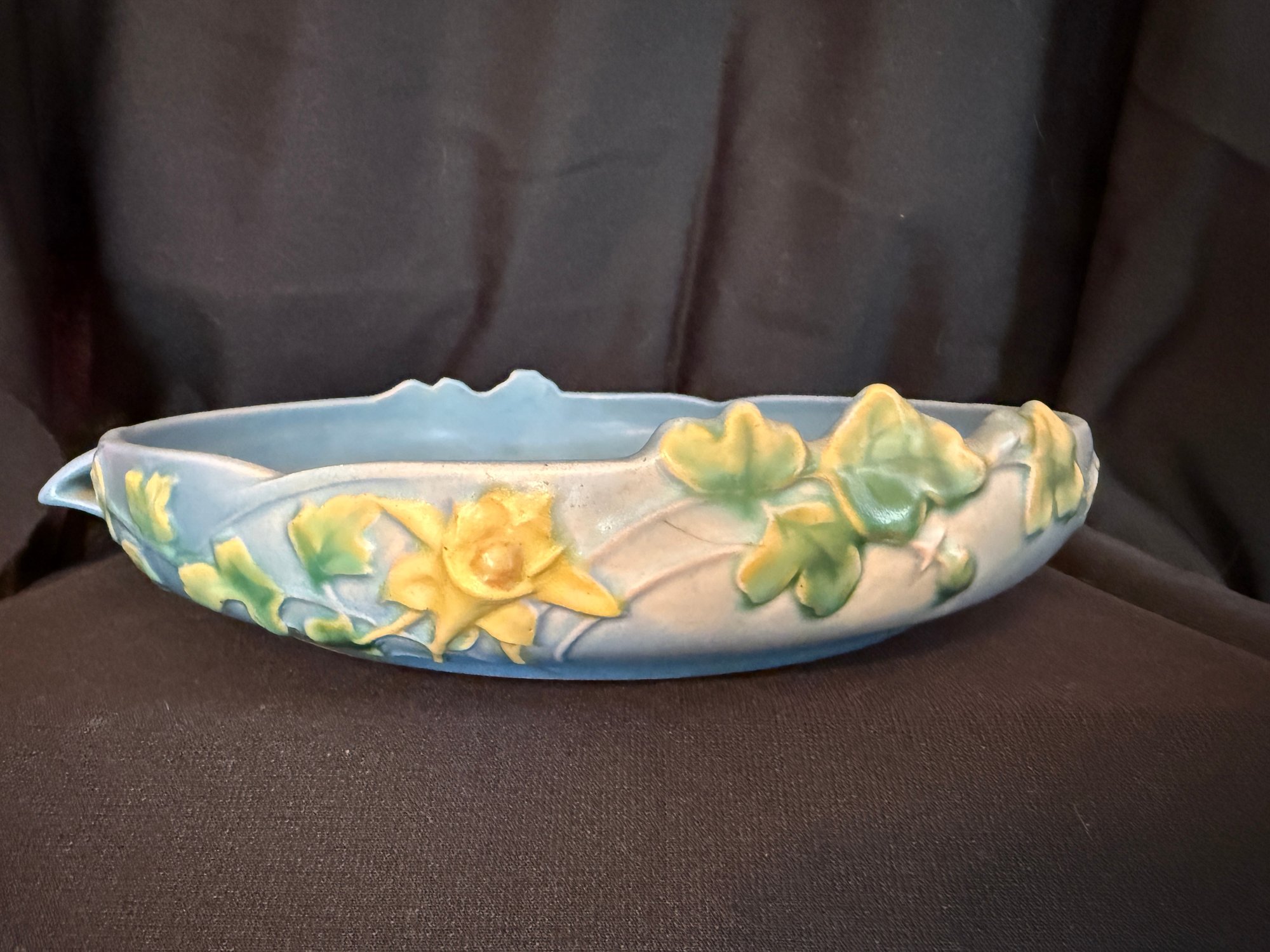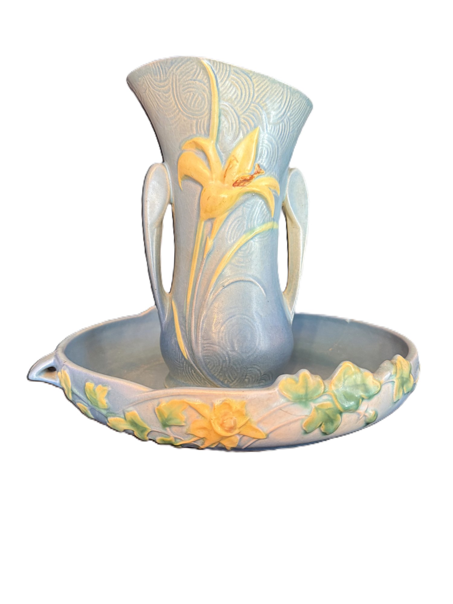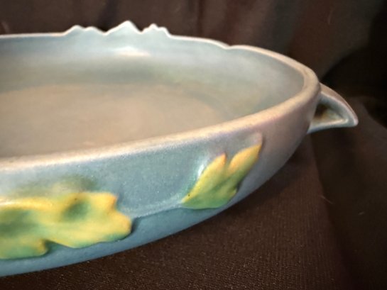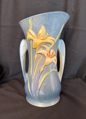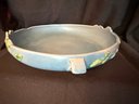 Delightful duo of Roseville pottery from the 1940s, including one Columbine pattern 10" bowl against a blue background and Zephyr Lily double-handled 9" vase.