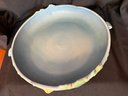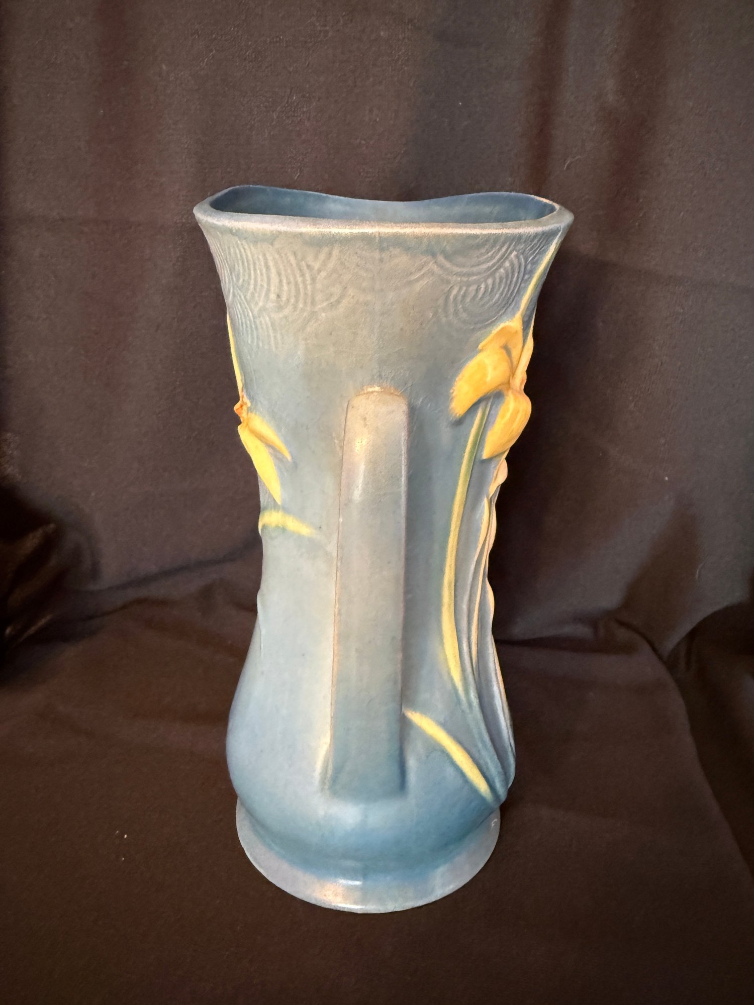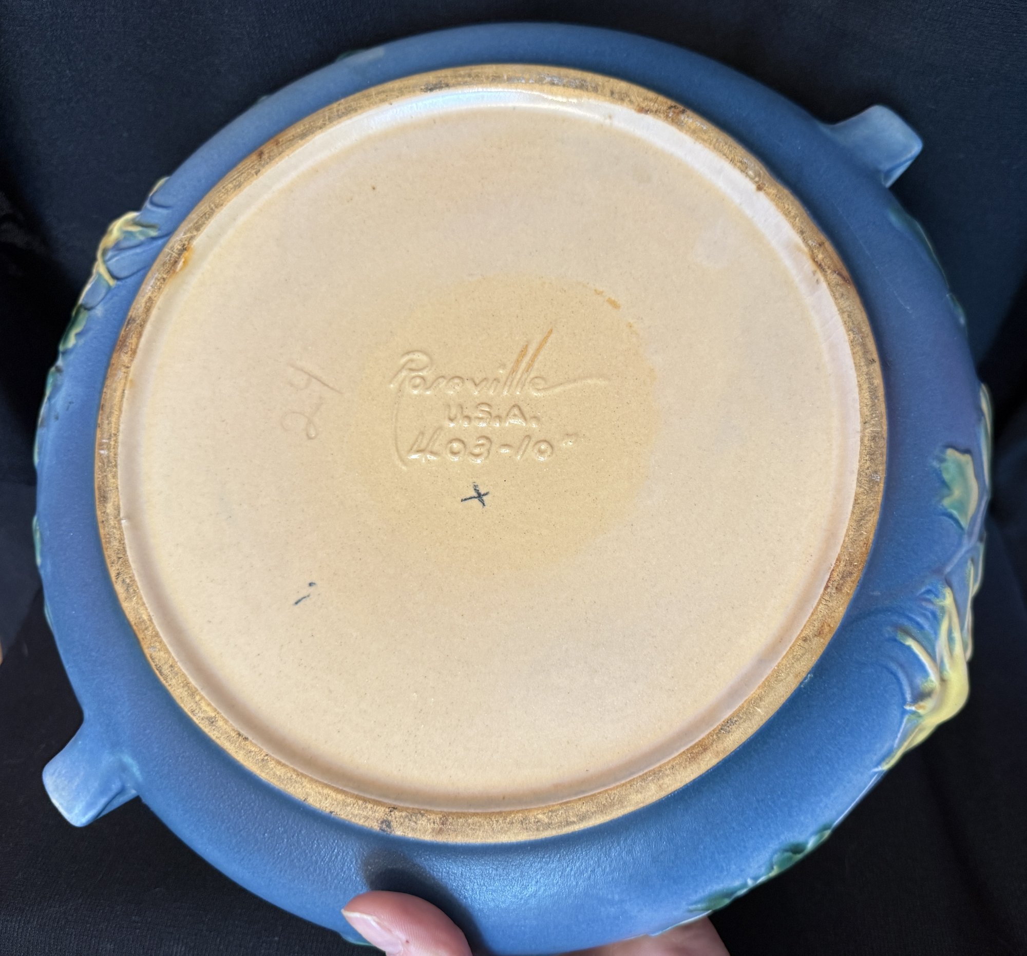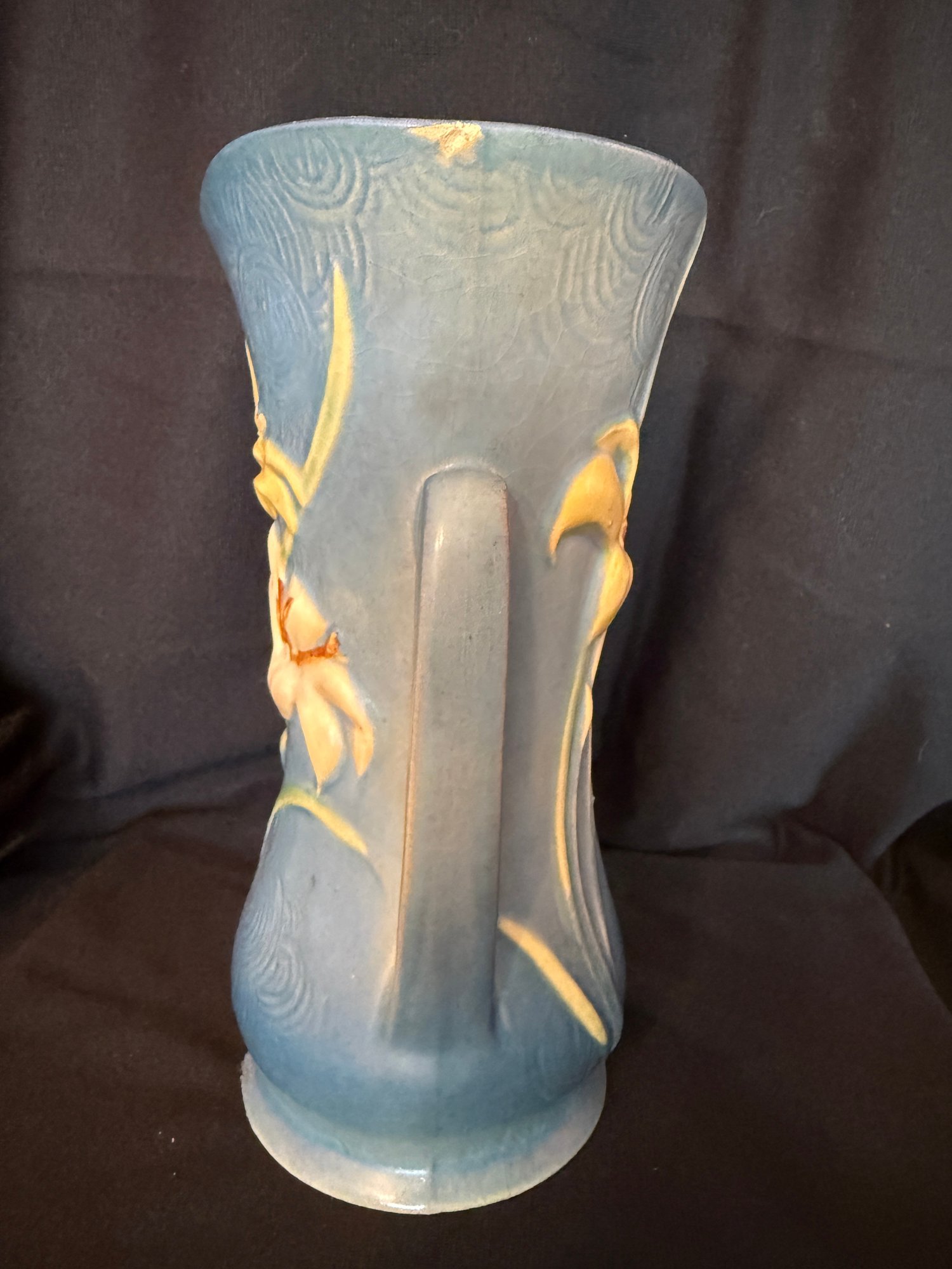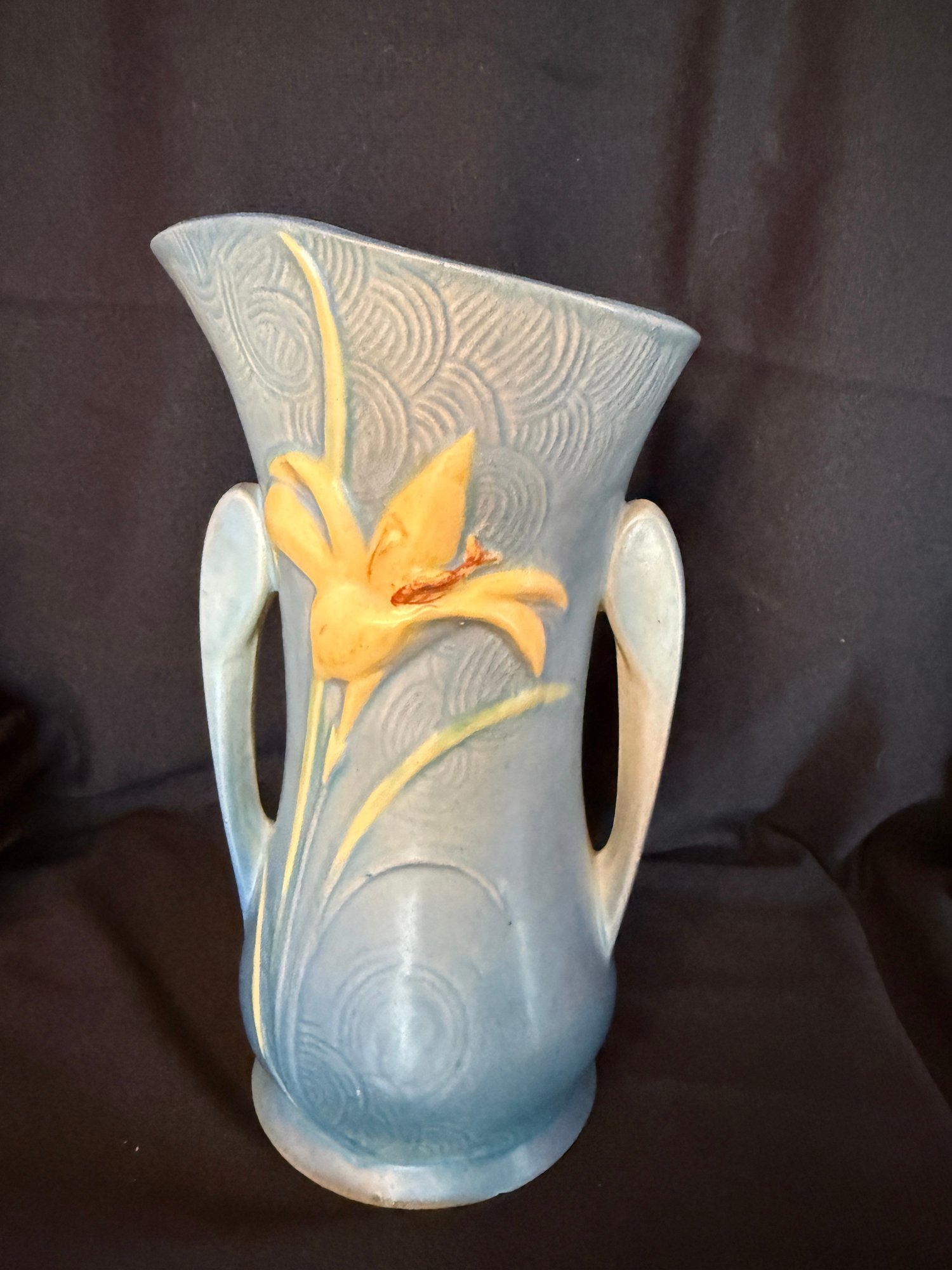 Delightful duo of Roseville pottery from the 1940s, including one Columbine pattern 10" bowl against a blue background and Zephyr Lily double-handled 9" vase.