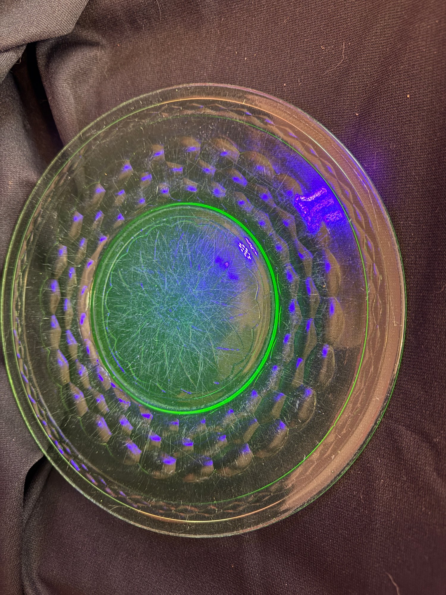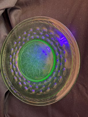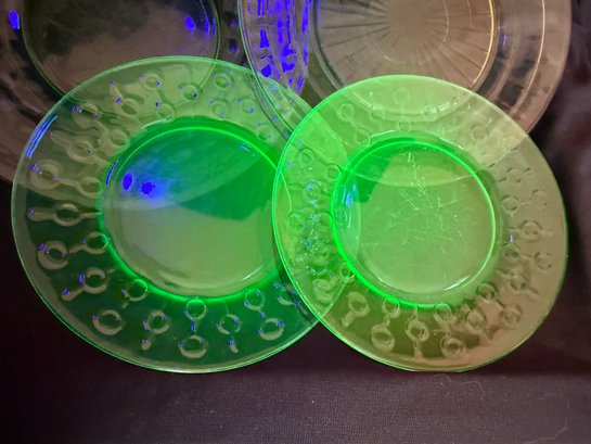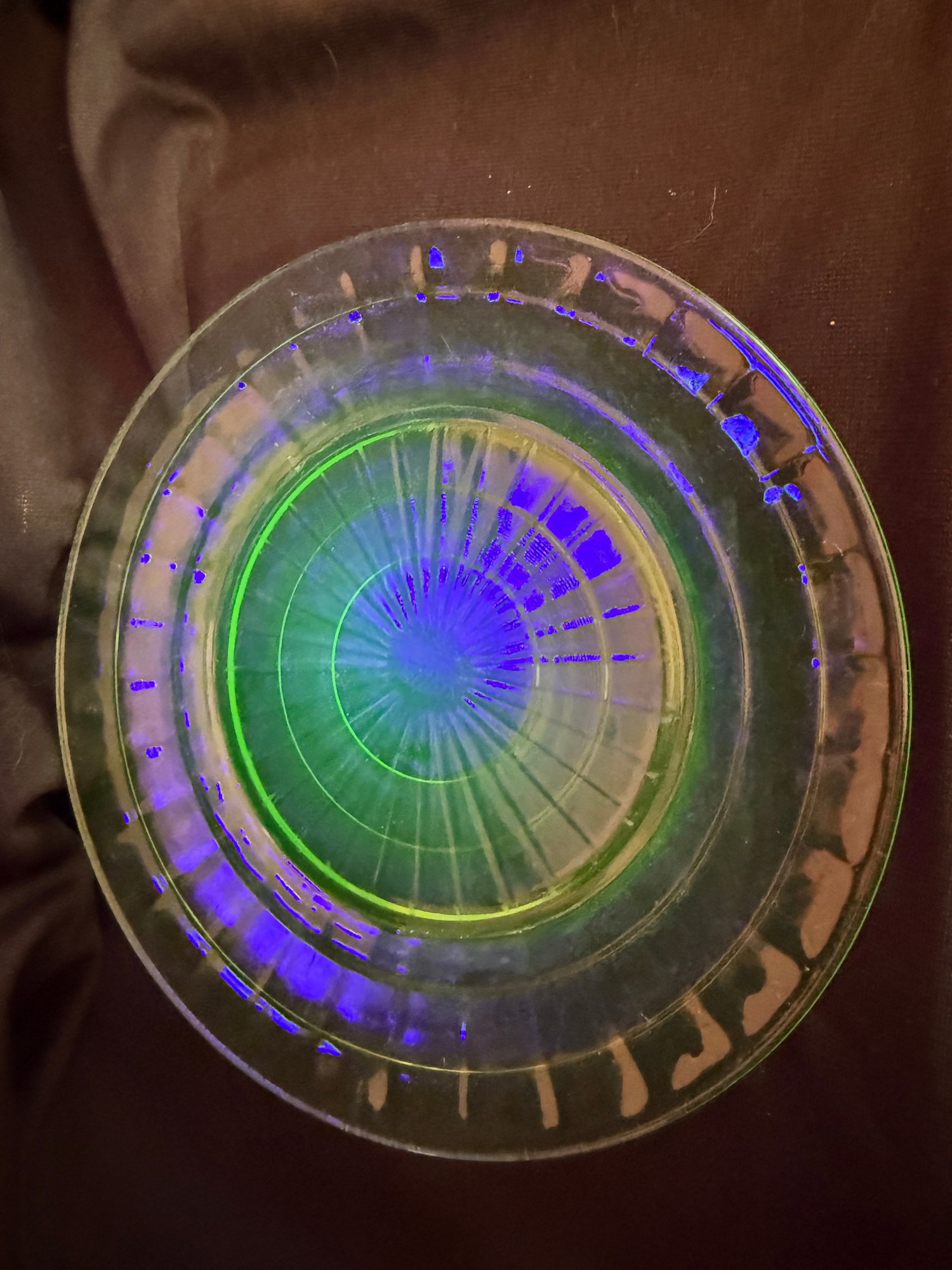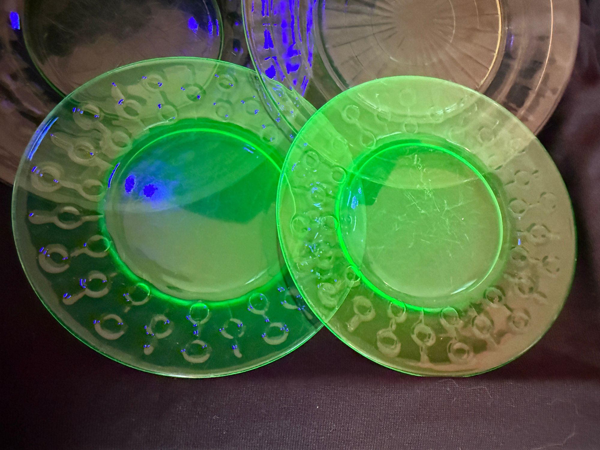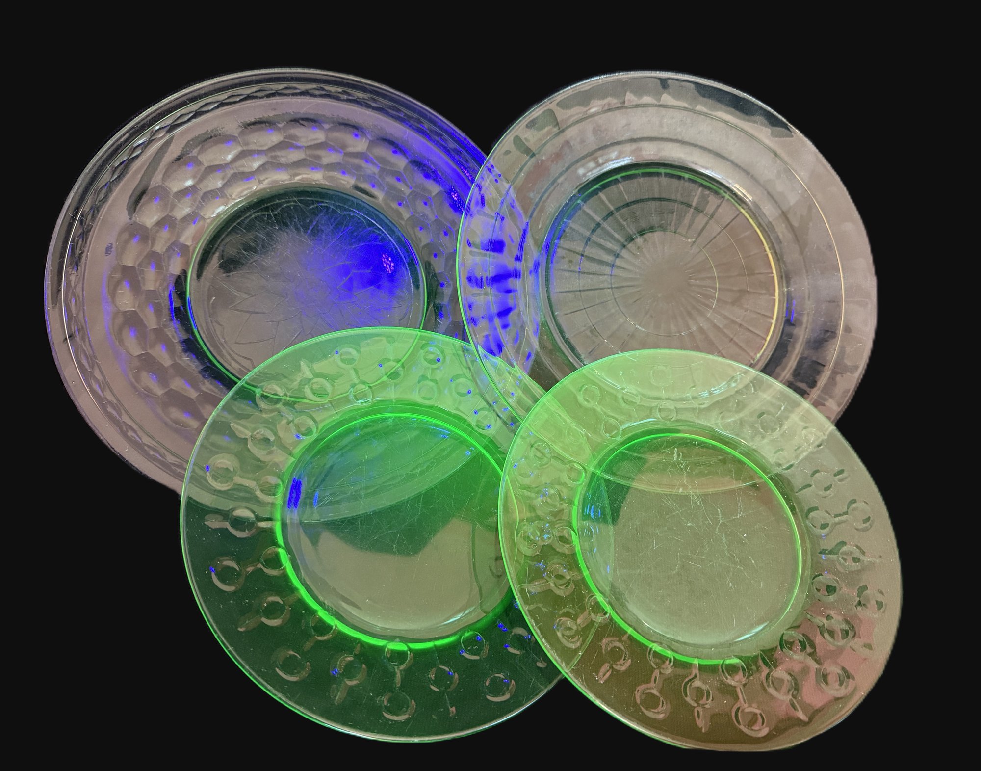 Grouping of four uranium glass plates, two of which are a pair with a strong a glow, the other two have much more faint glows under UV light. Hazel Atlas The photos were primarily taken under a black light mini flashlight, the last few photos show them in natural lighting.