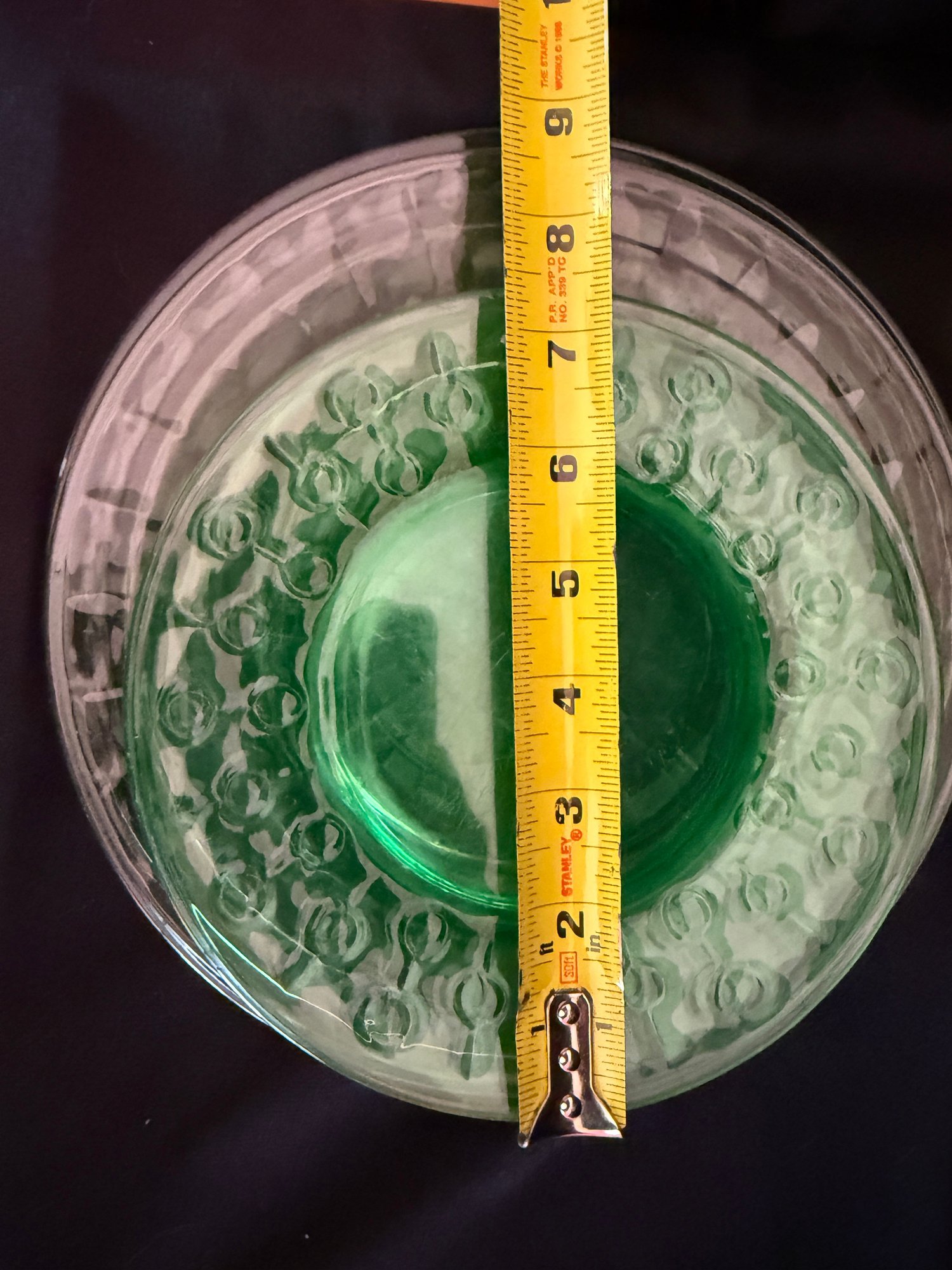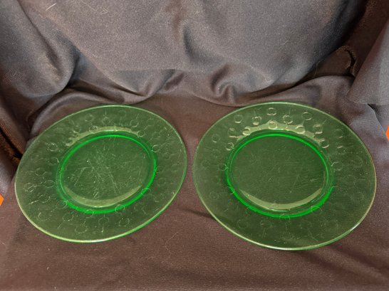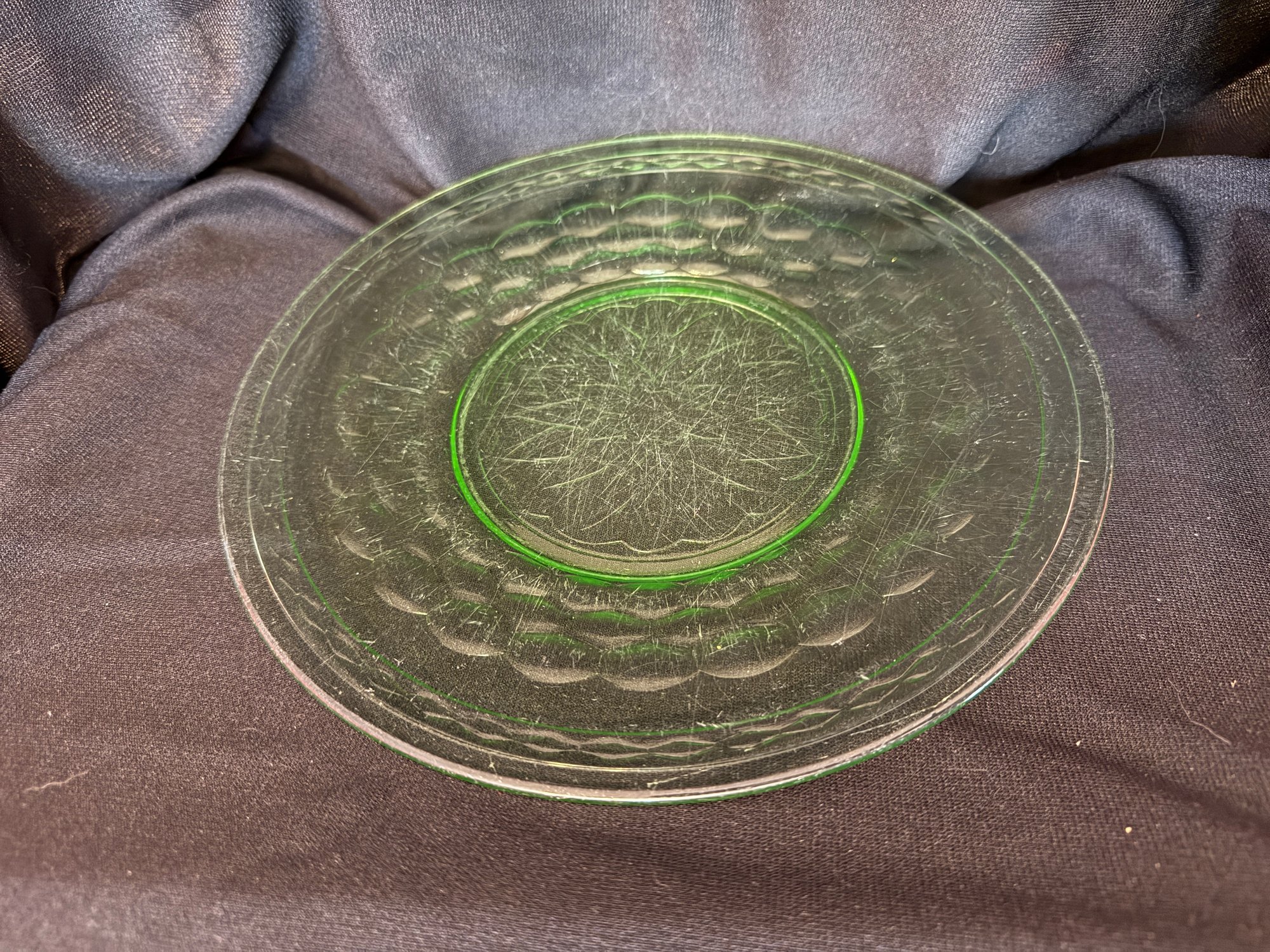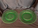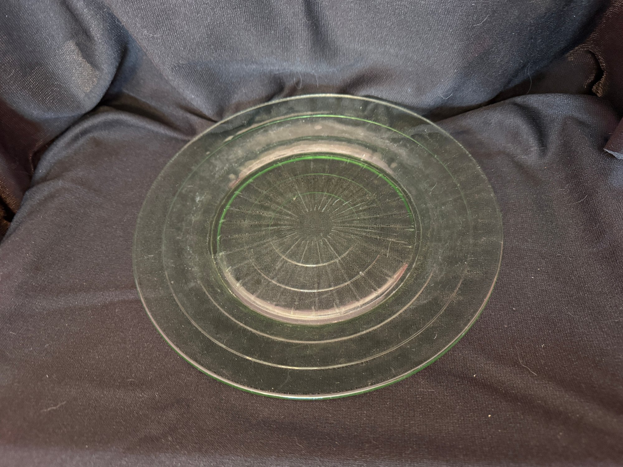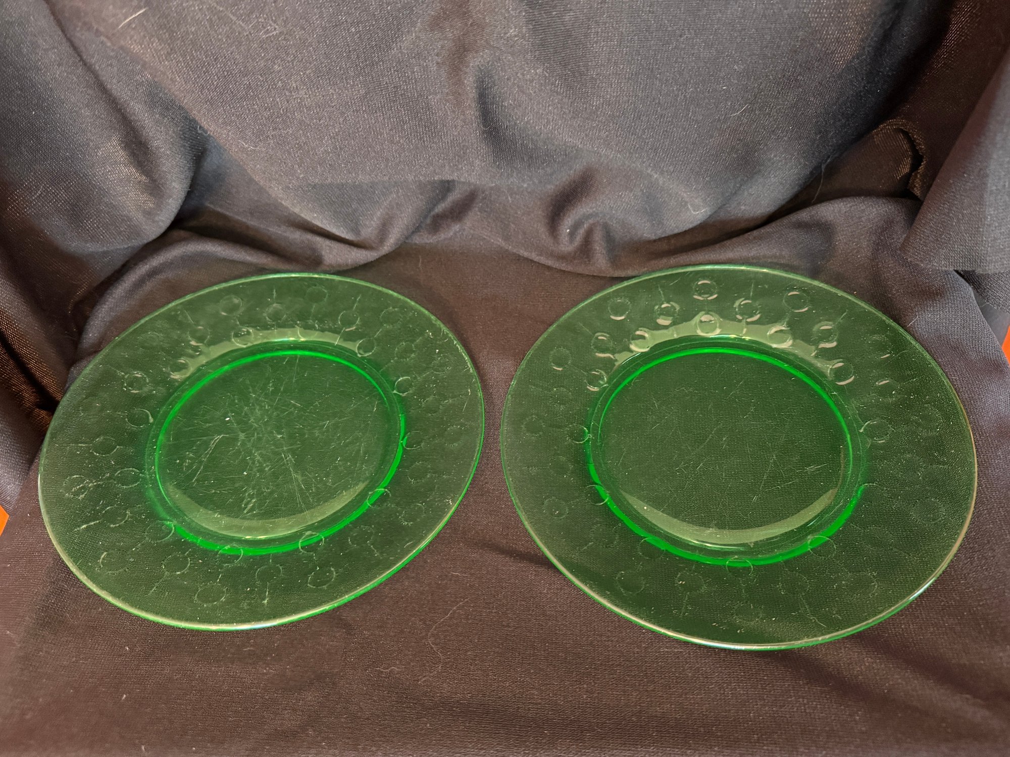 Grouping of four uranium glass plates, two of which are a pair with a strong a glow, the other two have much more faint glows under UV light. Hazel Atlas The photos were primarily taken under a black light mini flashlight, the last few photos show them in natural lighting.