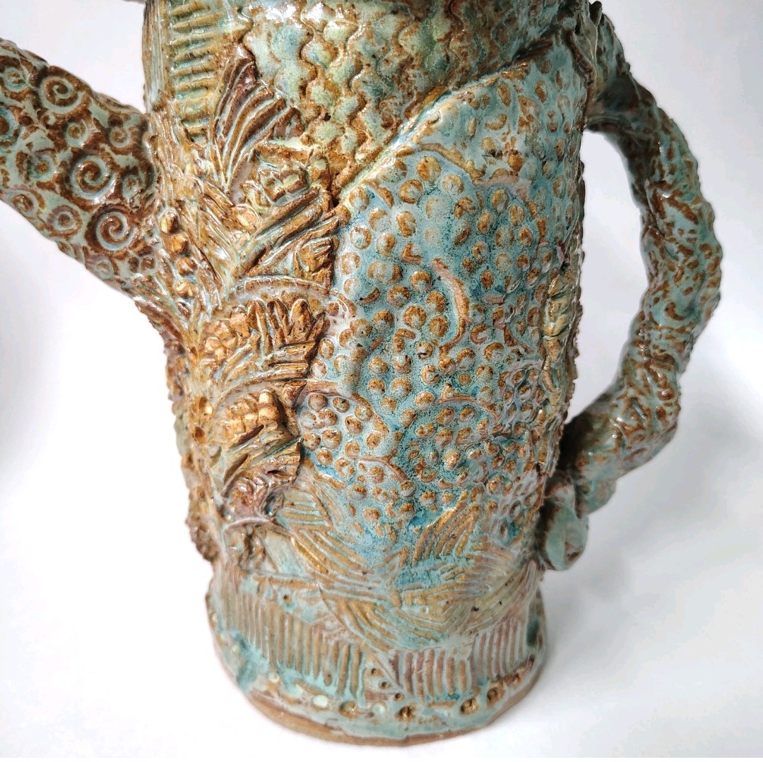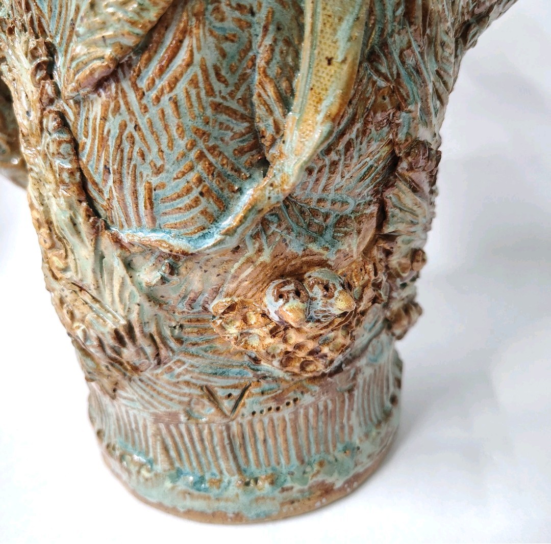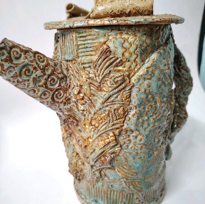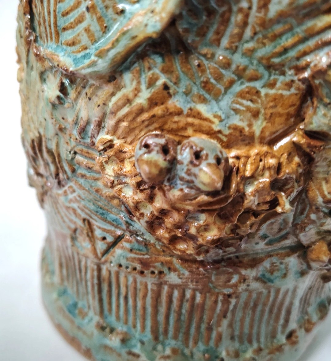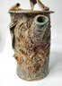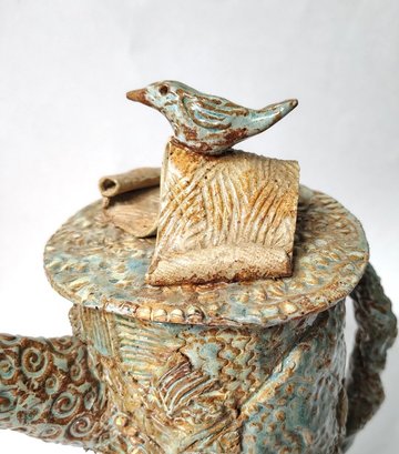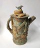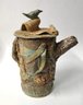 This is a quirky whimsical Brutalist Style OOAK piece by artist Sharon Vinciguerra sculpted with paper & clay it features BIRDS on handle and bird nest with babies on body, her work was all handcrafted and not duplicated