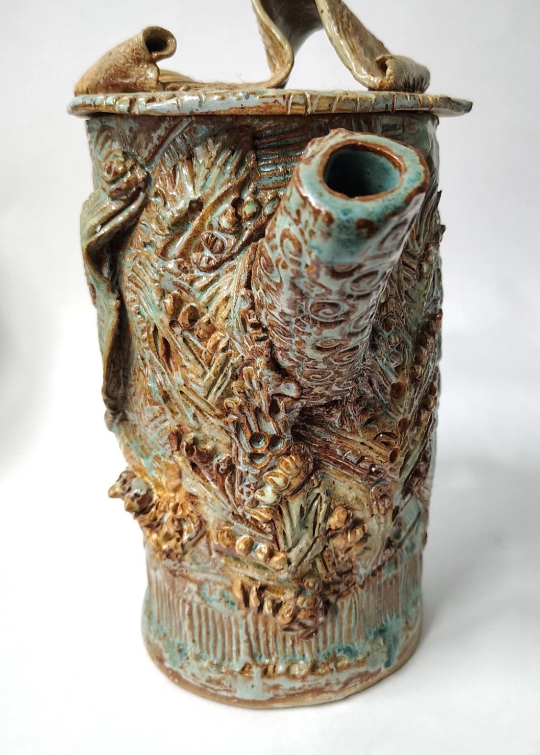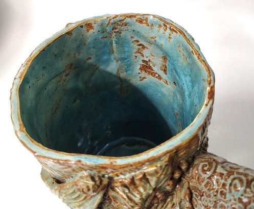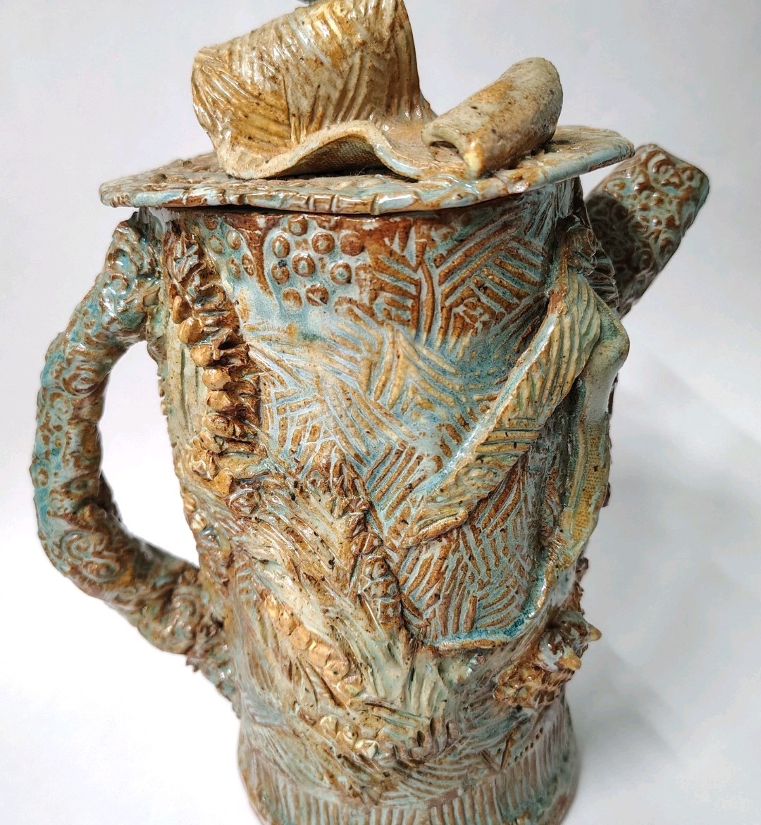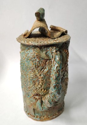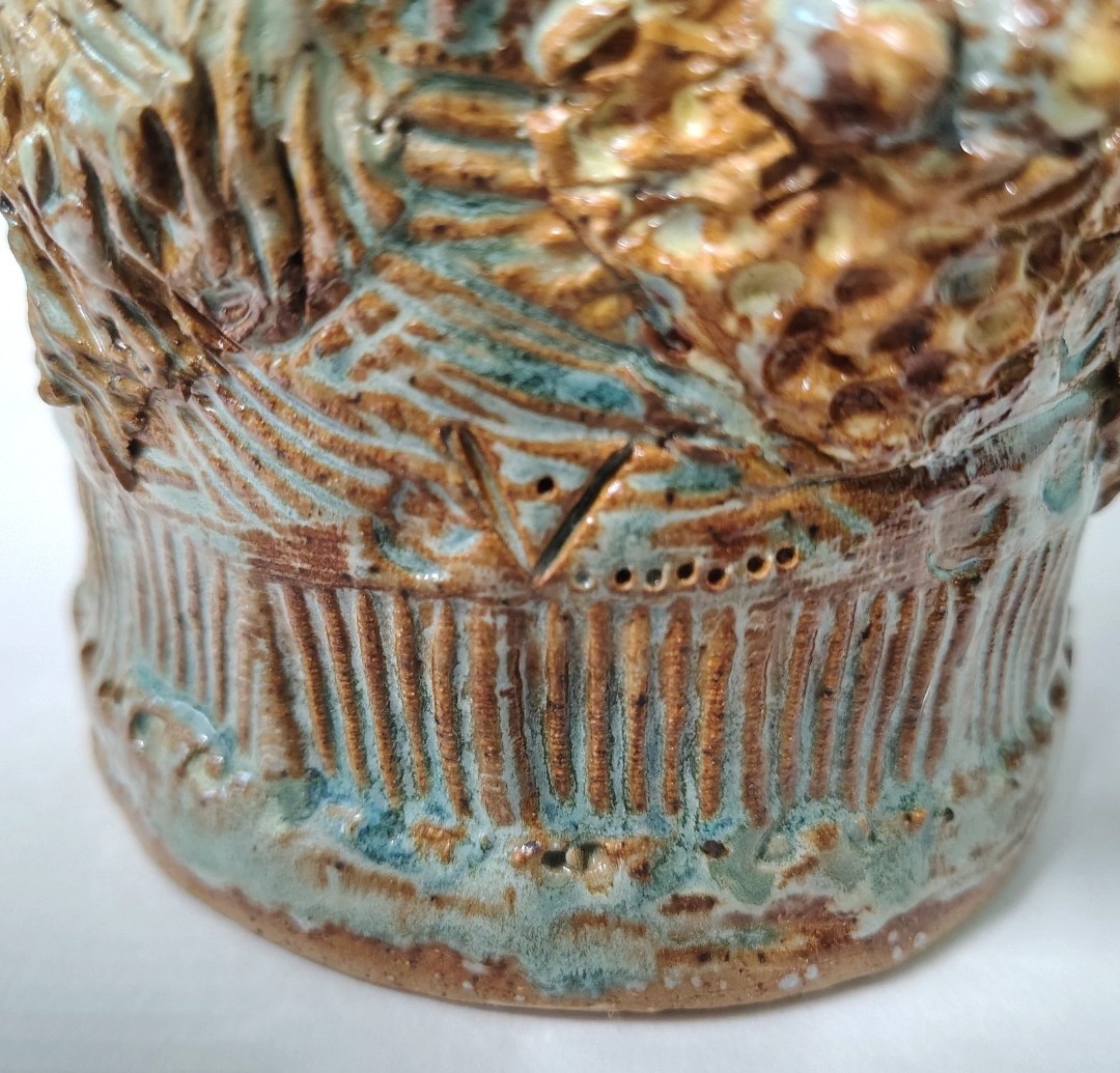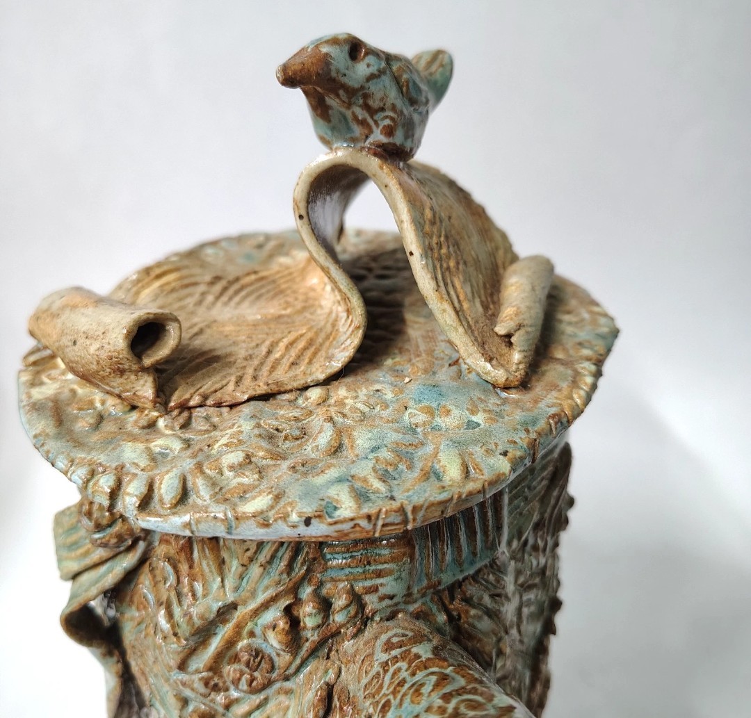 This is a quirky whimsical Brutalist Style OOAK piece by artist Sharon Vinciguerra sculpted with paper & clay it features BIRDS on handle and bird nest with babies on body, her work was all handcrafted and not duplicated
