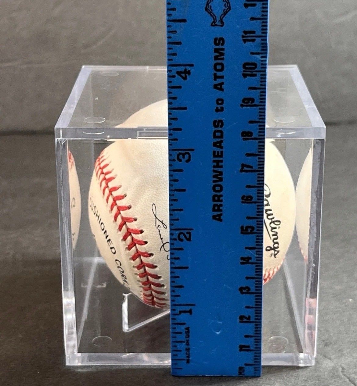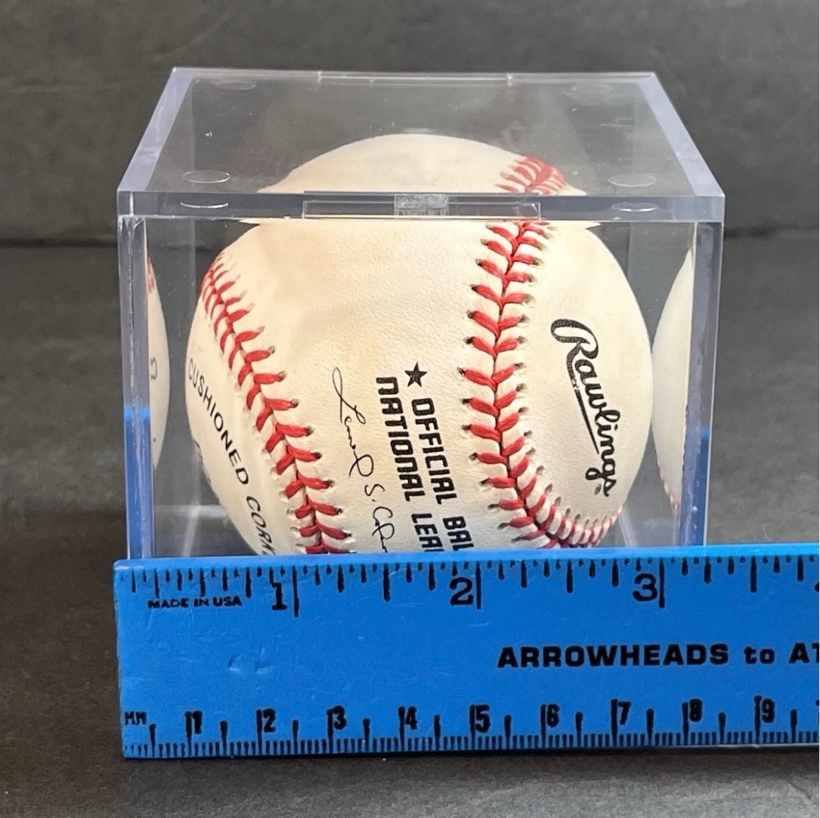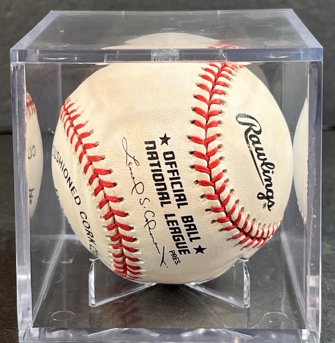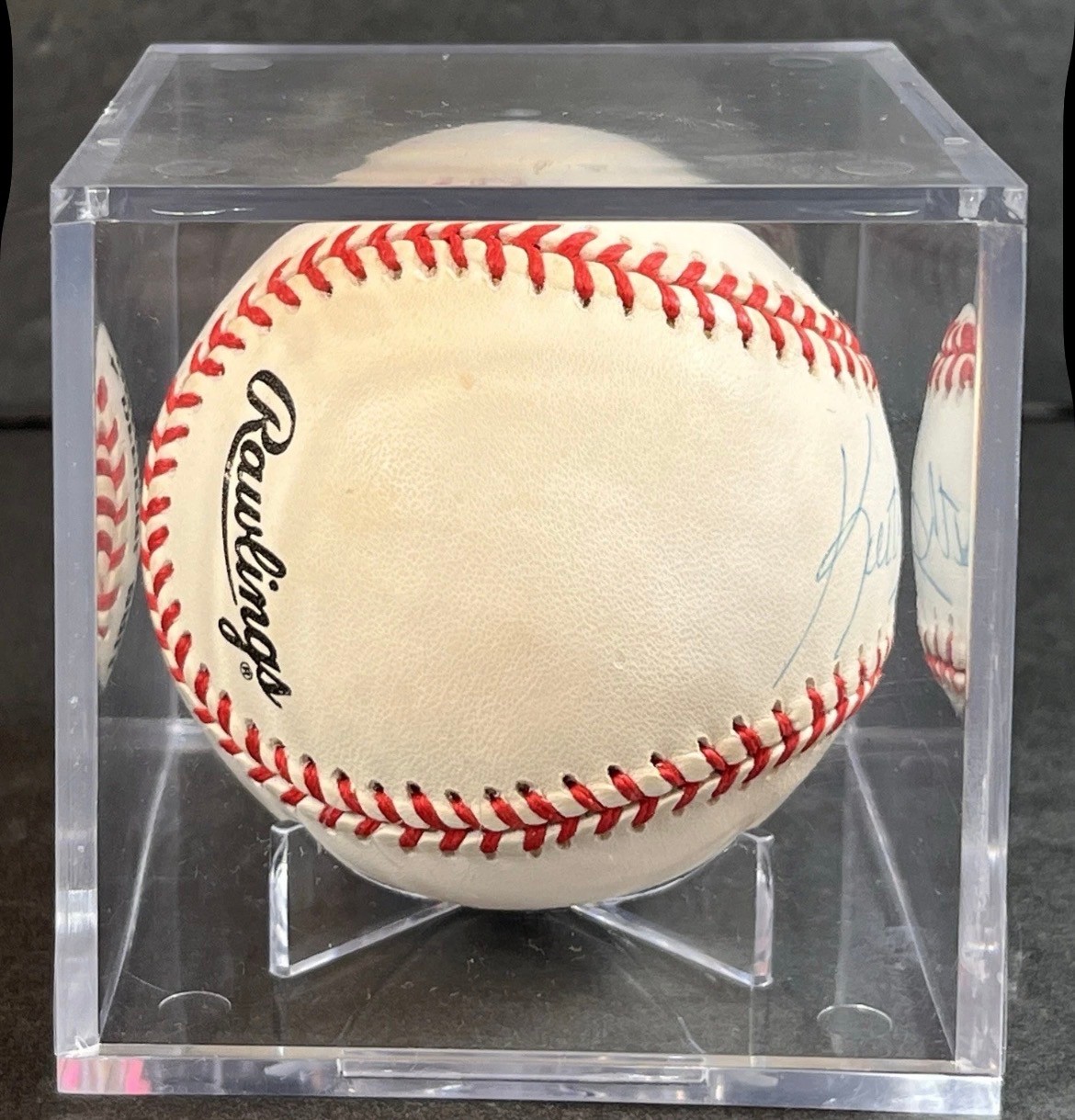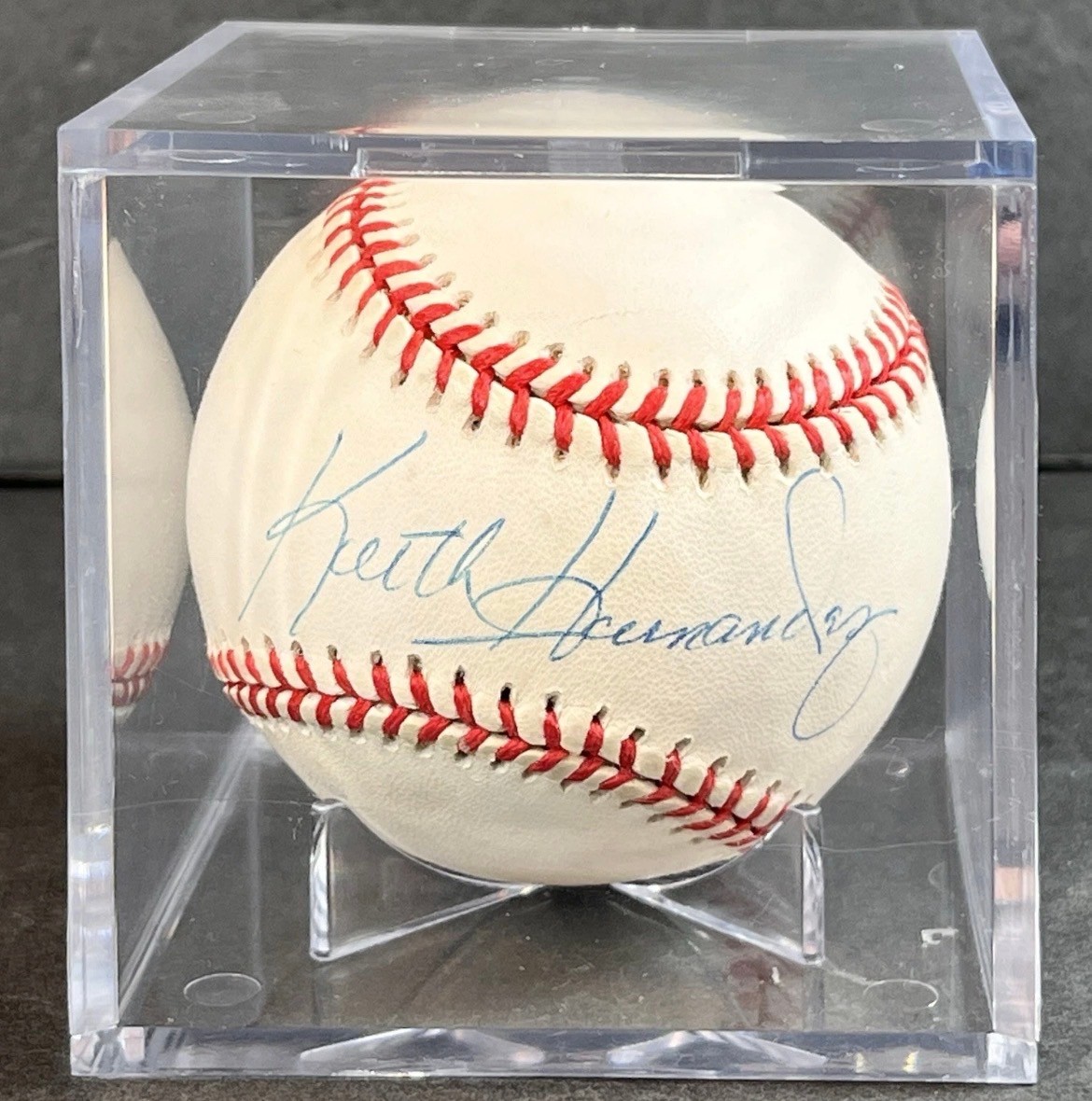 This baseball is signed by Keith Hernandez. It is in very good condition. The baseball comes inside of a plastic, clear cube display case. There are some minor scratches throughout the case. The box measures about 3.3” on each side of each cube face. See pictures for details. This can be shipped and combined with others.