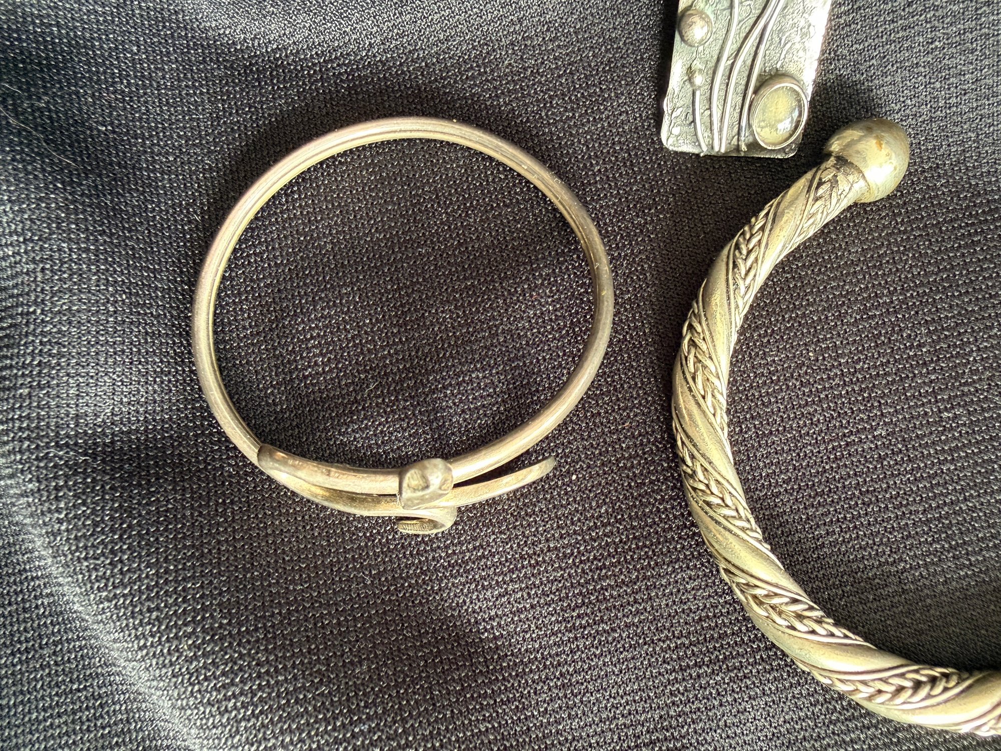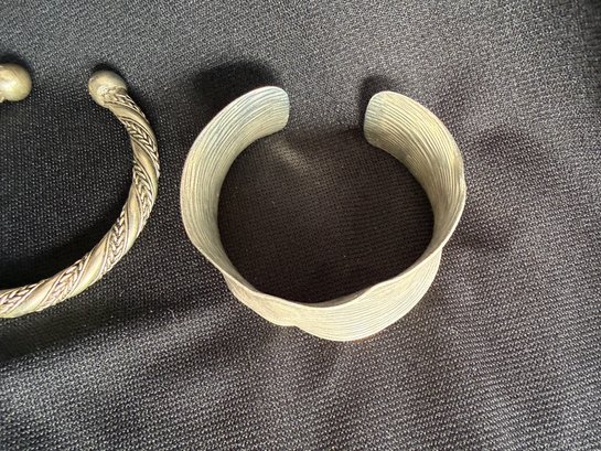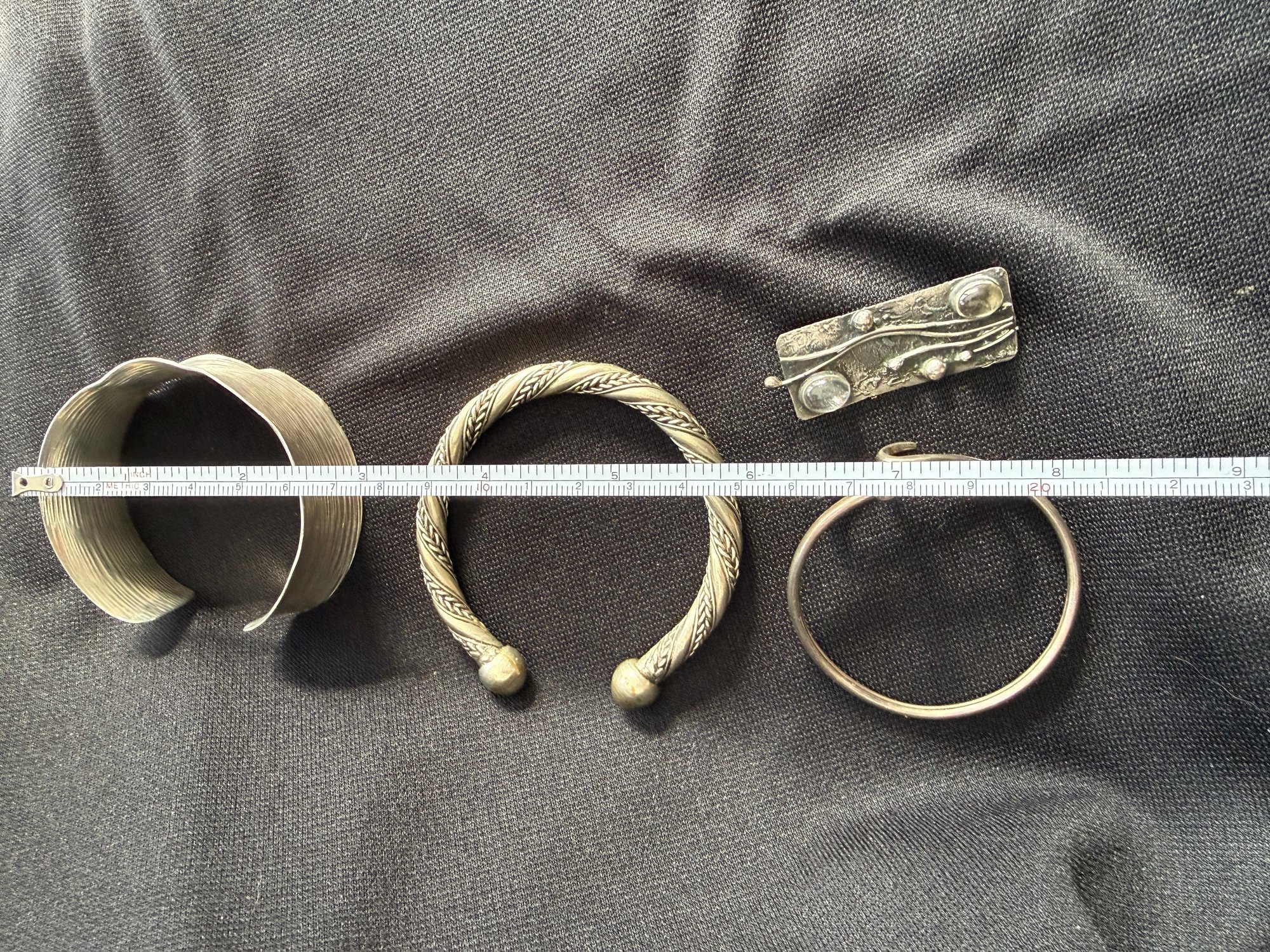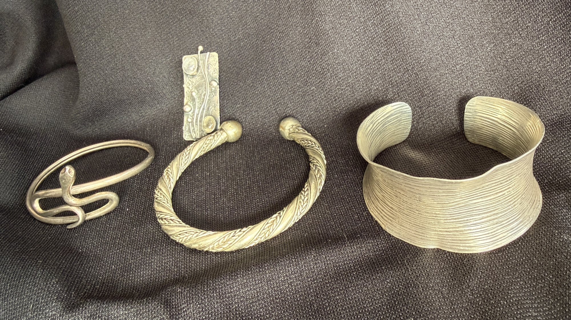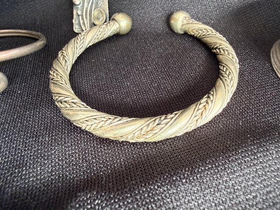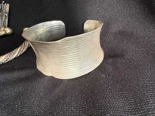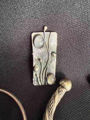 Grouping of three silver tone bracelets and one modernist brooch.