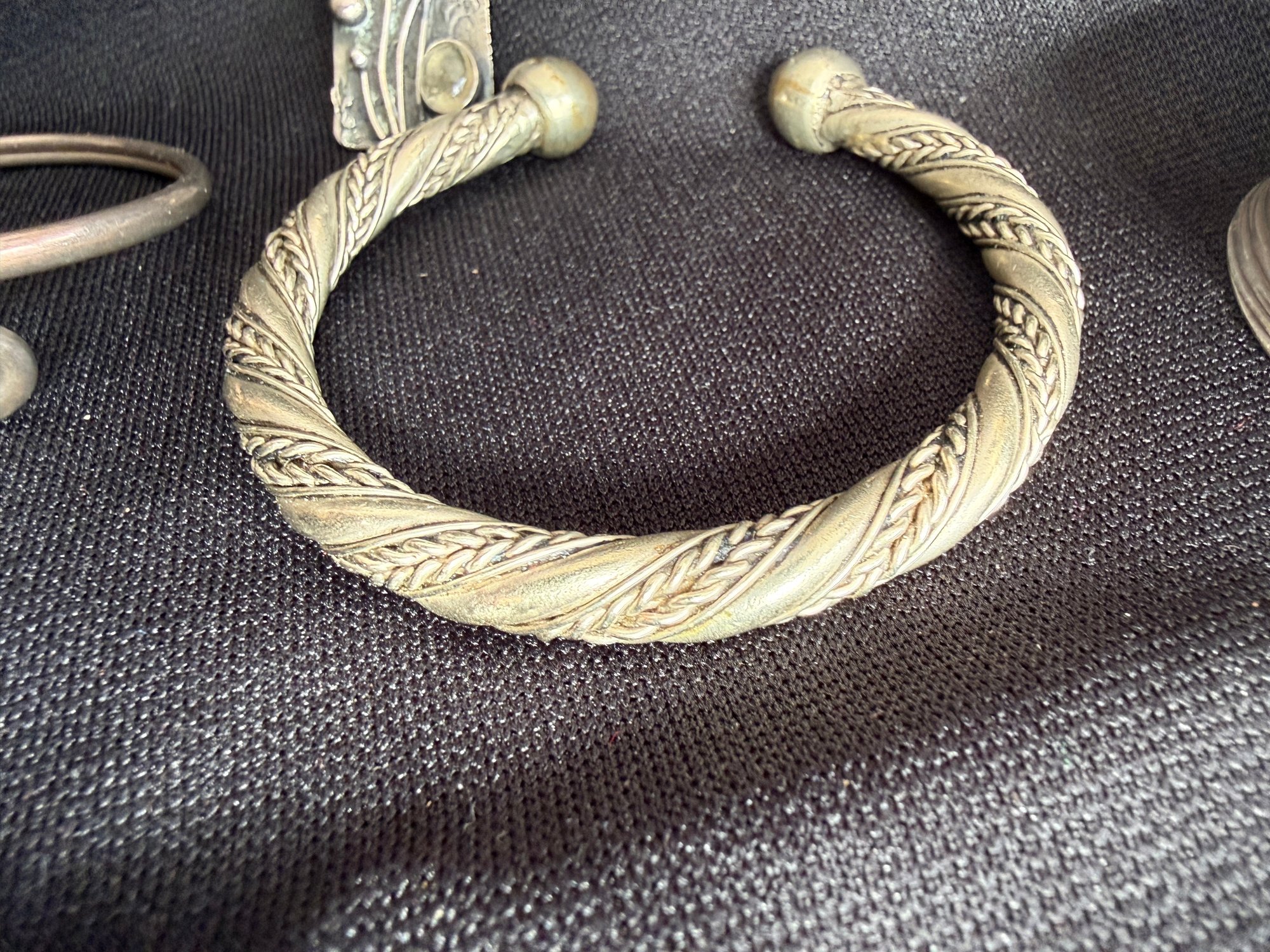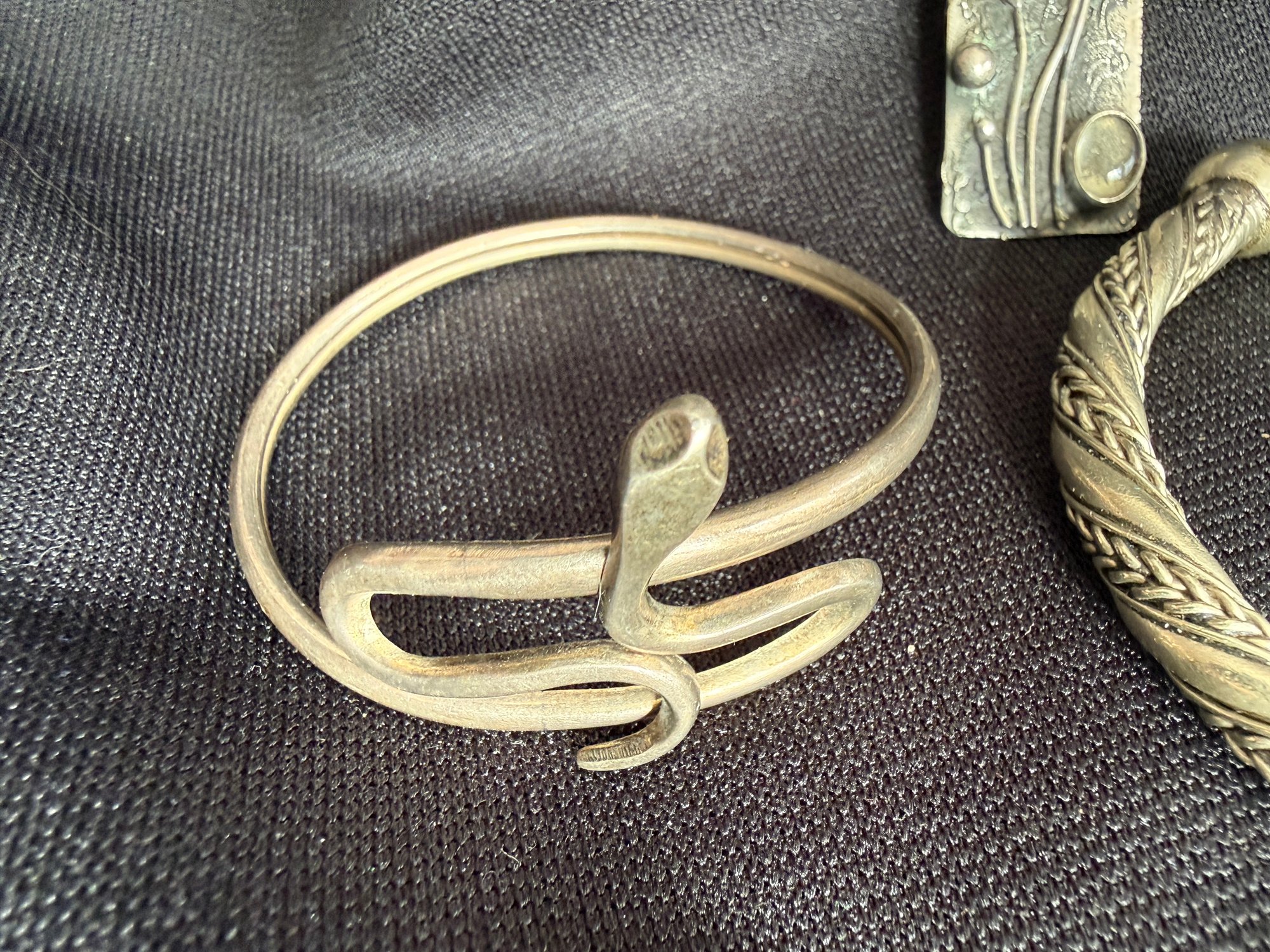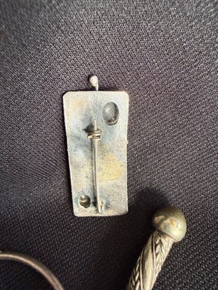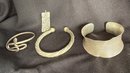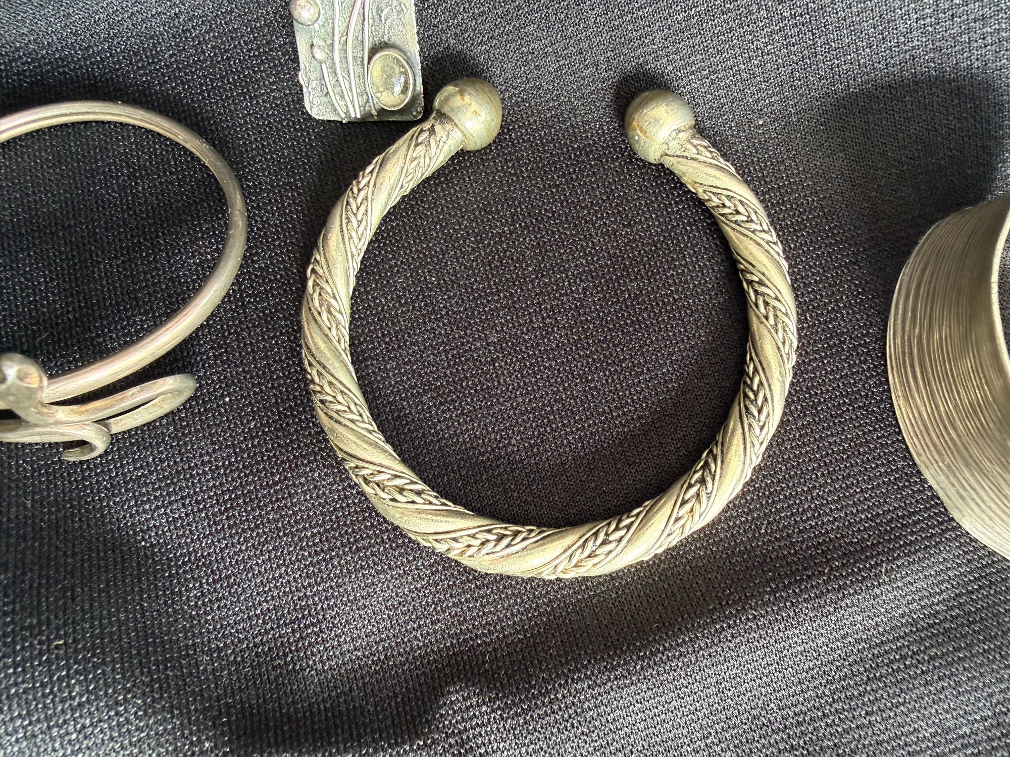 Grouping of three silver tone bracelets and one modernist brooch.