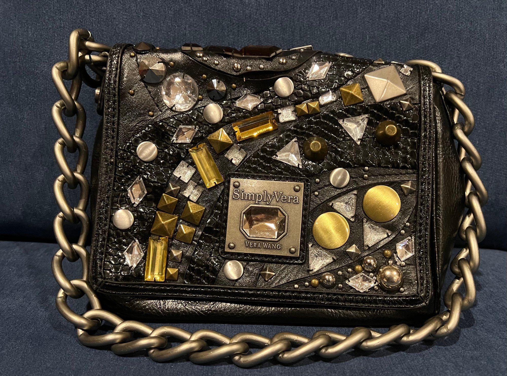 Used Simply Vera Jewel Studded Bag With Chain Link Strap. Snap closure, inside zip pockets and three others.