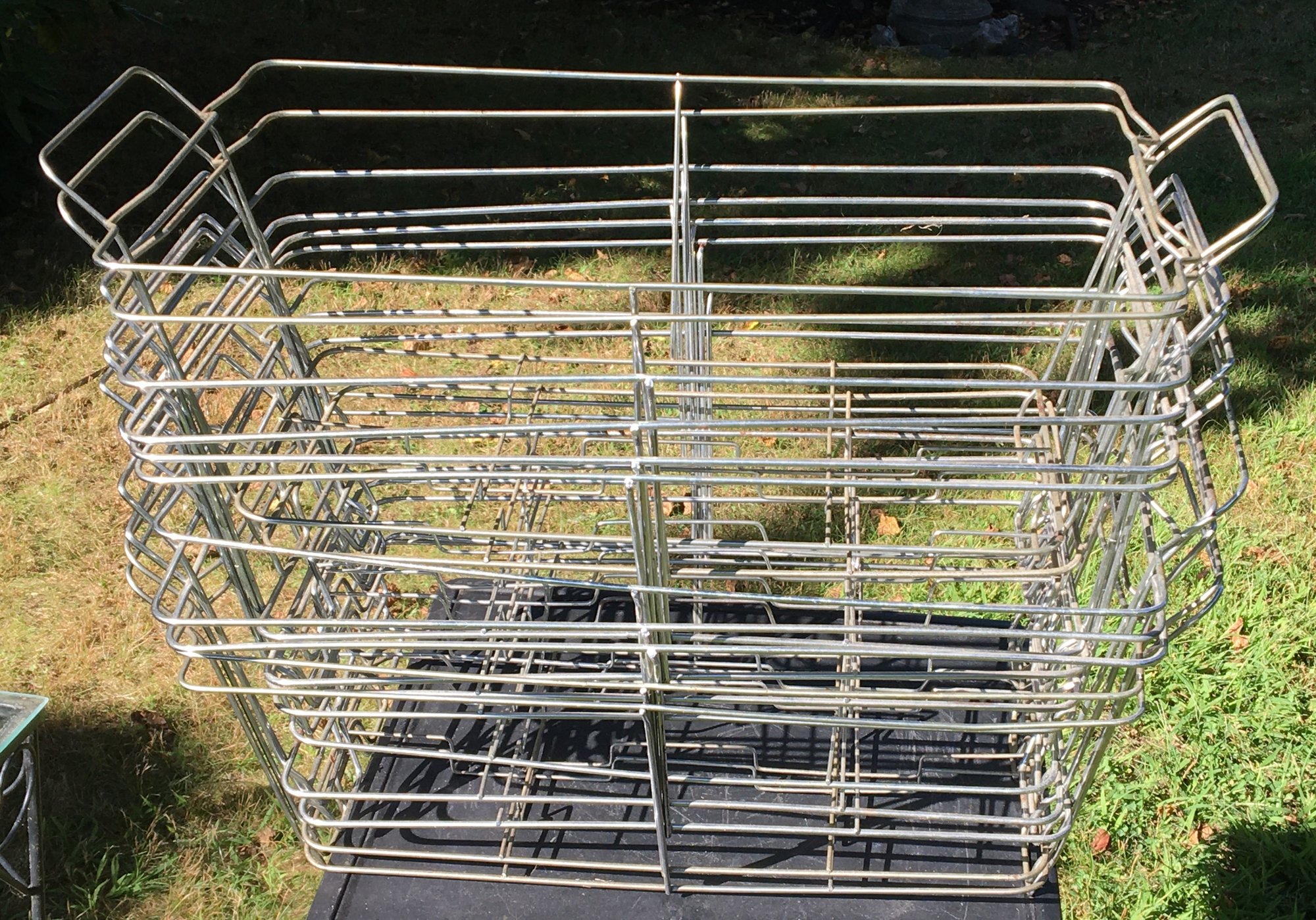Stack of 21 Food Catering Tray Carrying Frames in clean Estate found condition. - These are for the big Foil or metal Catering Food Pans but can be used for a lot of things, including storage, clothing, etc. I used some of them to hold a Milk Bottle Collection. - See photos for size and overall condition.