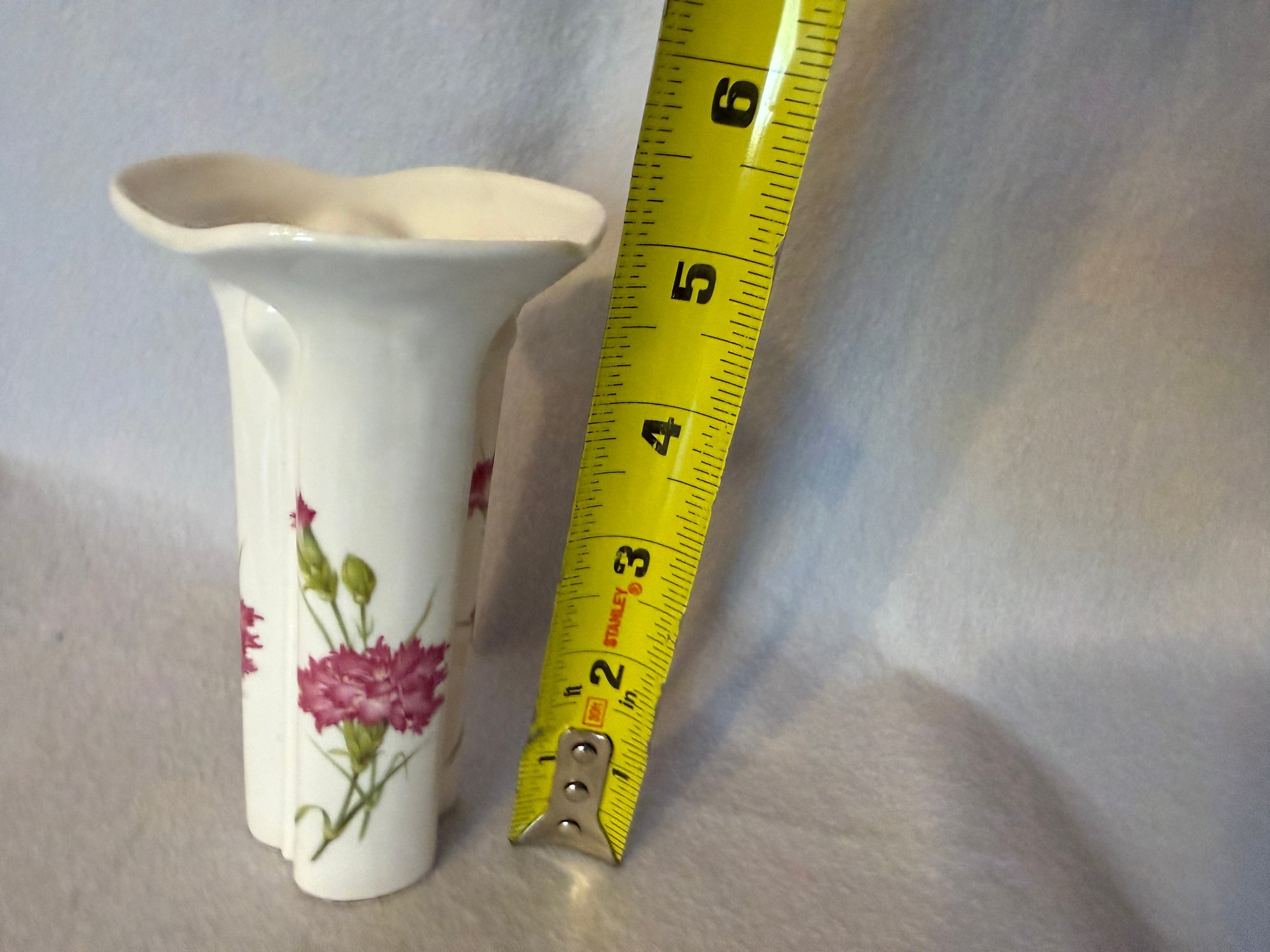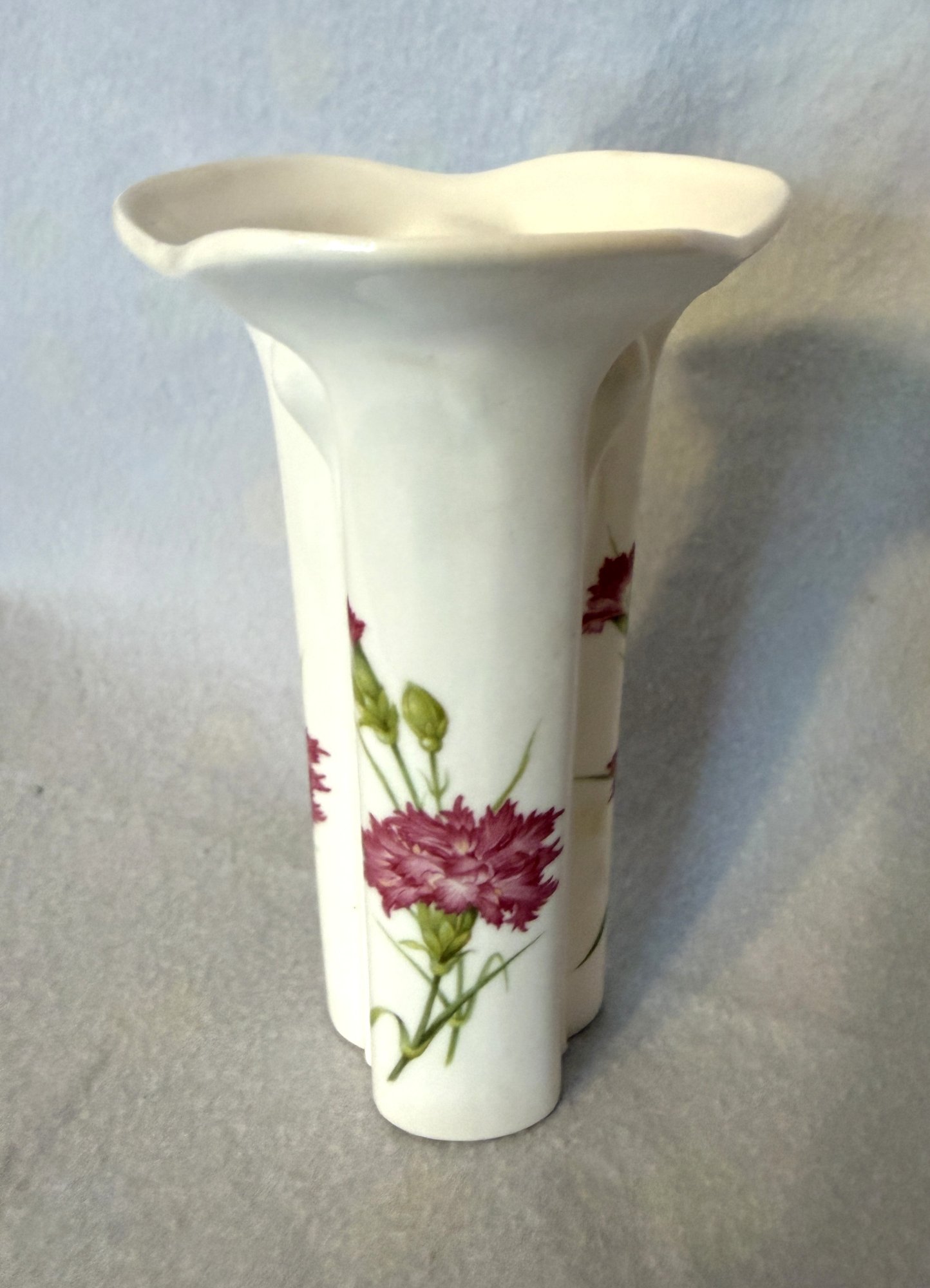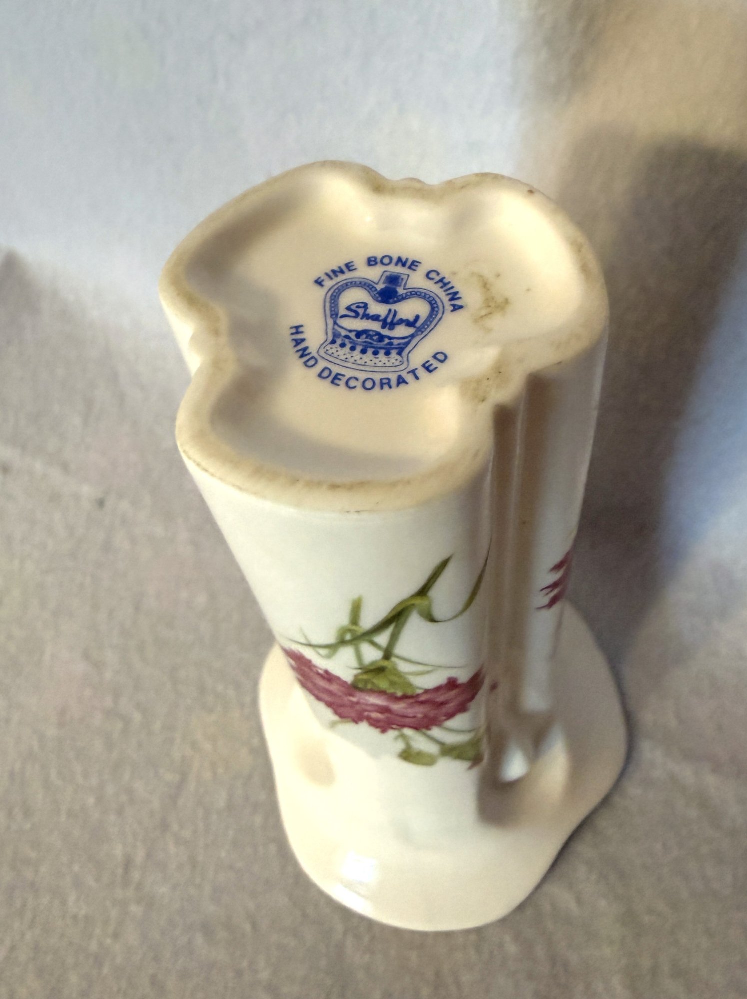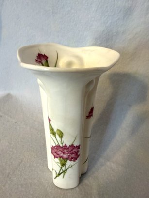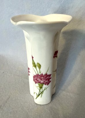 Lovely English made Stafford fine bone china bud vase with a cheerful pink carnation design.