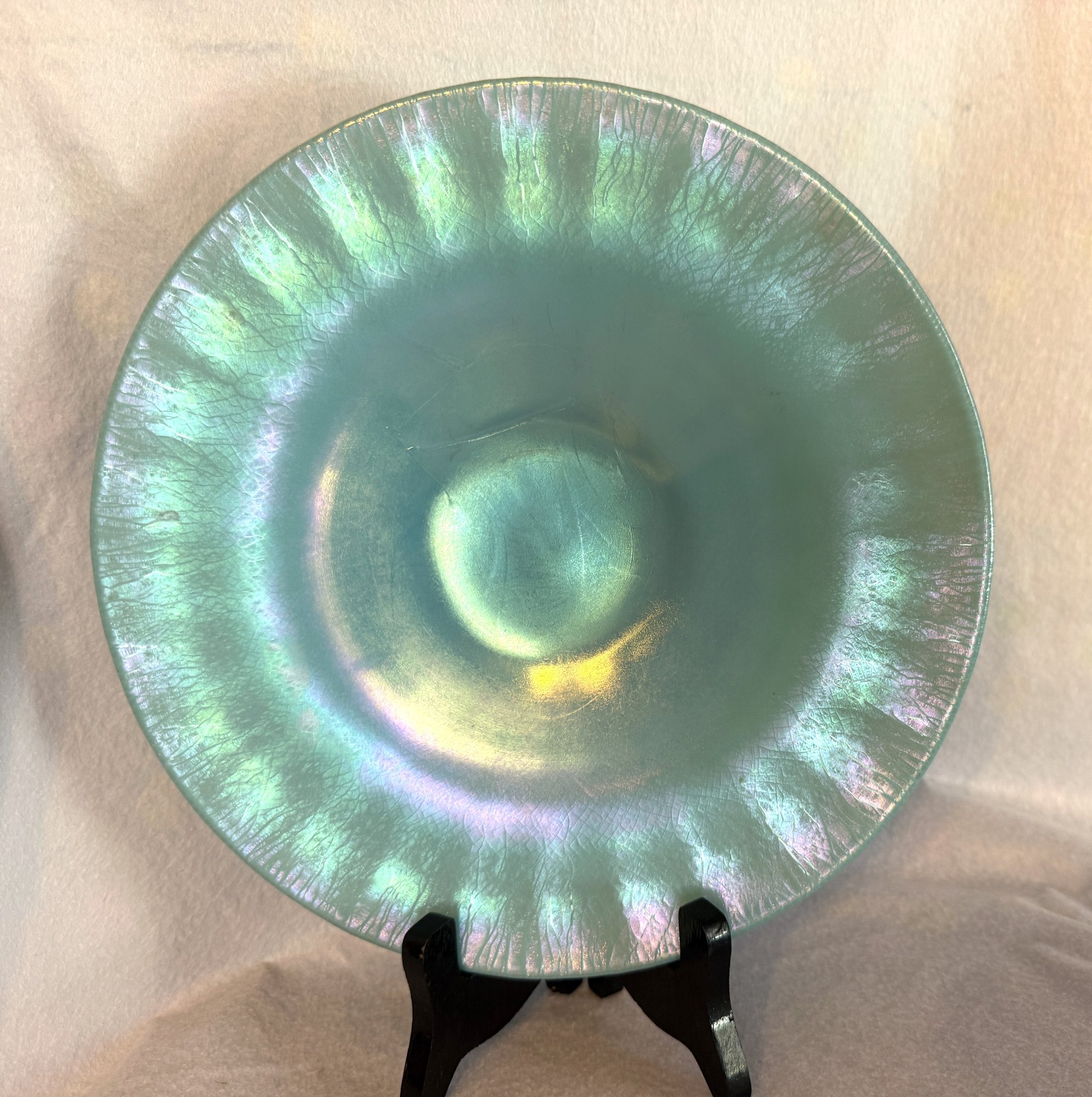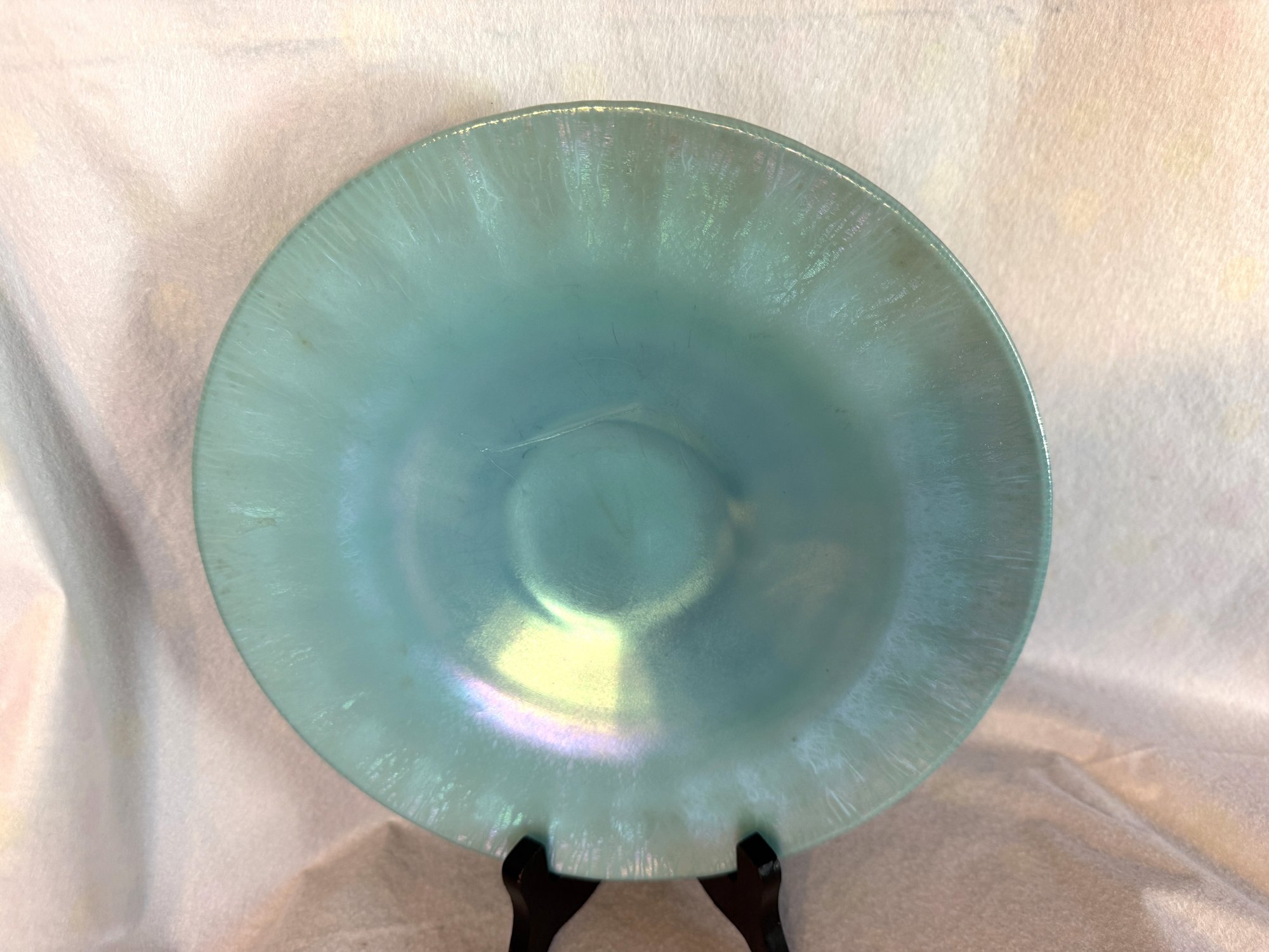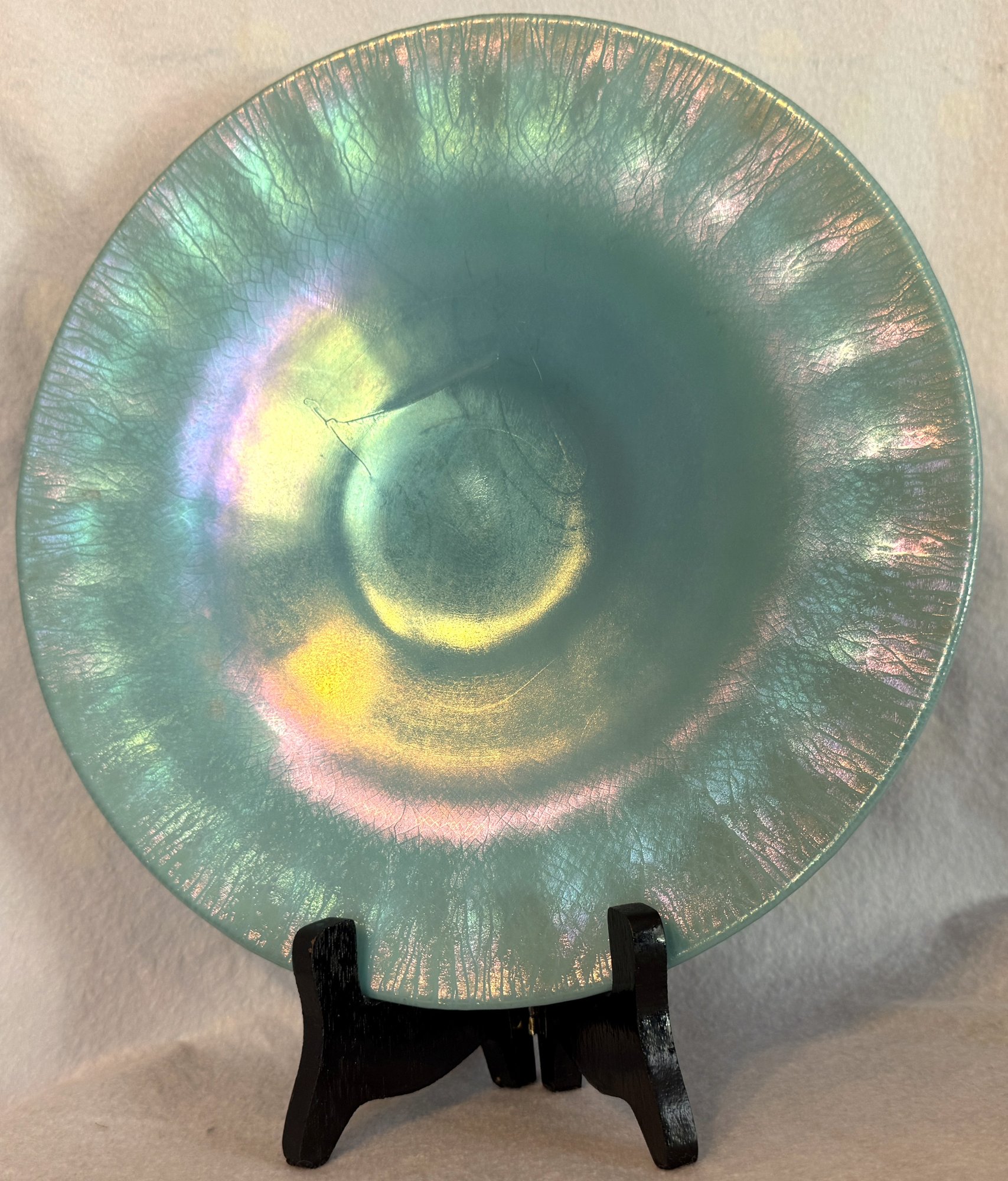 Absolutely stunning light blue iridescent art glass shallow bowl or platter. Has striking tones of opalescent purple, blue, pink, green and silver depending how the light hits it.