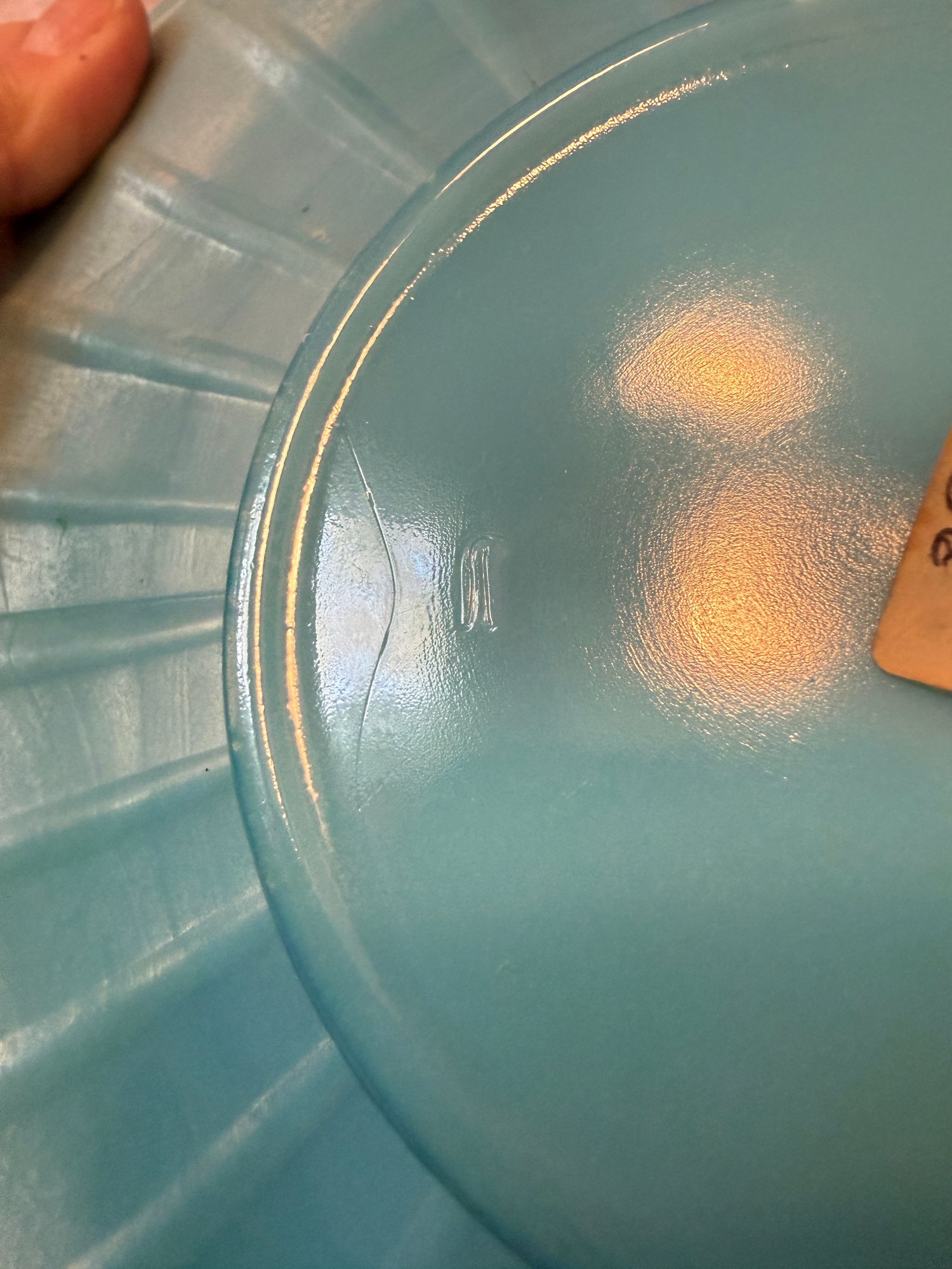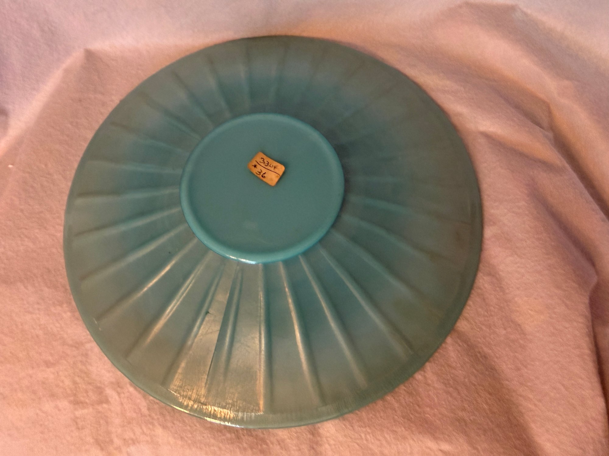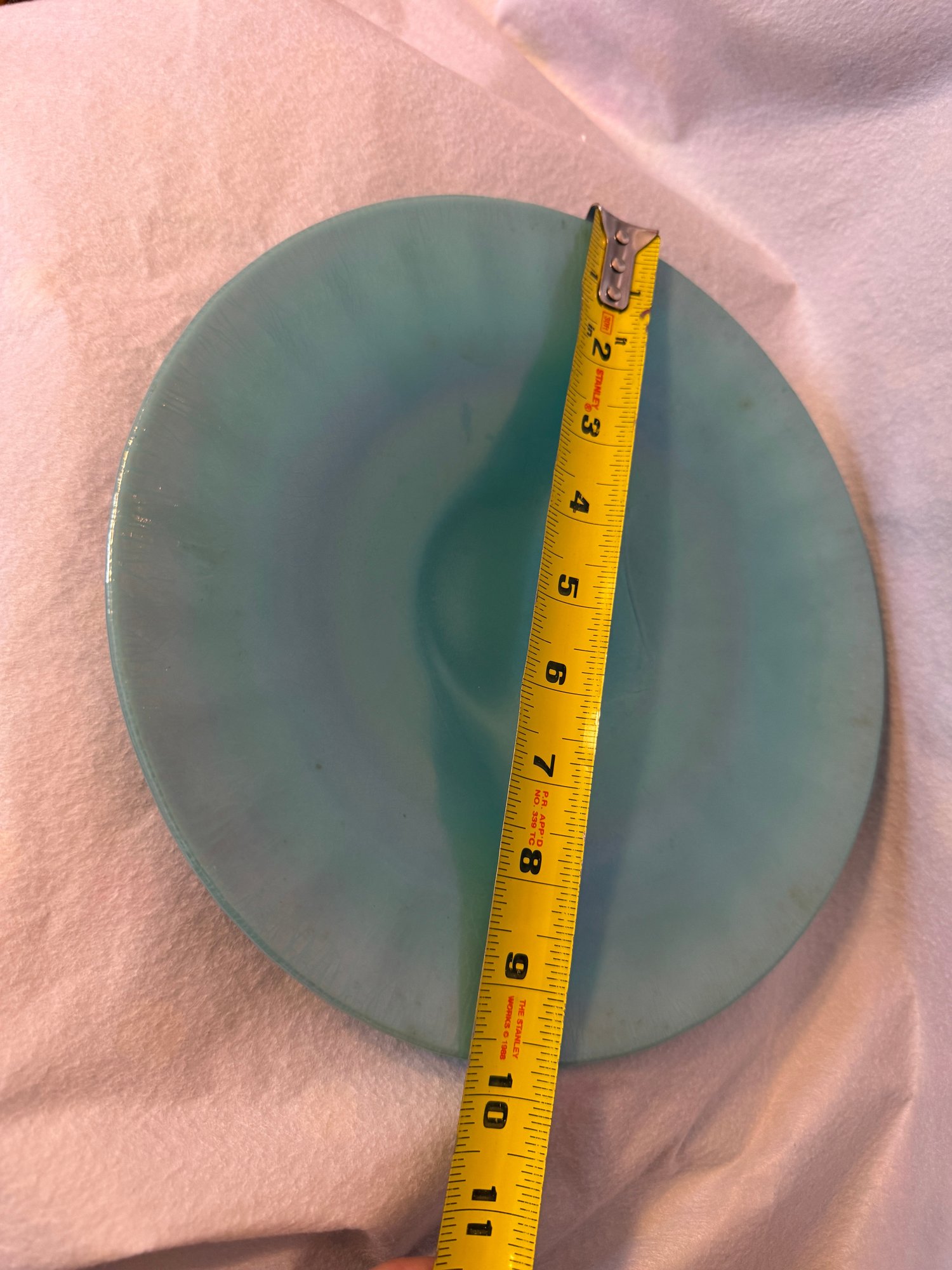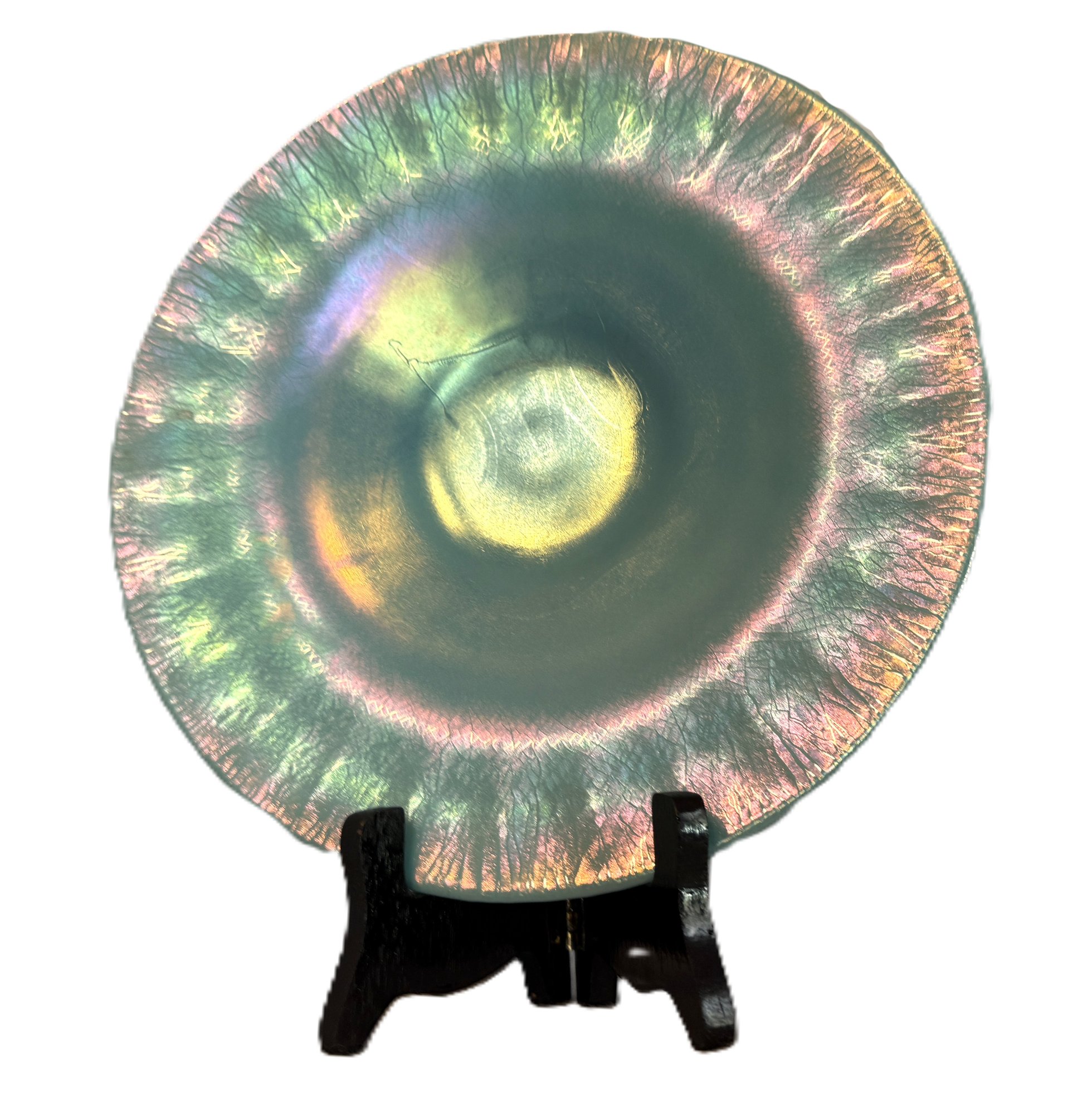 Absolutely stunning light blue iridescent art glass shallow bowl or platter. Has striking tones of opalescent purple, blue, pink, green and silver depending how the light hits it.