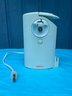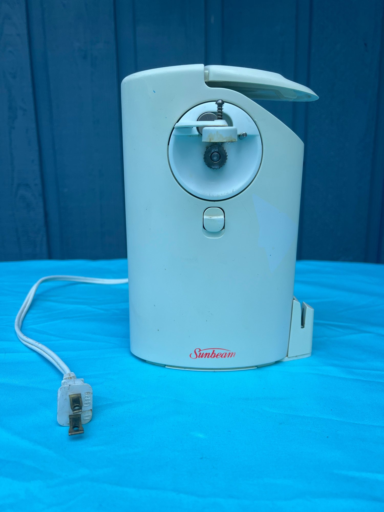 Sunbeam Can Opener, Pop And Knife Sharpener. Stands about 8” tall on the counter. In working condition.