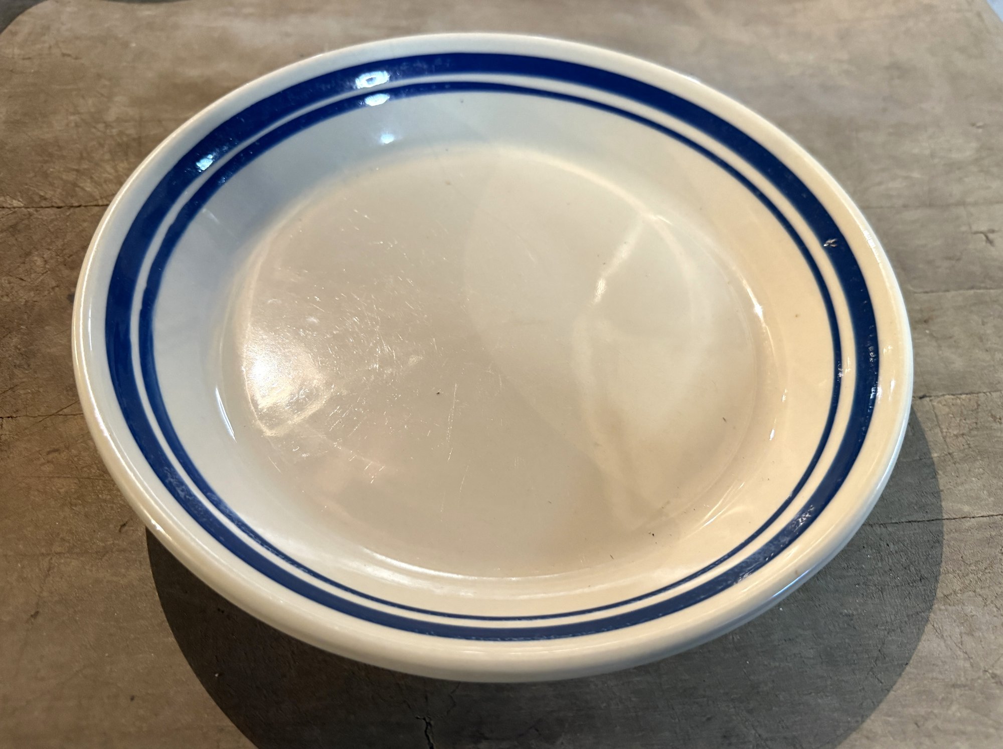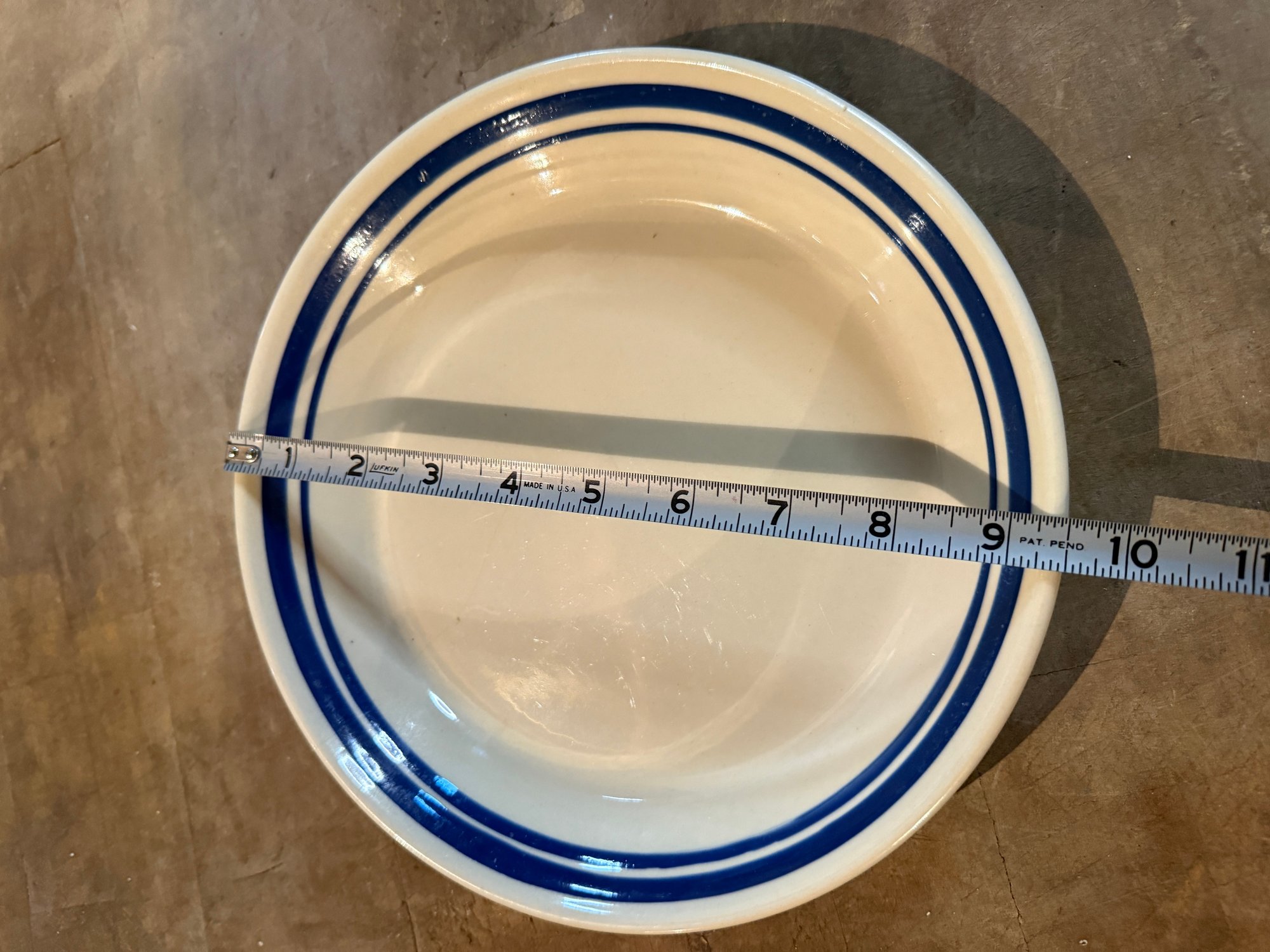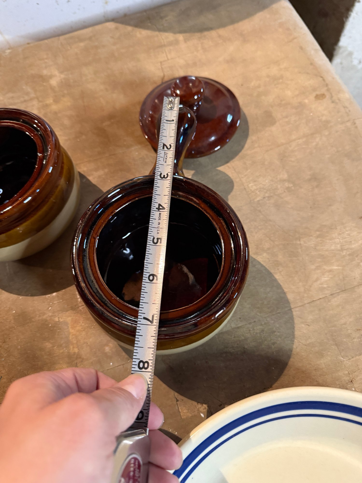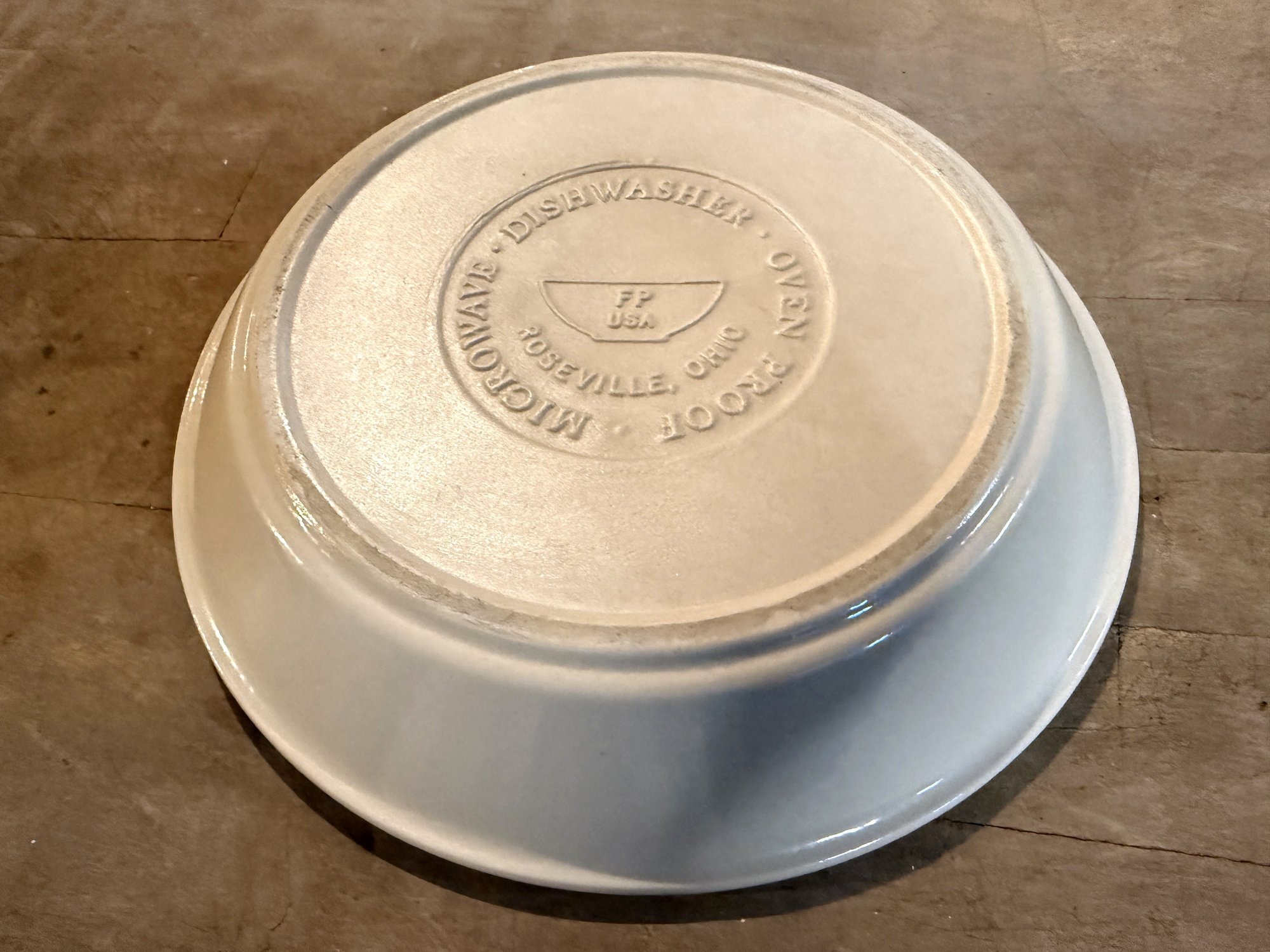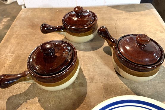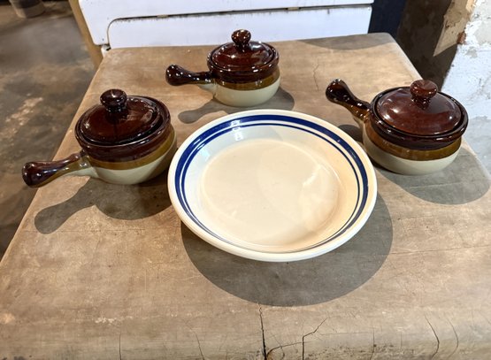 Nice grouping of quality crock-ware including three lidded baked bean pots (also fantastic for French onion soup!) and one classic country blue and white pie dish by Roseville Potteries of Ohio.