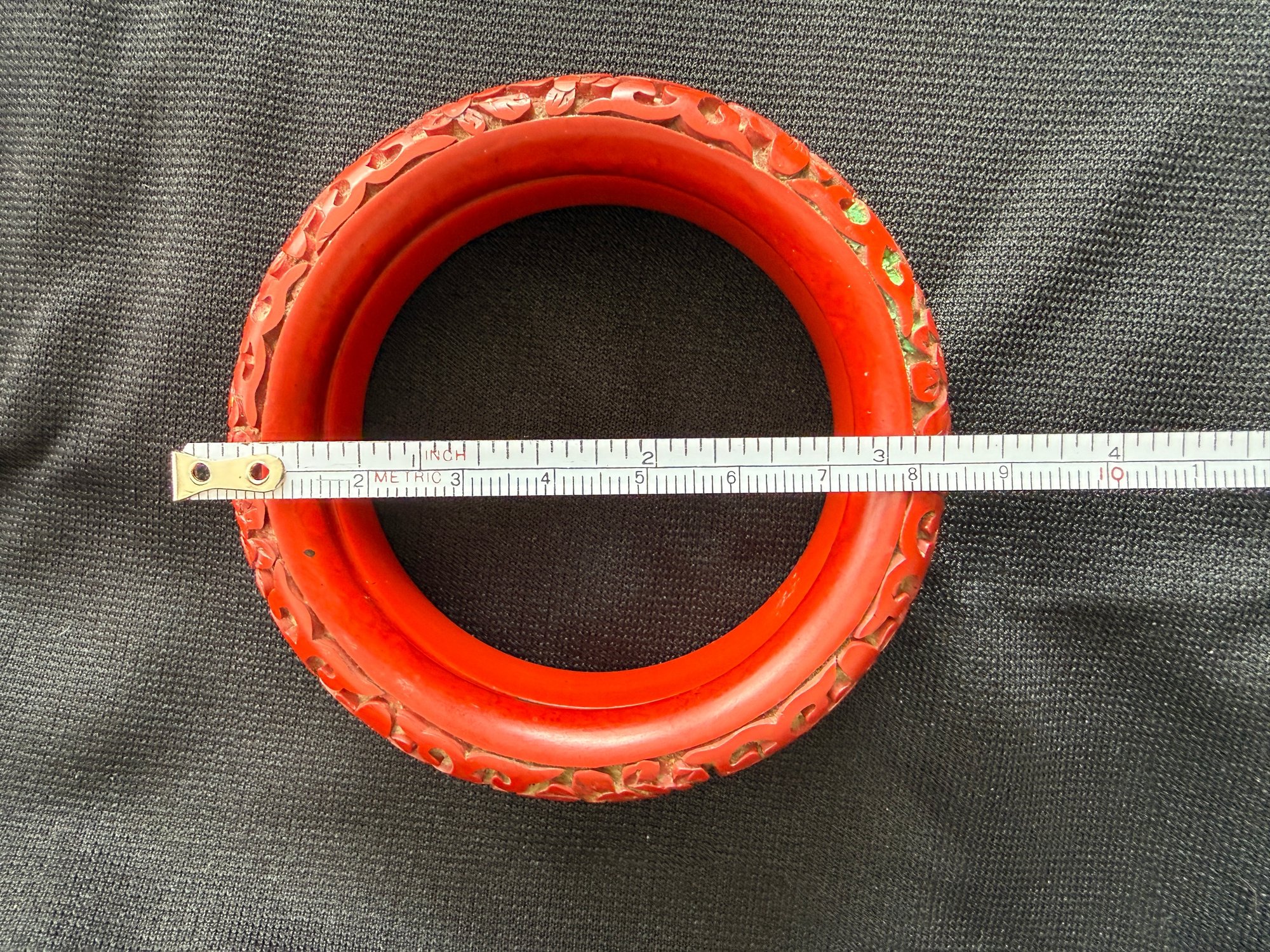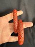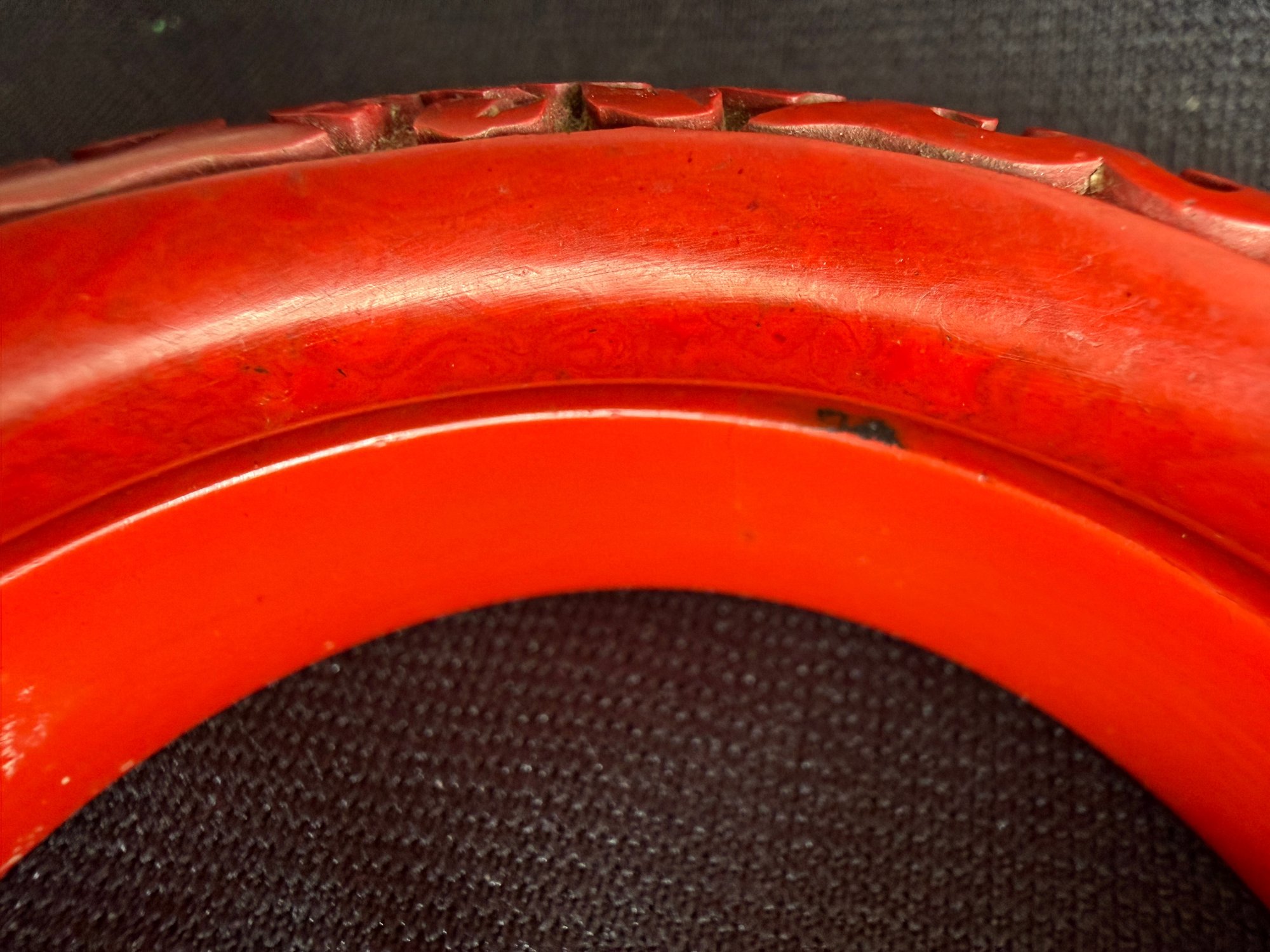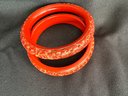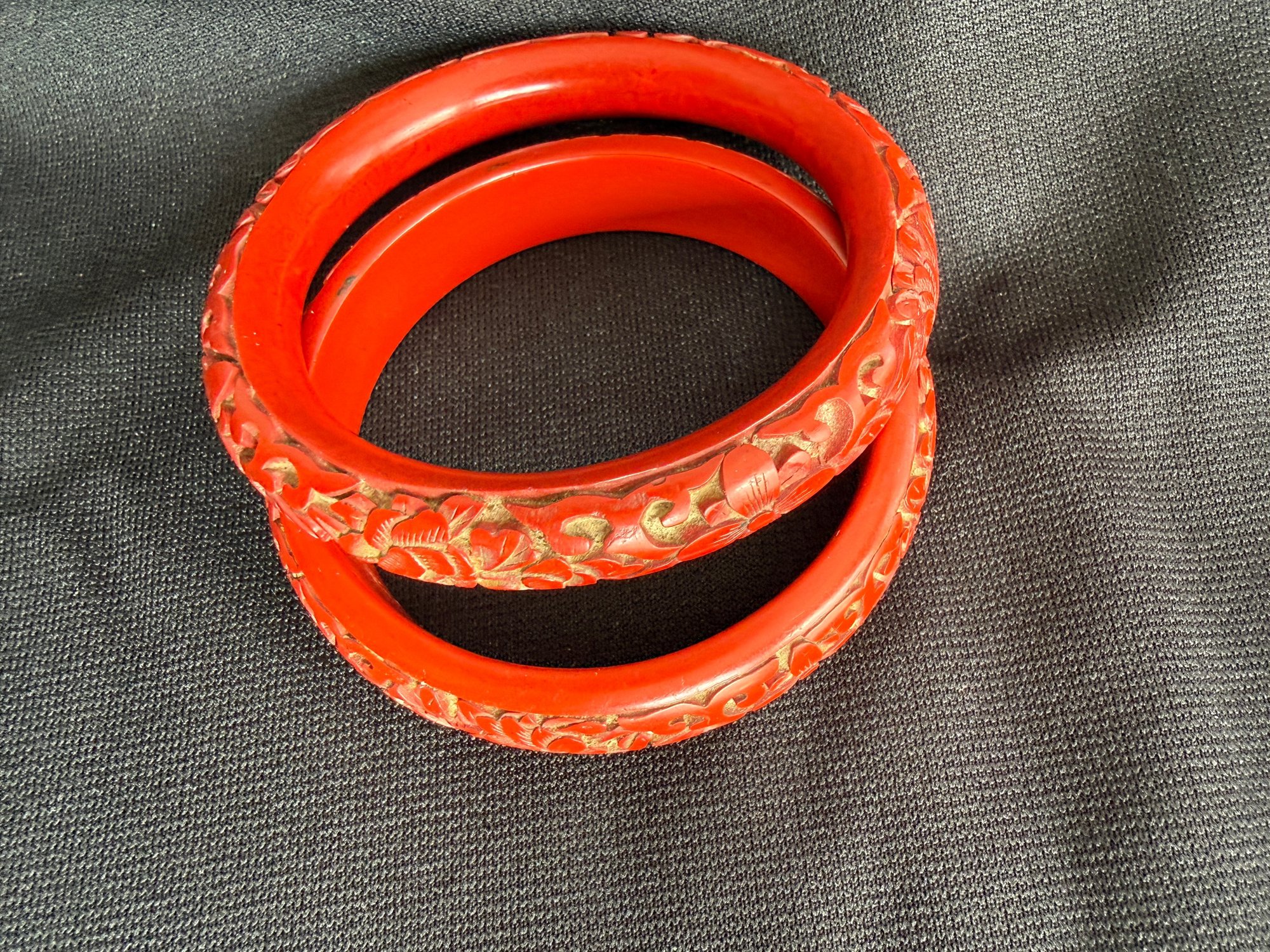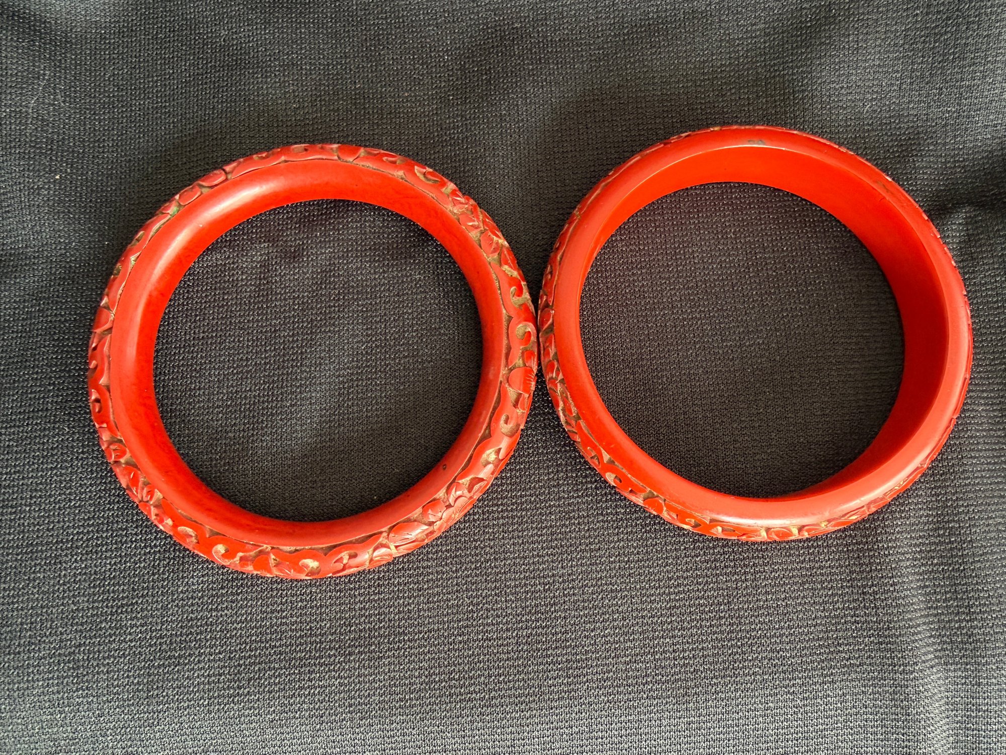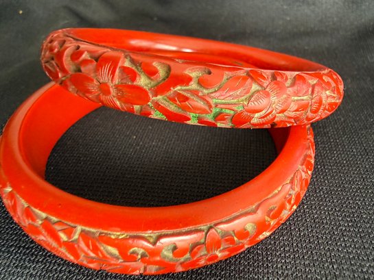 Two slightly different but compatible vintage cinnabar bangles, one with a more rounded form, the other flatter around the inside.