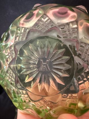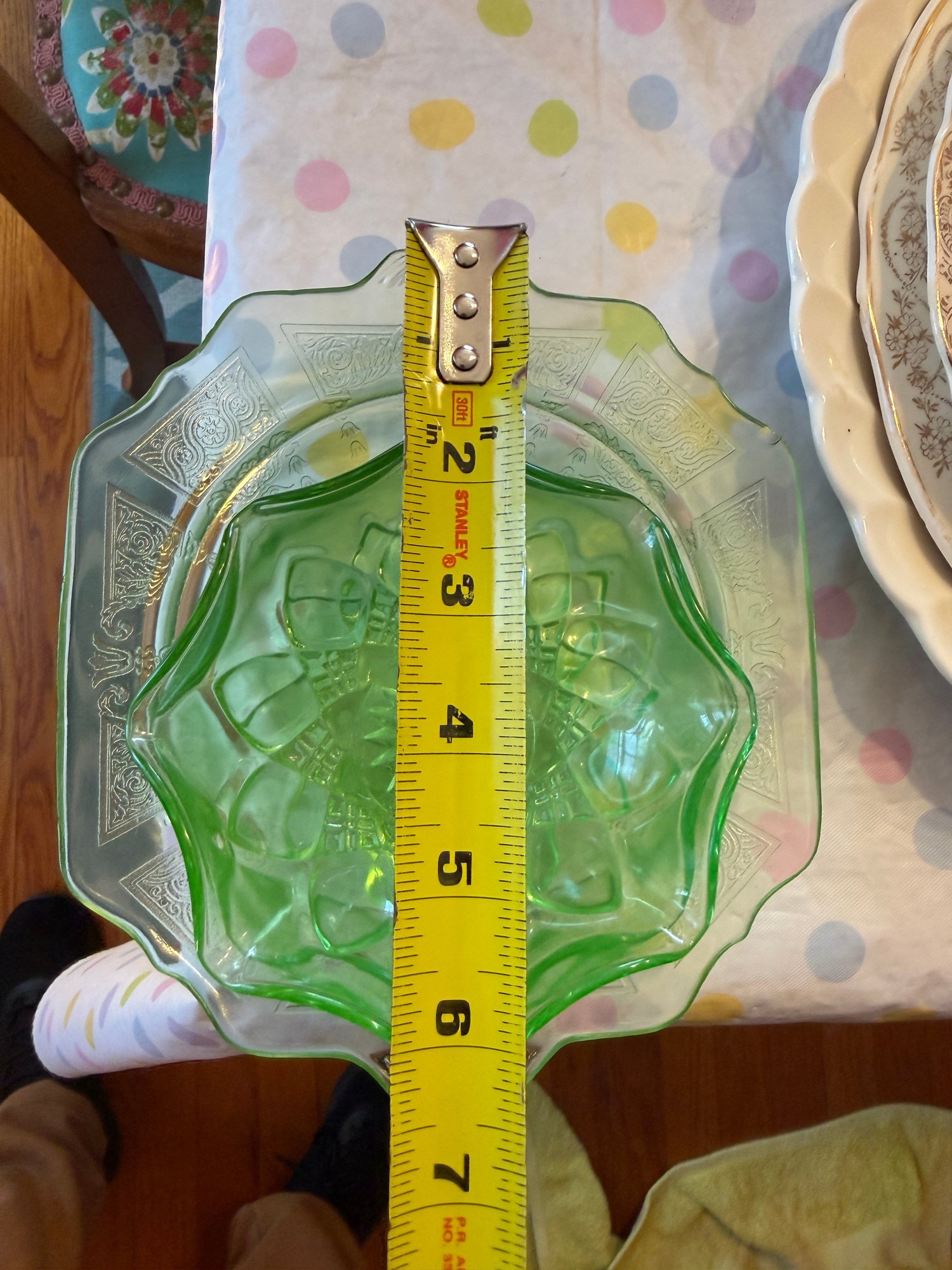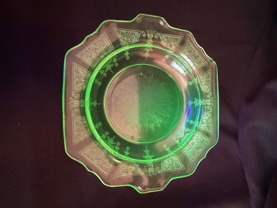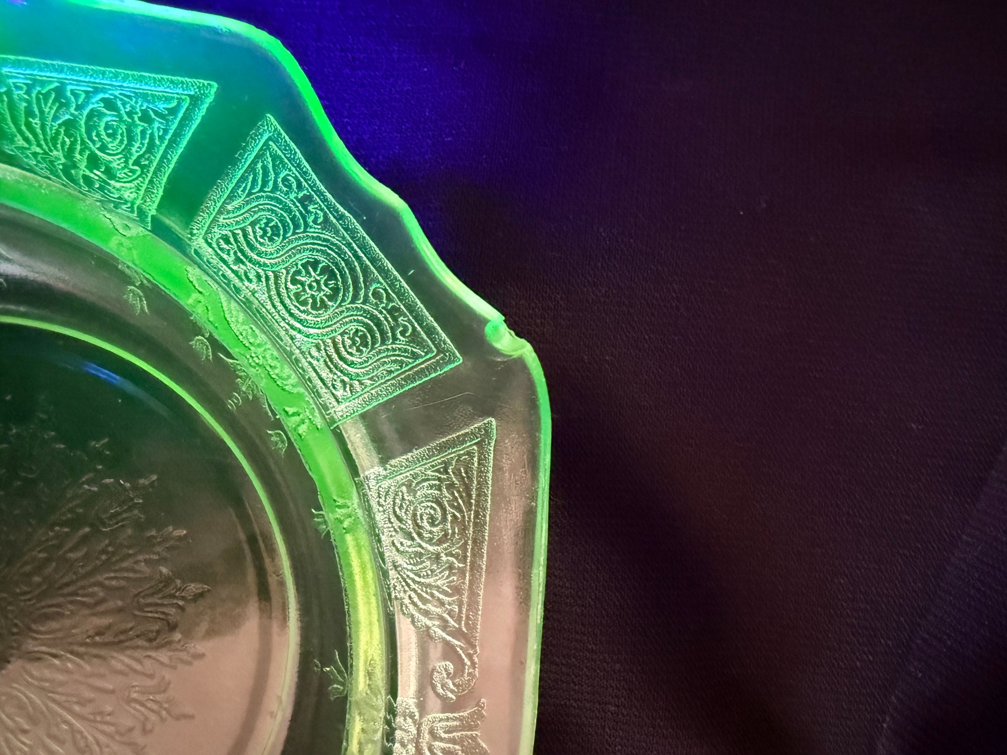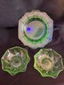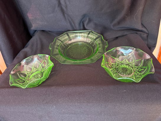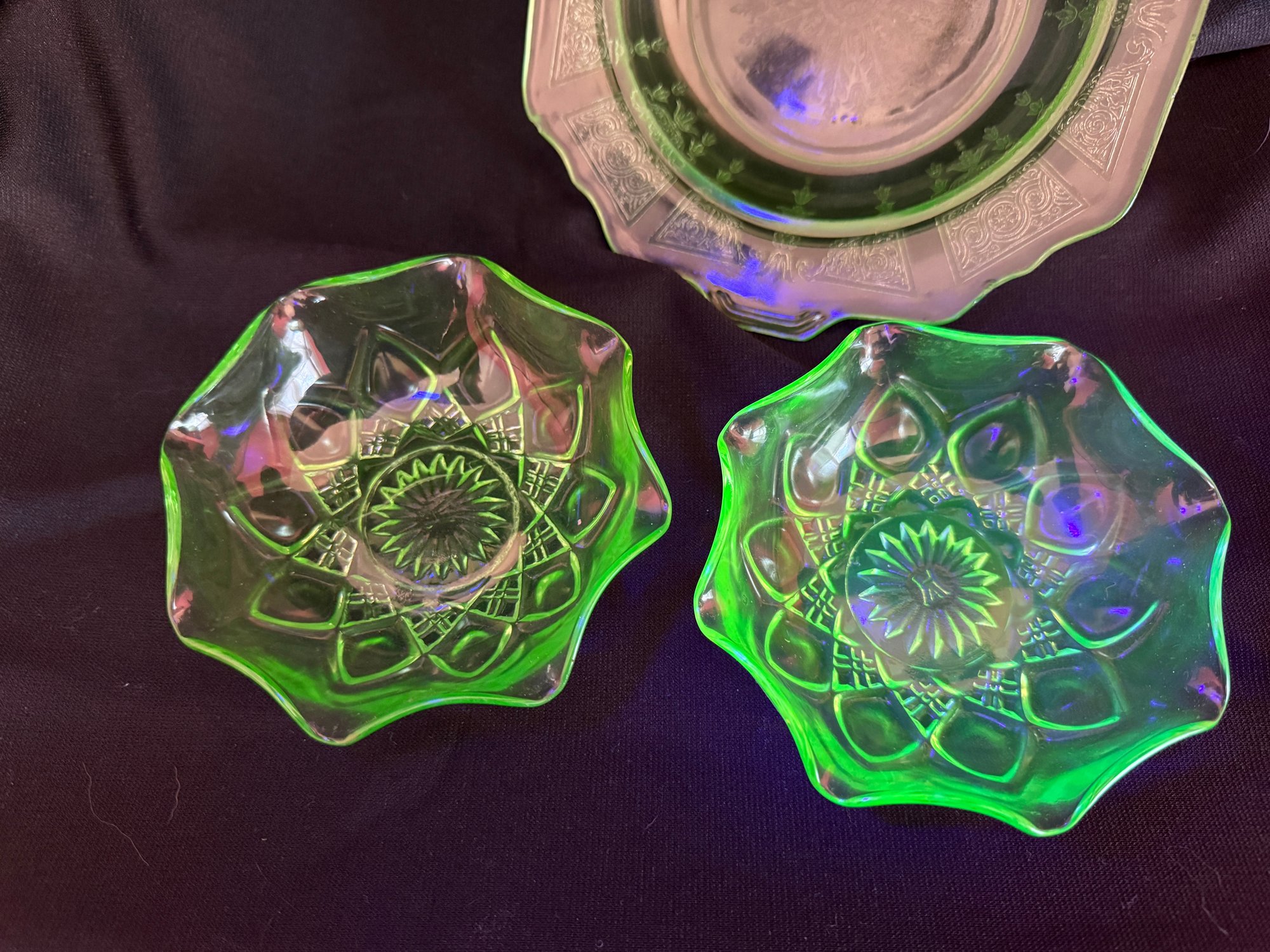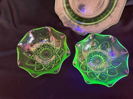 Trio of uranium green glass dishes including one pair of pinched ruffle edge Hazel-Atlas Diamond Arches pattern uranium glass bowls and a Anchor Hocking Princess pattern plate. The photos were primarily taken under a black light mini flashlight, the last group photo shows them in natural lighting.