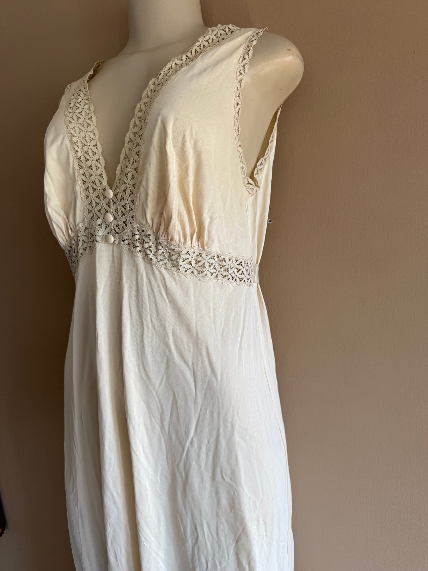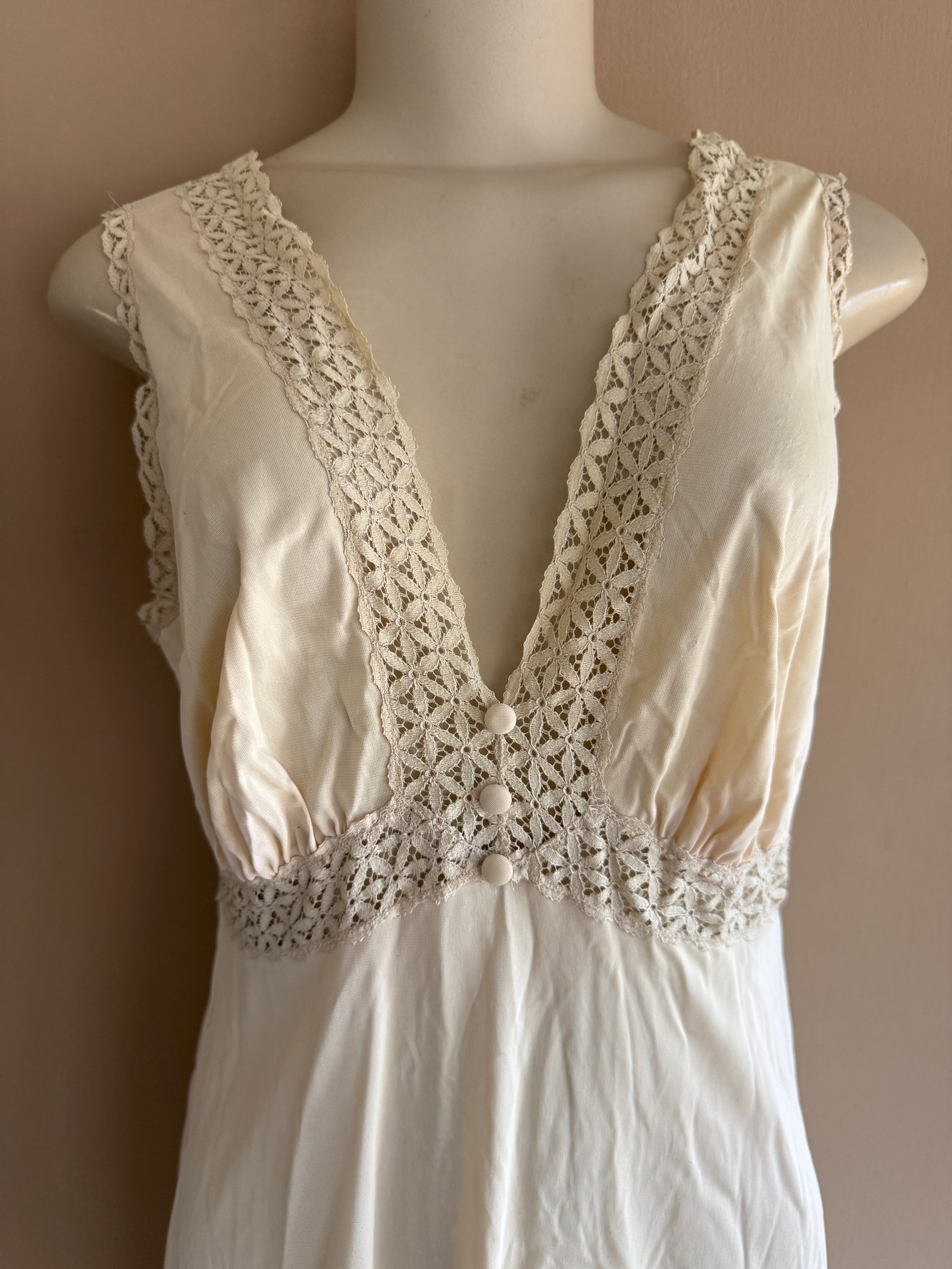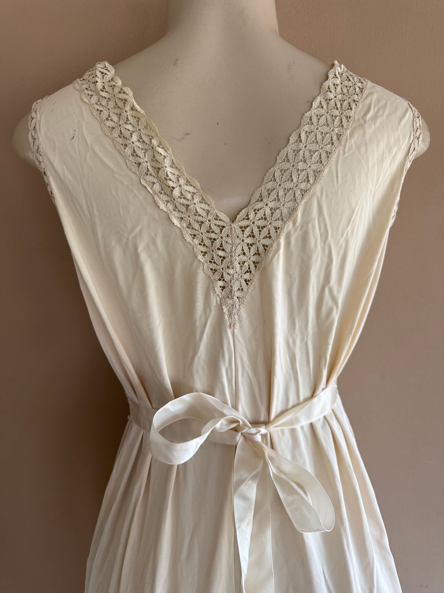 Vintage 1960s Vanity Fair brand nightgown with sweet floral crochet detail at the bust and bow that ties at the back.