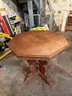 Impressive antique Victorian Eastlake style table featuring an octagonal top with book-matched burl (walnut?) veneer and an ornate four-part base with jig-sawed details.