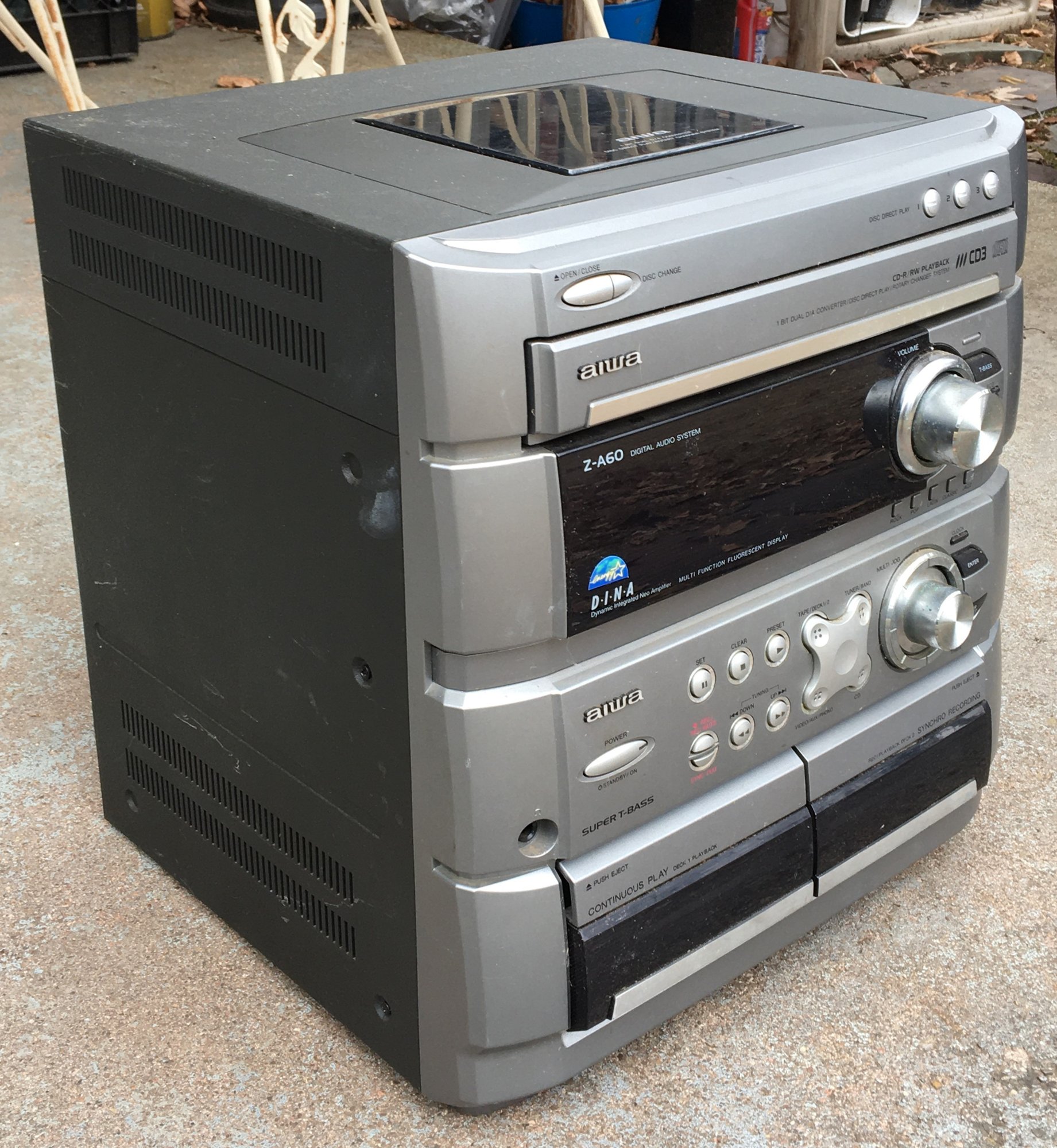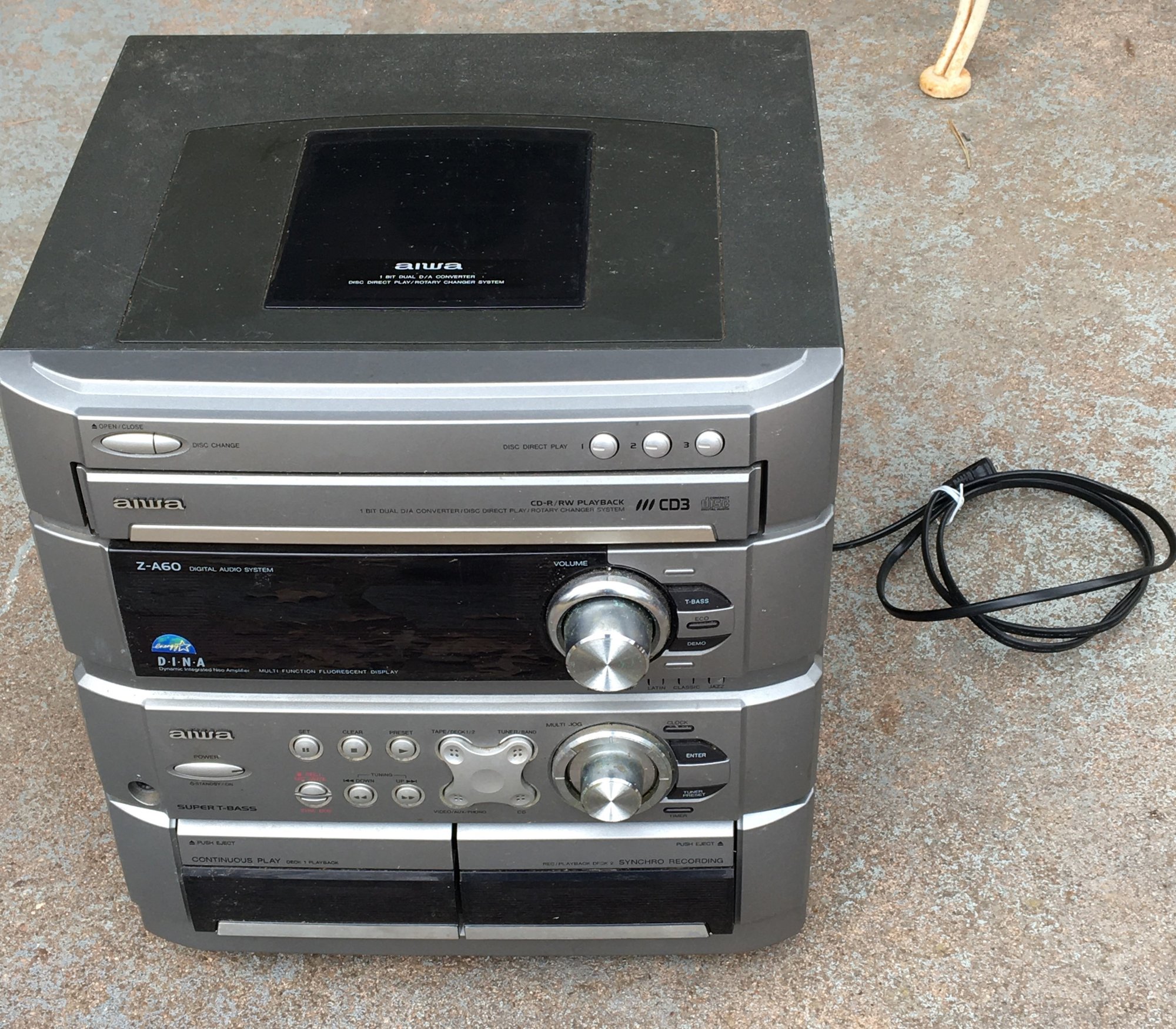 Early 1990s Vintage Aiwa Z-A60 Digital Audio Compact Stereo System. It includes a 3-CD rotary changer that supports CD-R/RW playback, a dual cassette deck, and an AM/FM tuner with "Super T" Bass playback. - The System Powers and lights up. I cycled through the CD rotator, and it worked. Did not test anything else. - Estate found decent looking but could use a cleaning. - See Photos for overall Size and Condition.