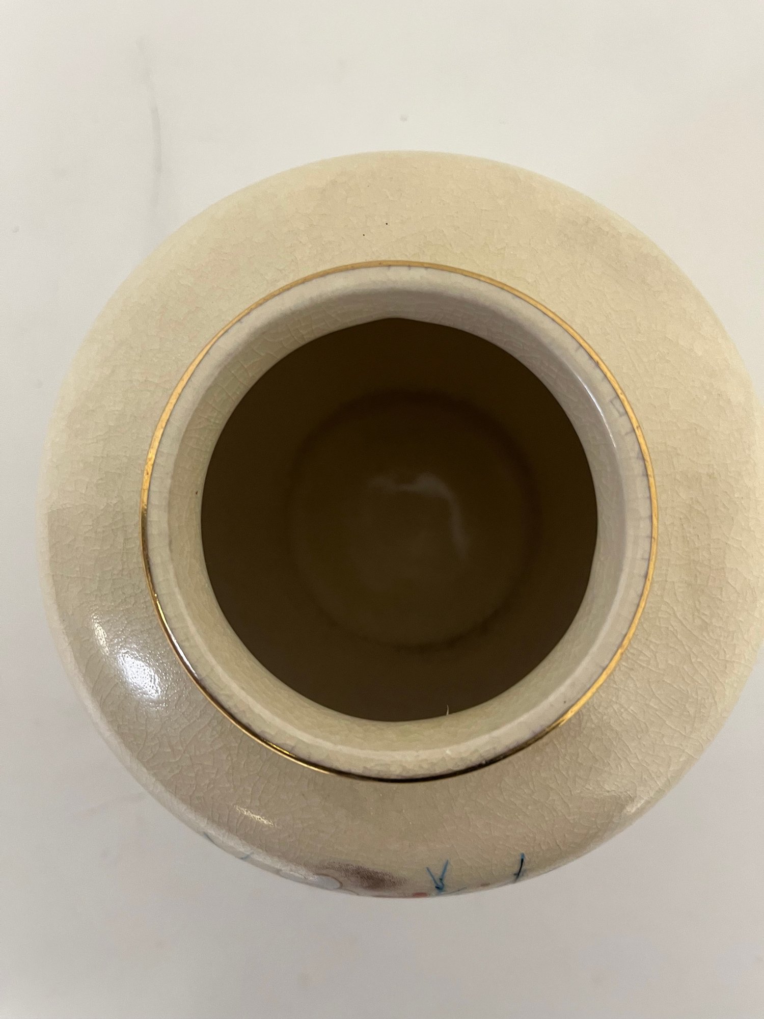 Aramark crackle glaze vase. See photos for details and imperfections. Size: 5.5” wide x 6” high