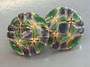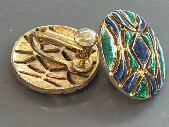 Vintage Blue And Green Enamel Clip-on Earrings In A Gold-tone Setting