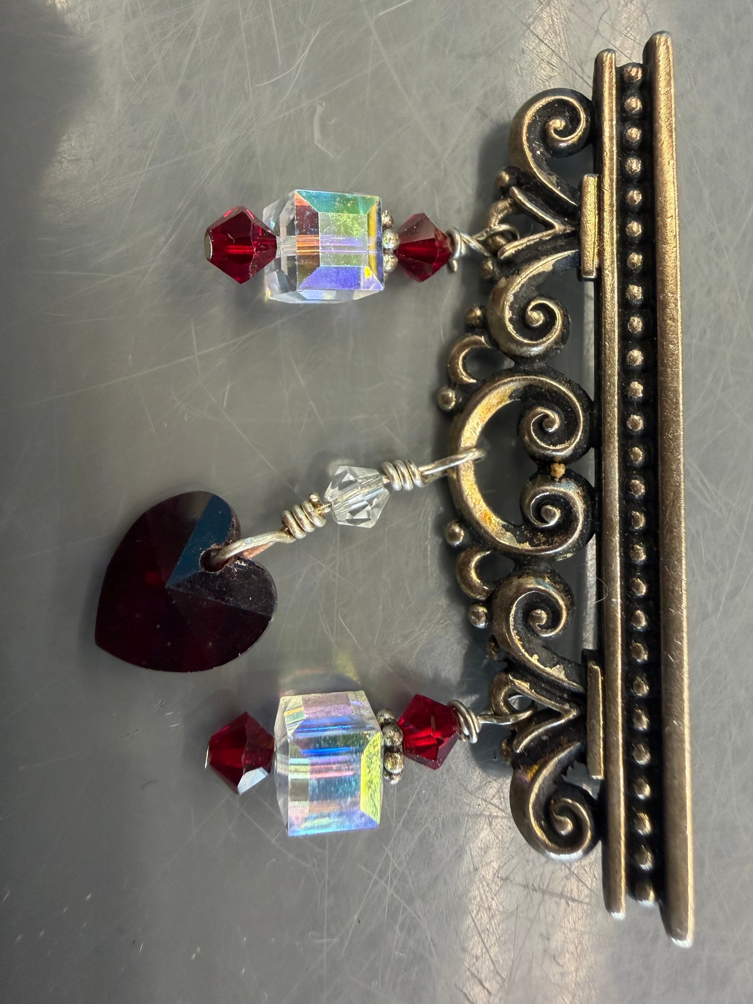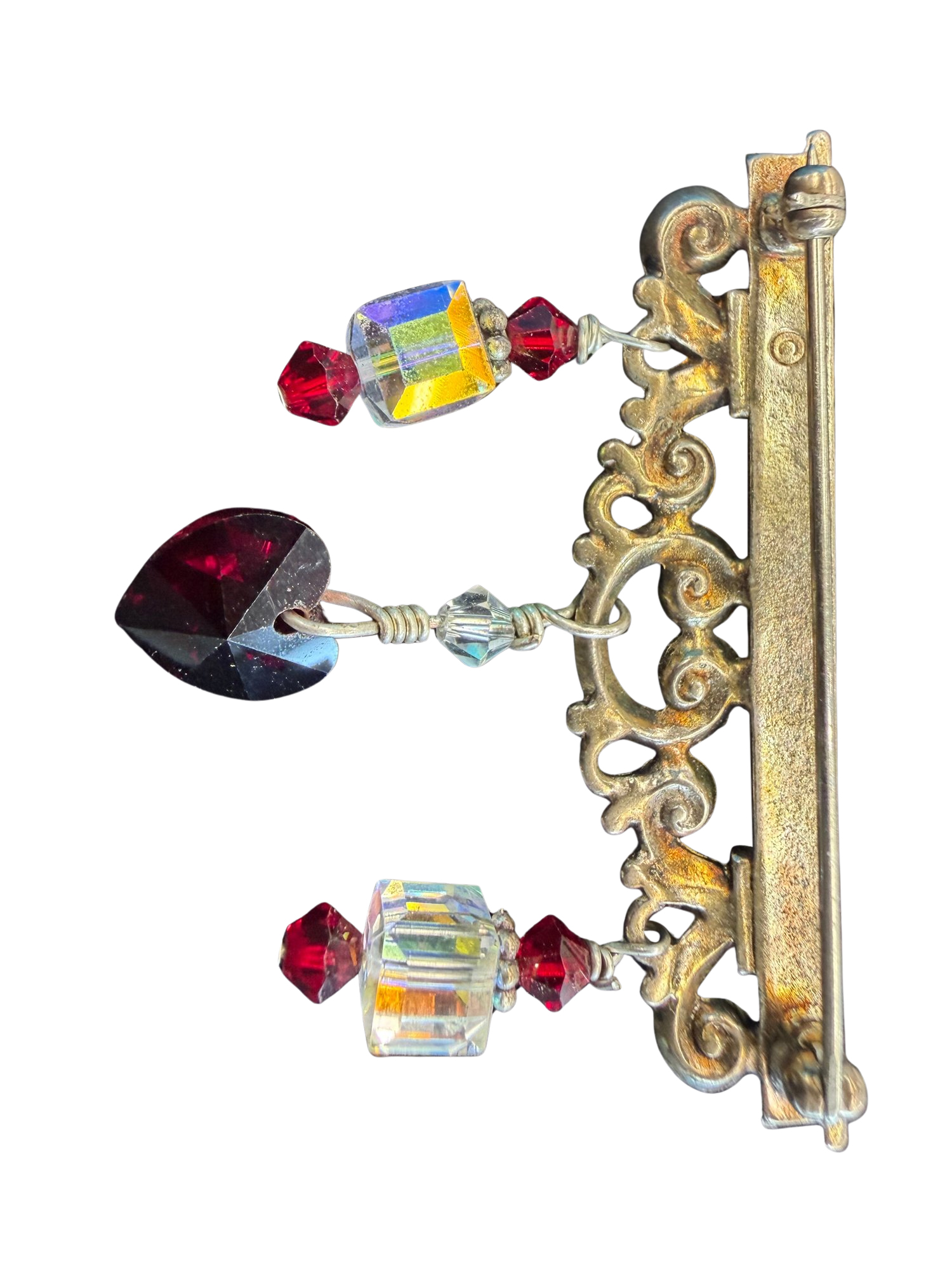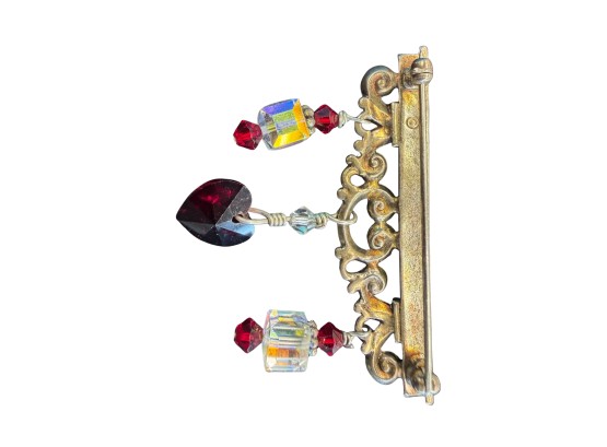 Vintage Brook Featuring Metal Filigree Frame Adorned With Red Crystals And A Heart Shaped Charm