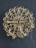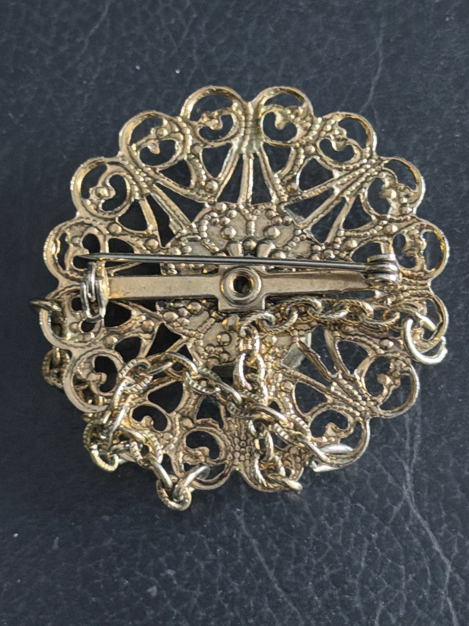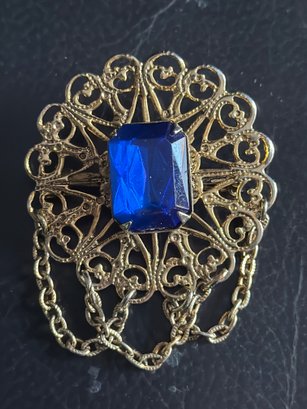 Vintage Czech Filigree Brooch Featuring A Large Rectangular Sapphire Blue Glass Stone