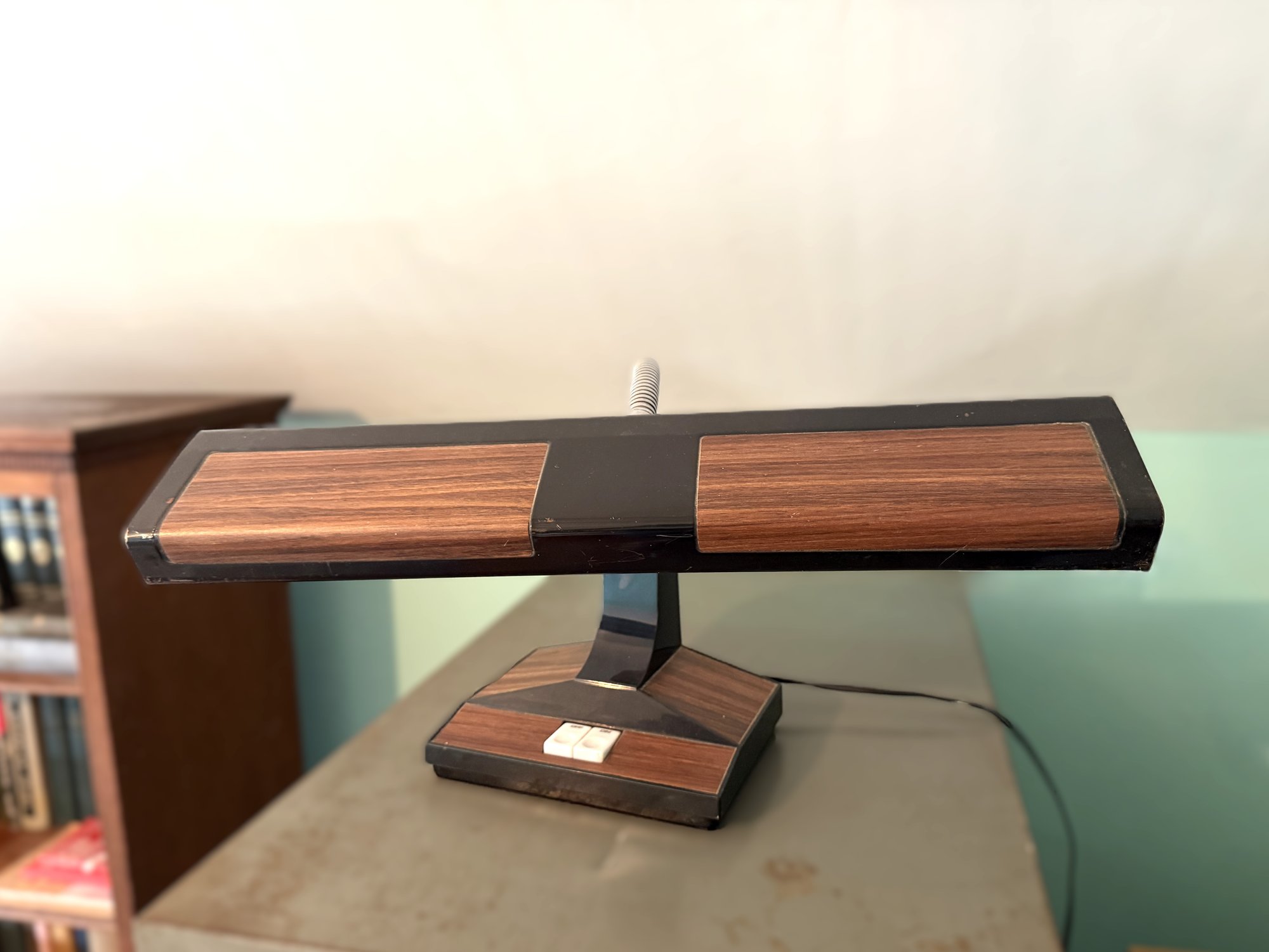 Vintage Underwriters Laboratory modern desk lamp in a black and wood grain finish with a chrome adjustable gooseneck.