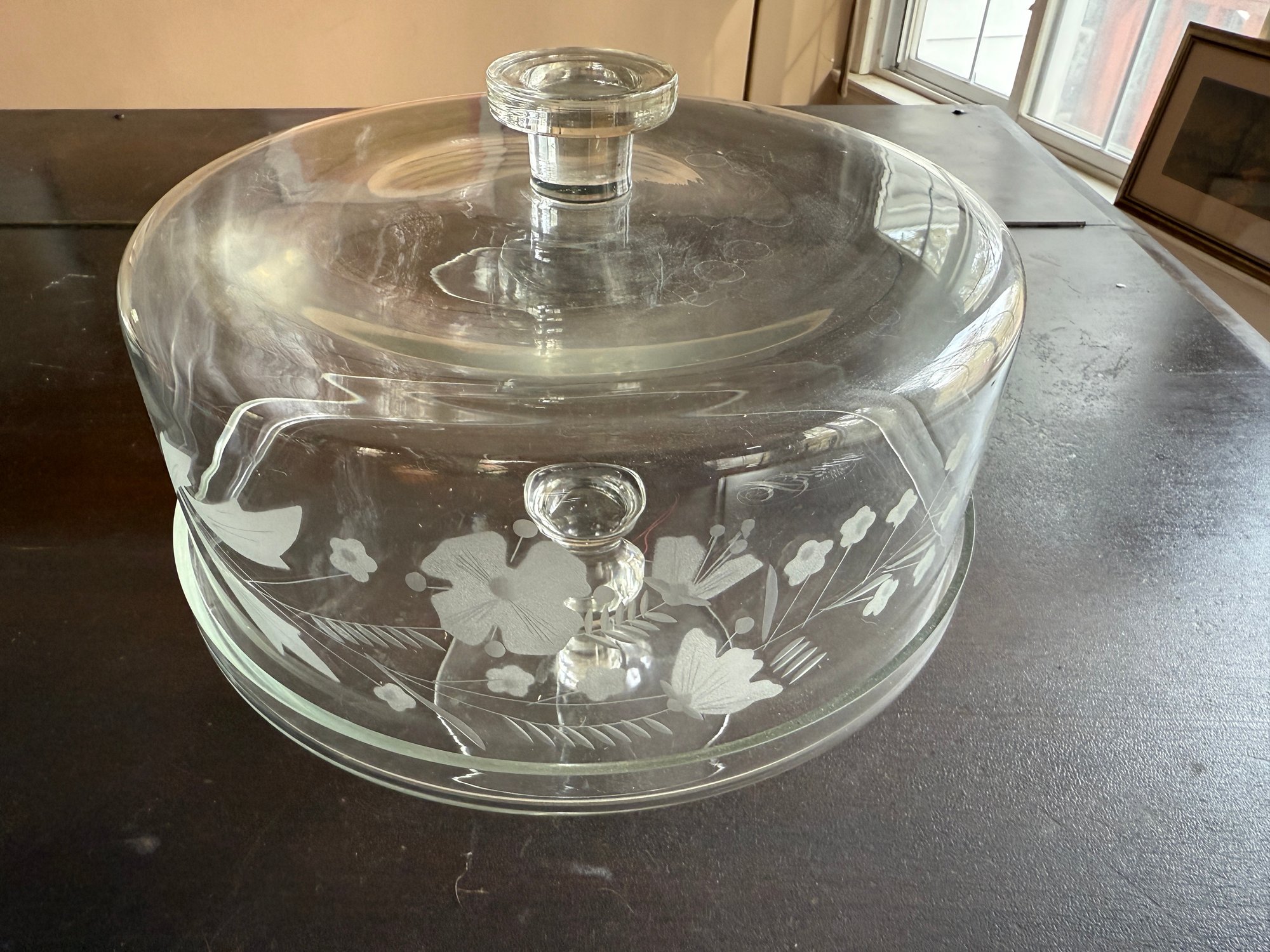 Gorgeous vintage (estimated circa 1950s) glass cake stand with etched cloche top featuring a floral design on one side of the cloche.