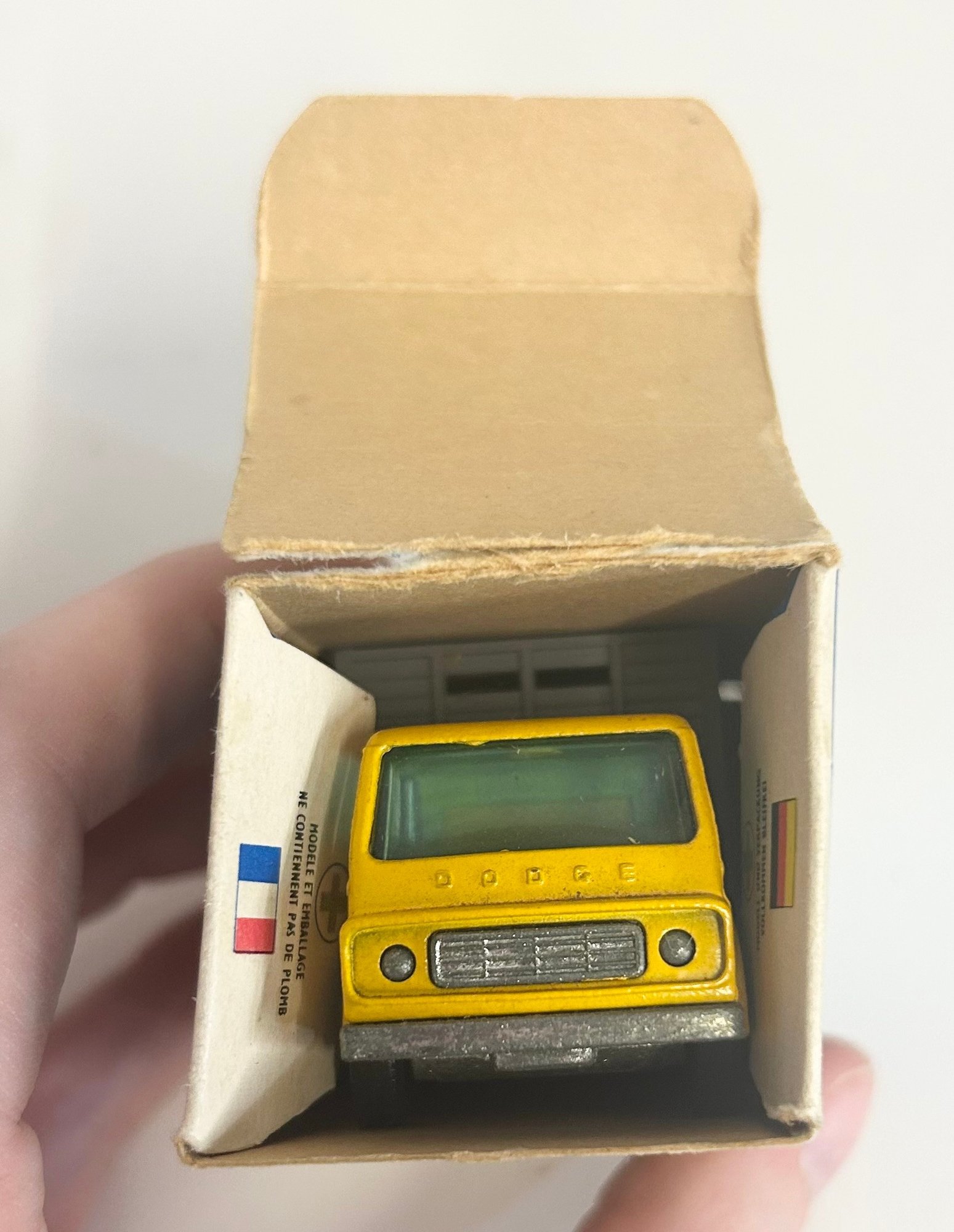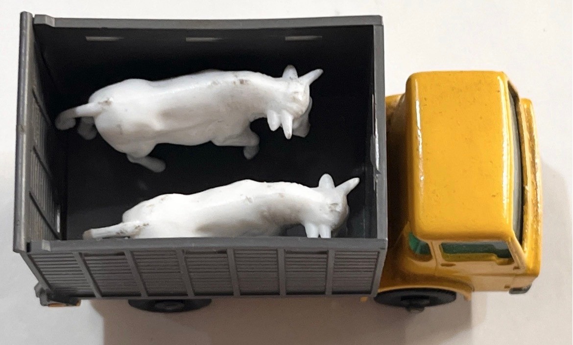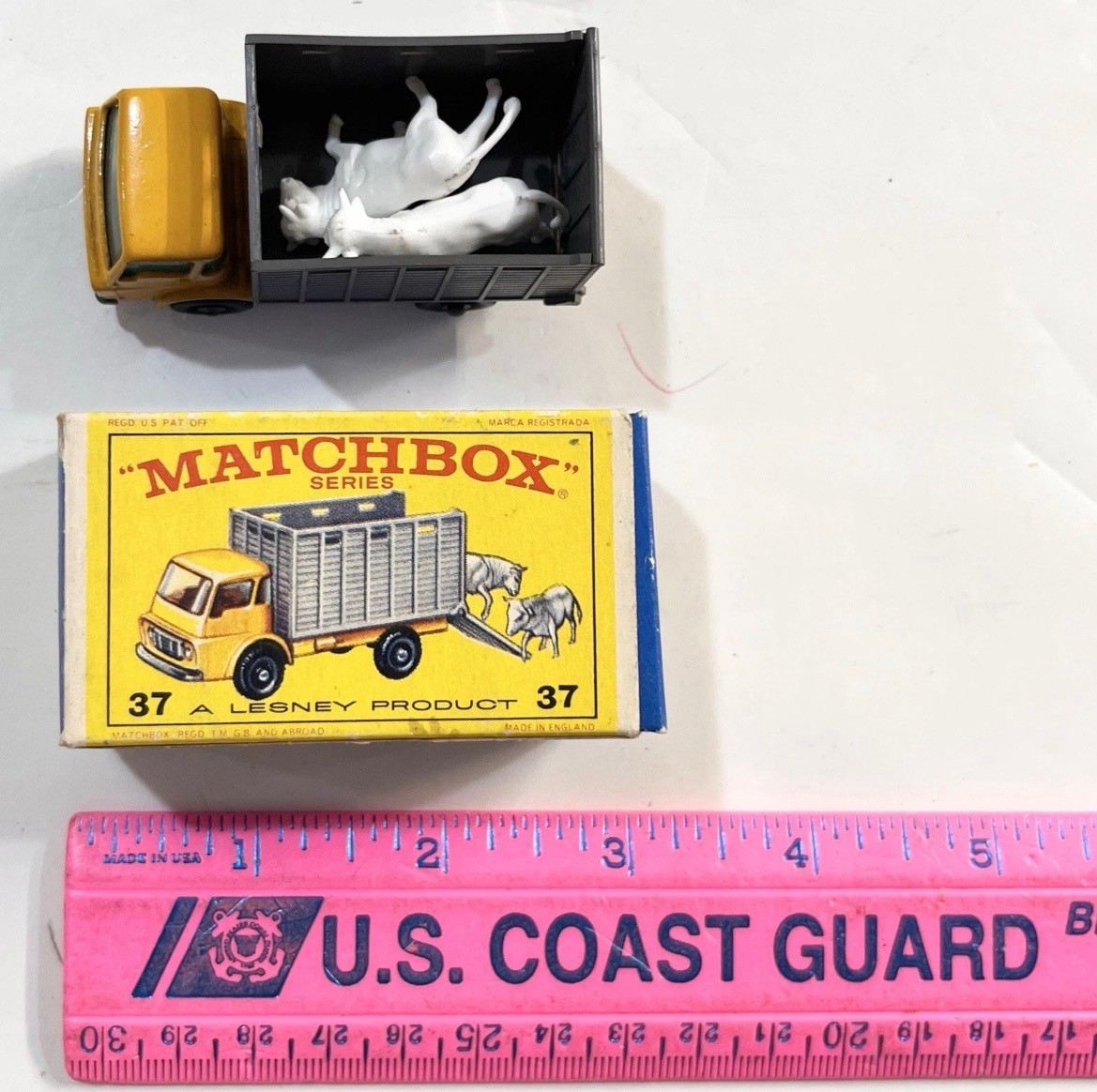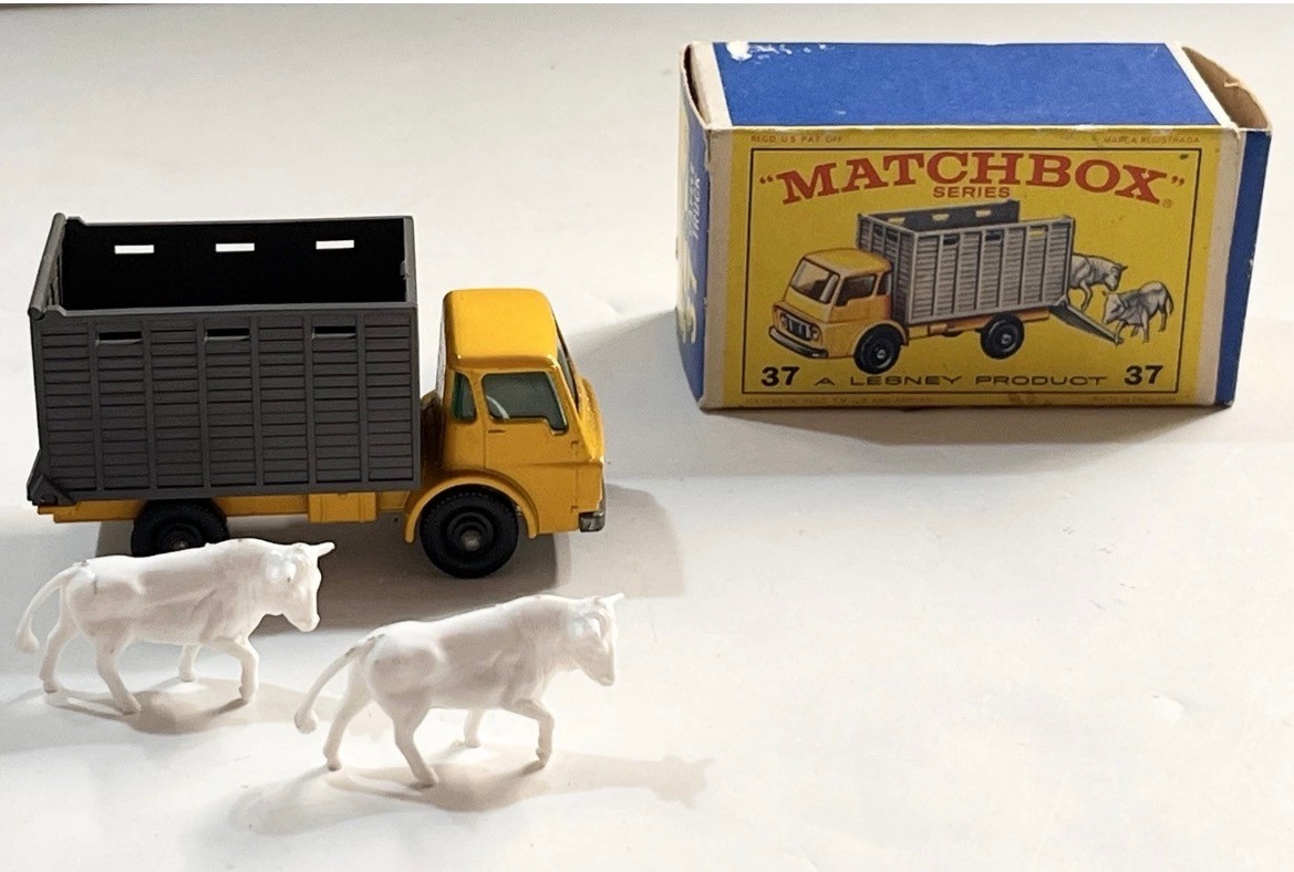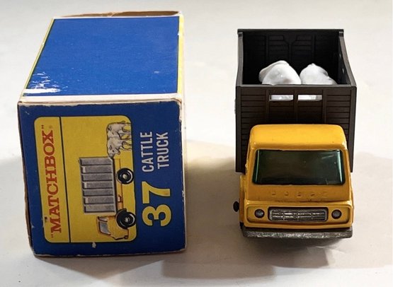 Check out this cattle truck, perfect for any Matchbox collector. This Matchbox cattle truck is in very good condition. The box shows some signs of age. The truck comes with two white plastic cows.