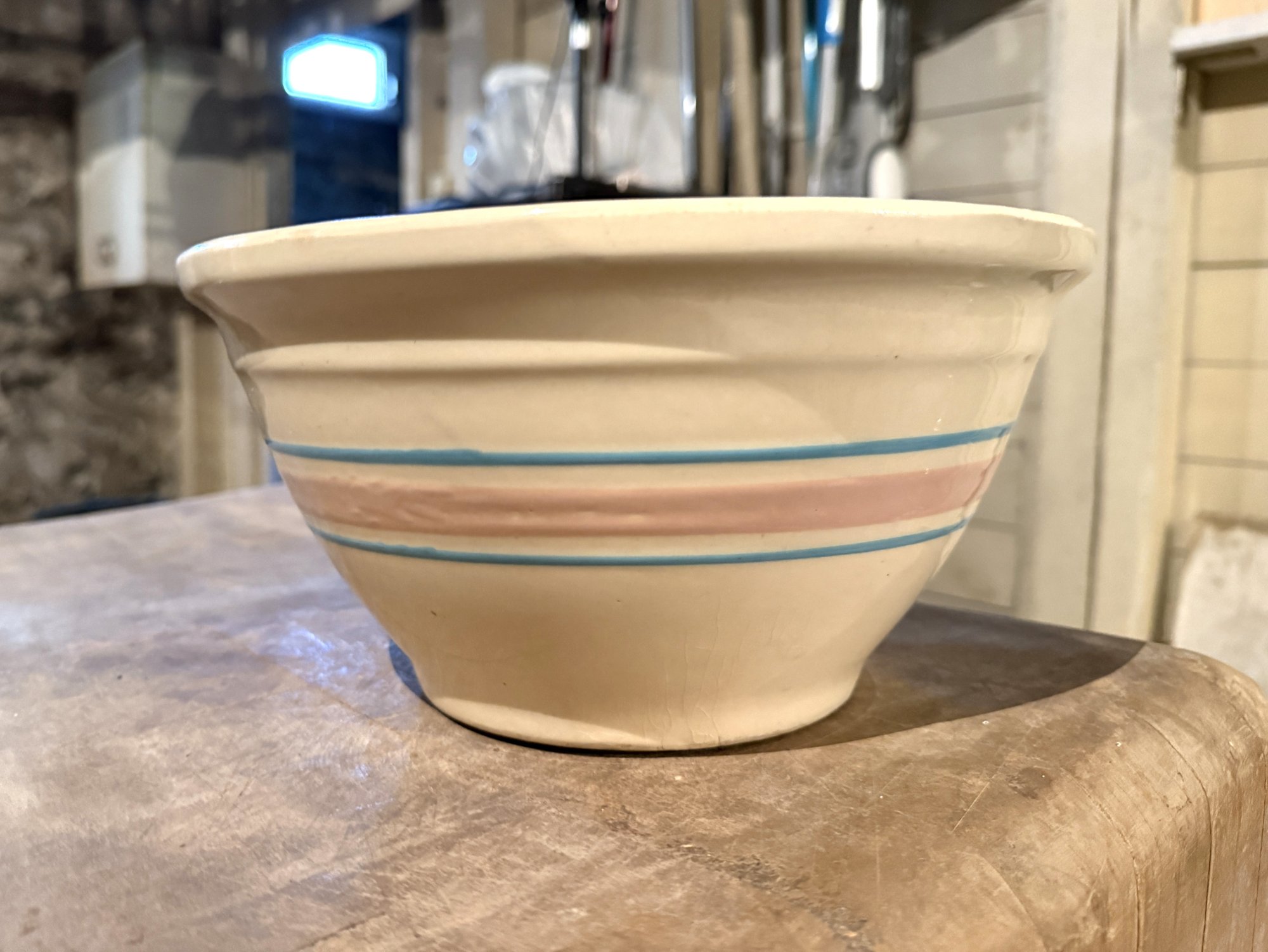 Vintage McCoy Oven Ware country kitchen style 10" mixing bowl in a cream color with pink and blue band decoration.