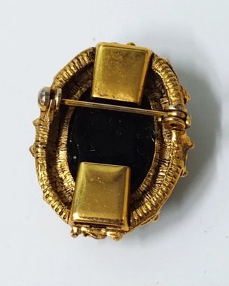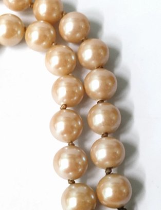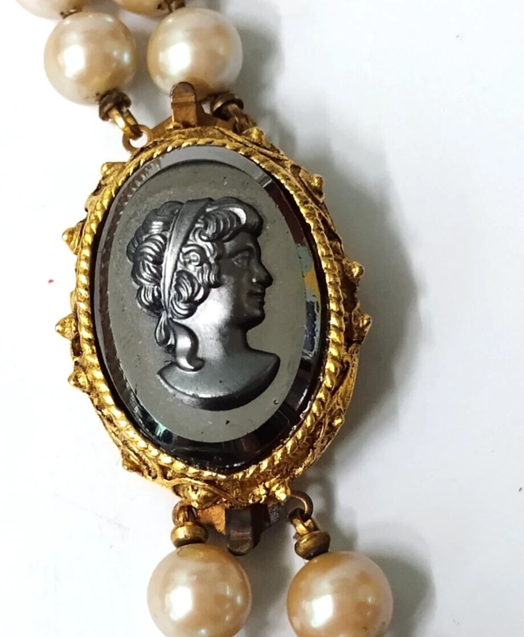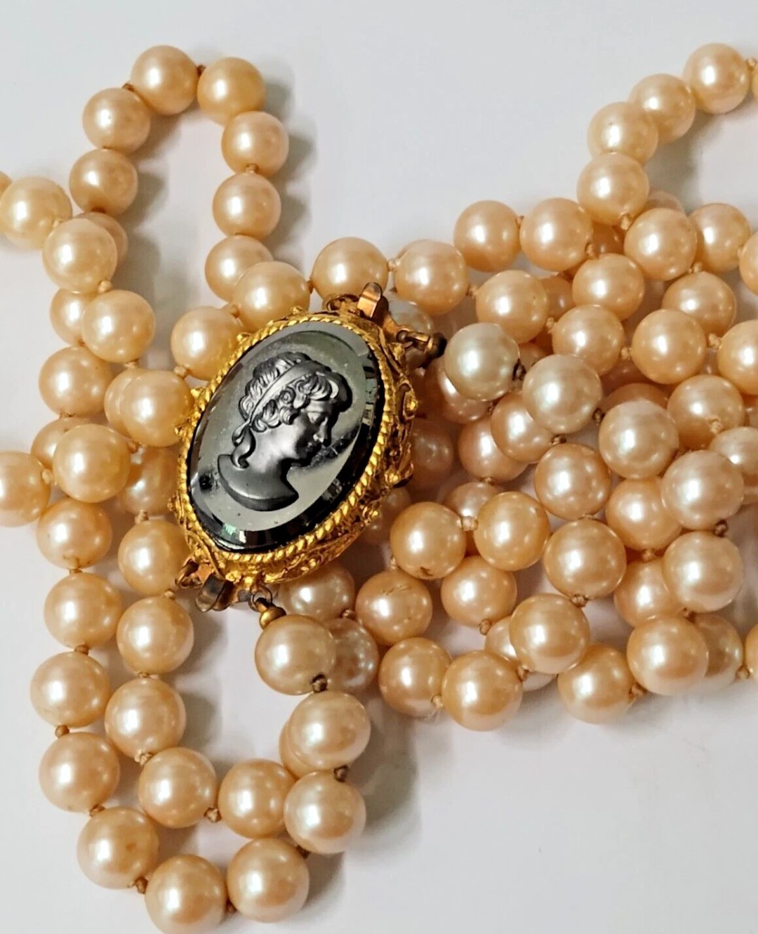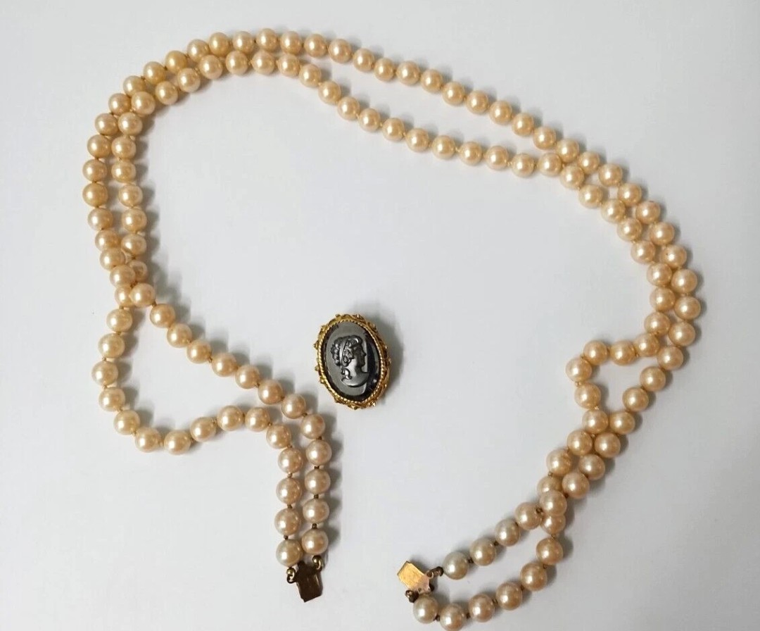 Vintage double strand creamy iridescent pearls (Glass) with convertible hematite cameo brooch closure. Menorca no markings. Two strands of cream color pearls are knotted in between and come to closure with push in clasps on either side of an antique gold tone brooch with a hematite cameo. Brooch is 1 1/4" long and 7/8" wide. Clasp works fine. Decorative edge 22"