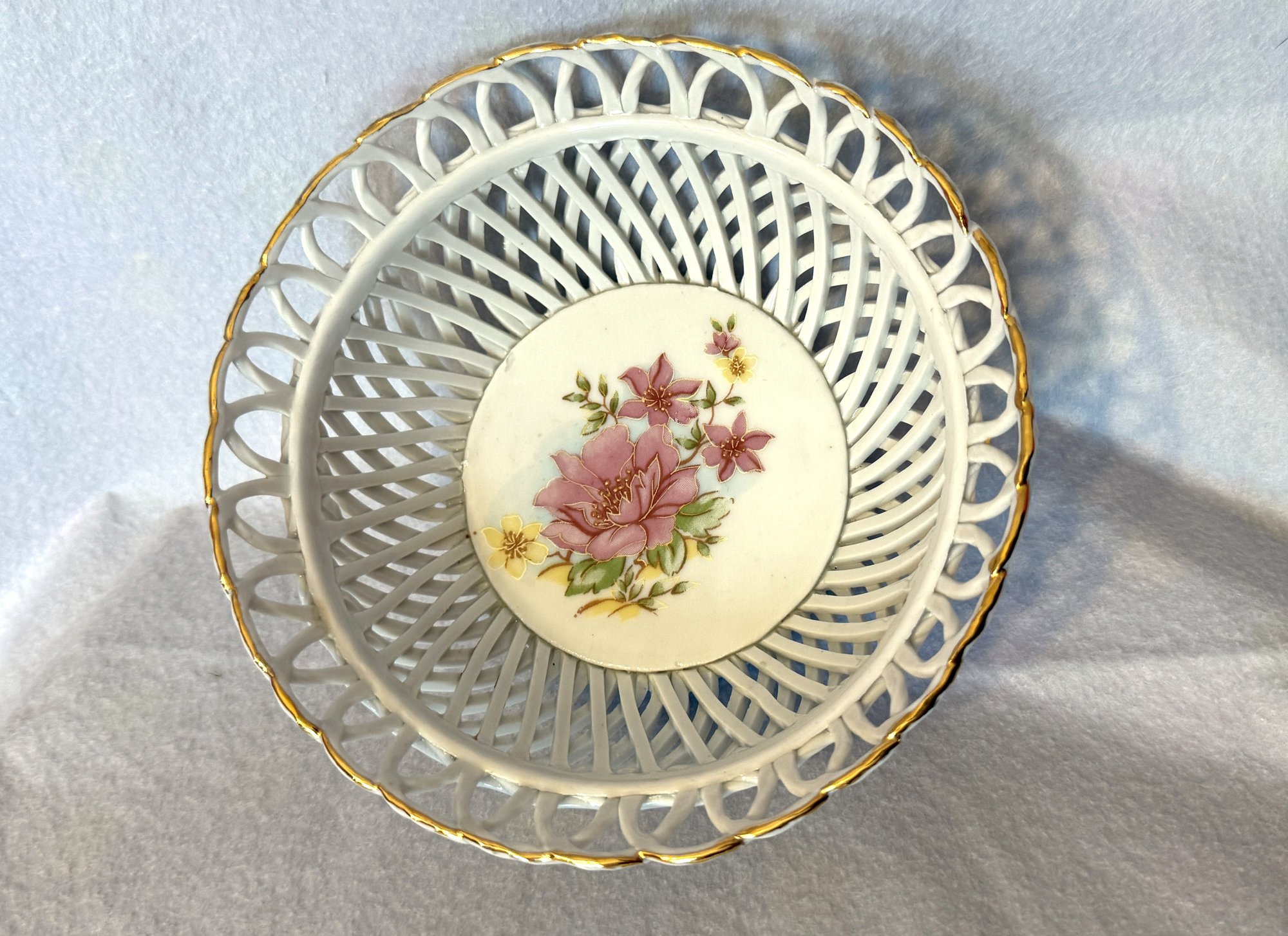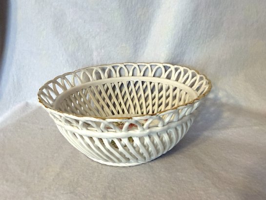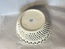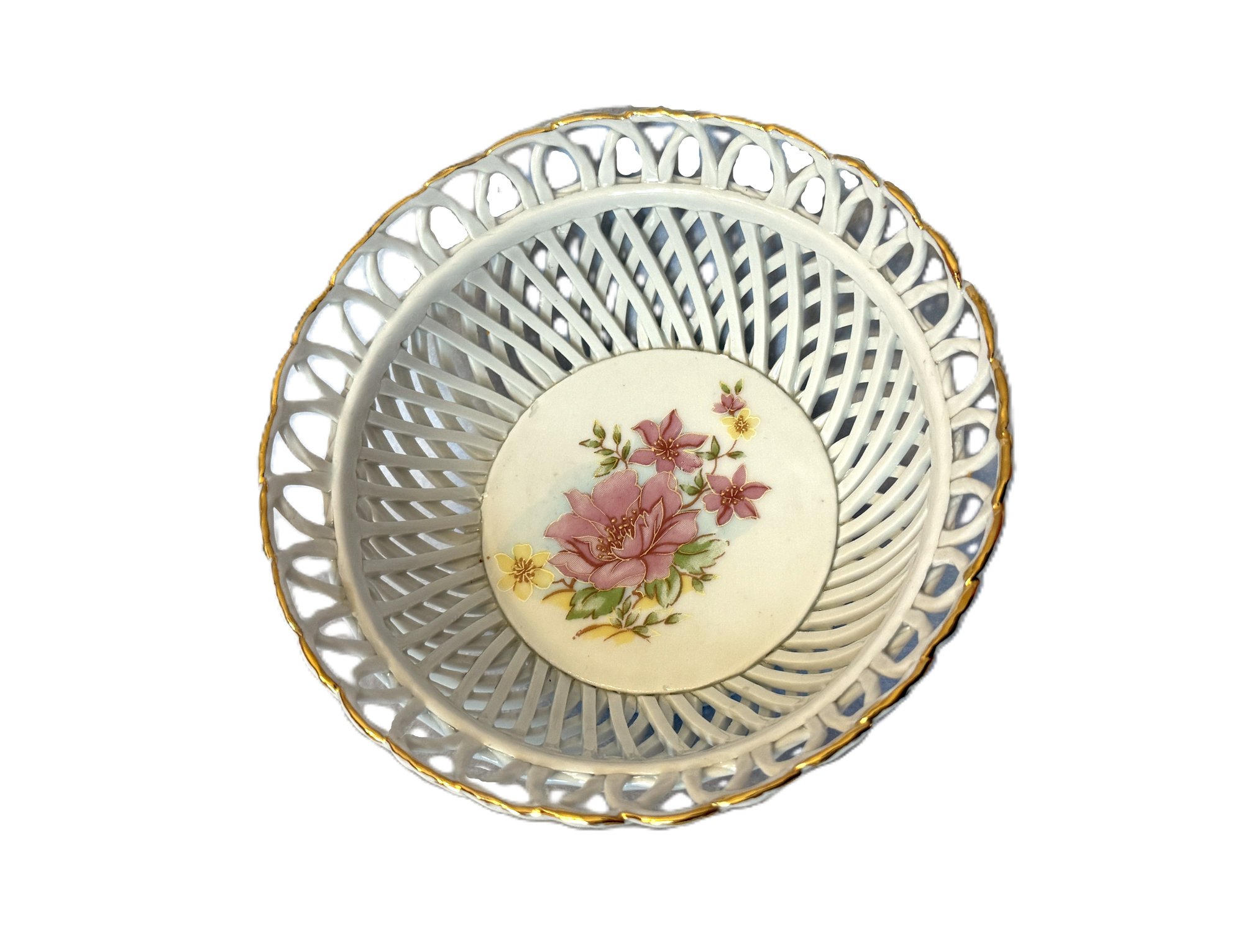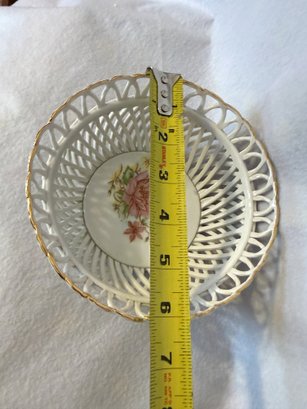 Delightful little woven porcelain basket-bowl with a central floral design.