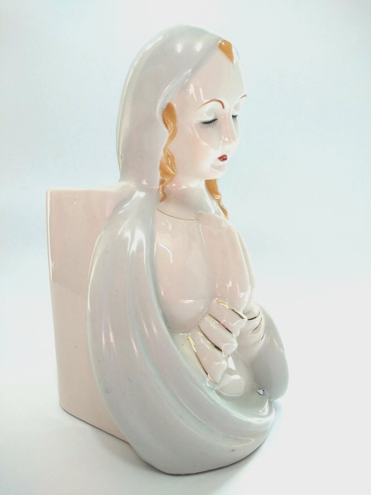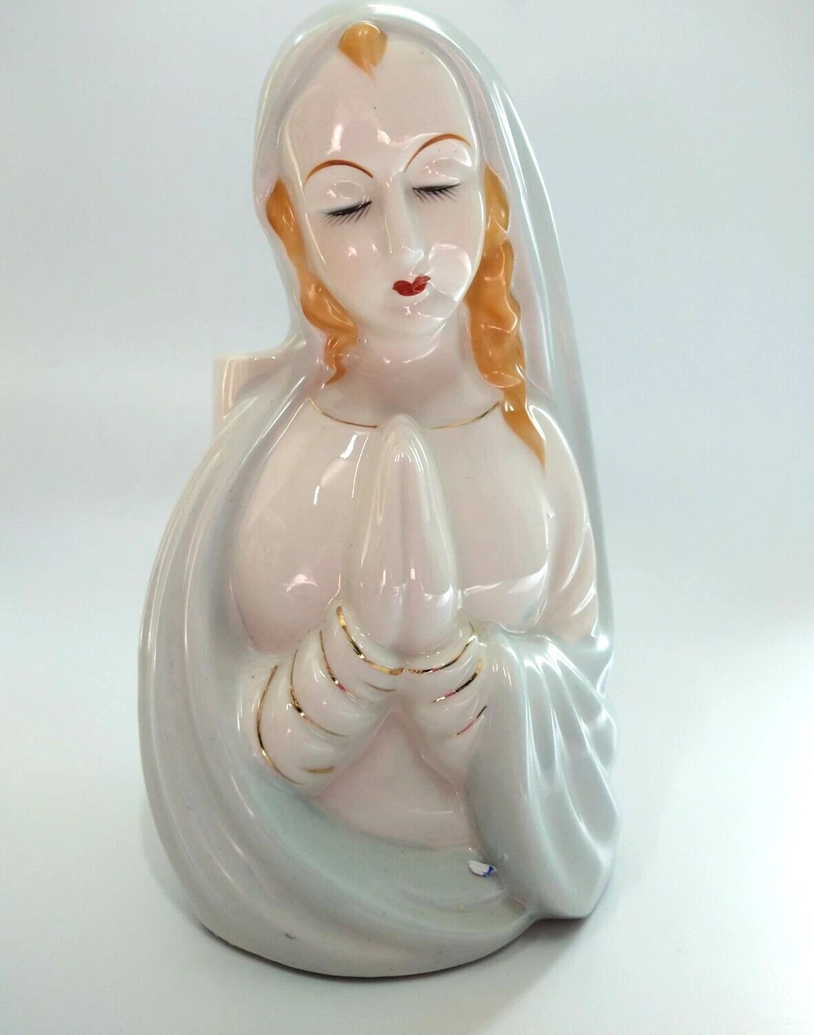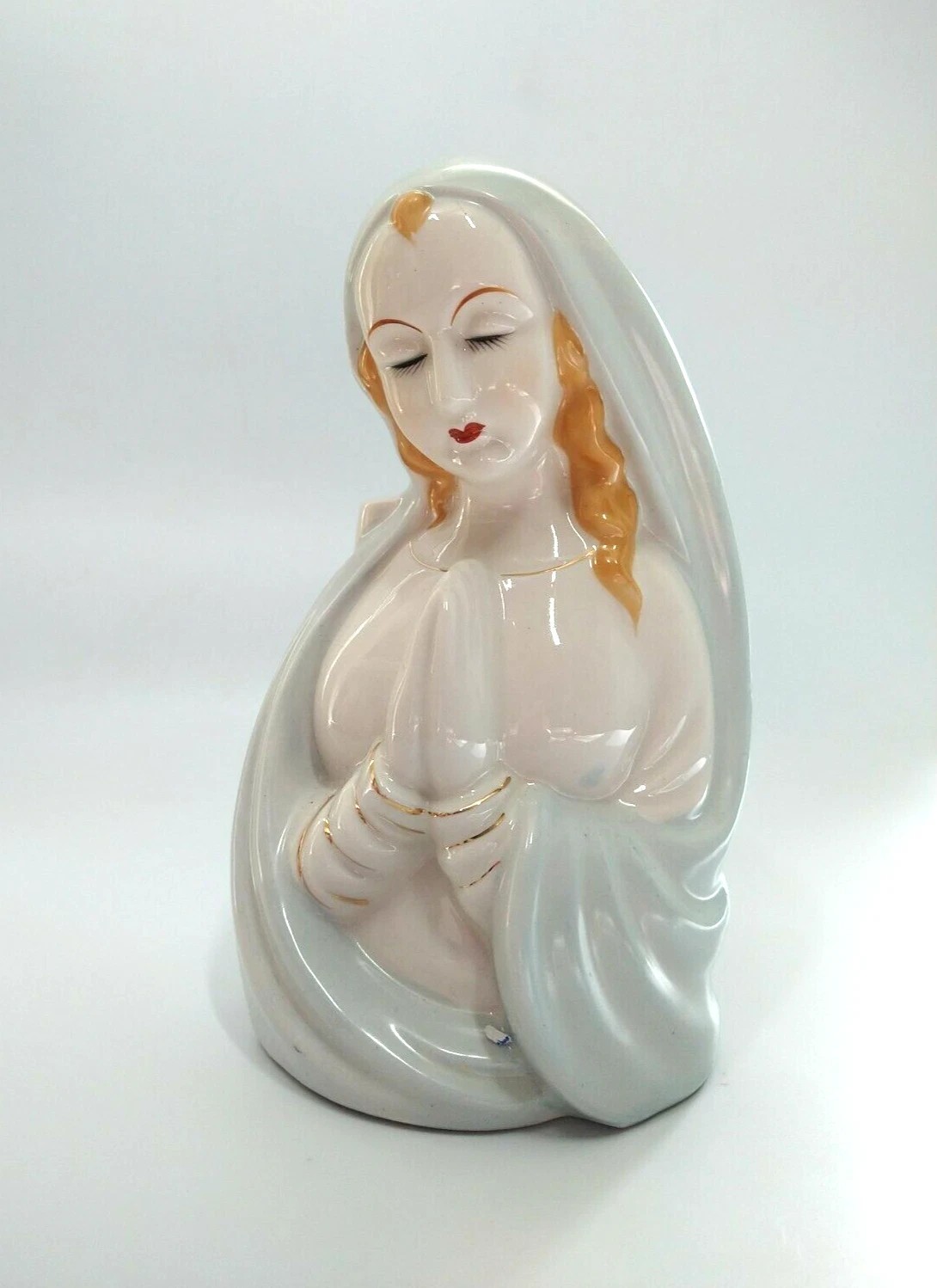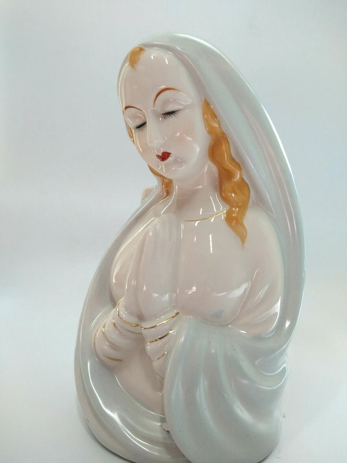 Vintage Virgin Mary 1960s It is made of porcelain in light blue, white with Gold detailing & ruby red lips Hand Painted and made in Japan