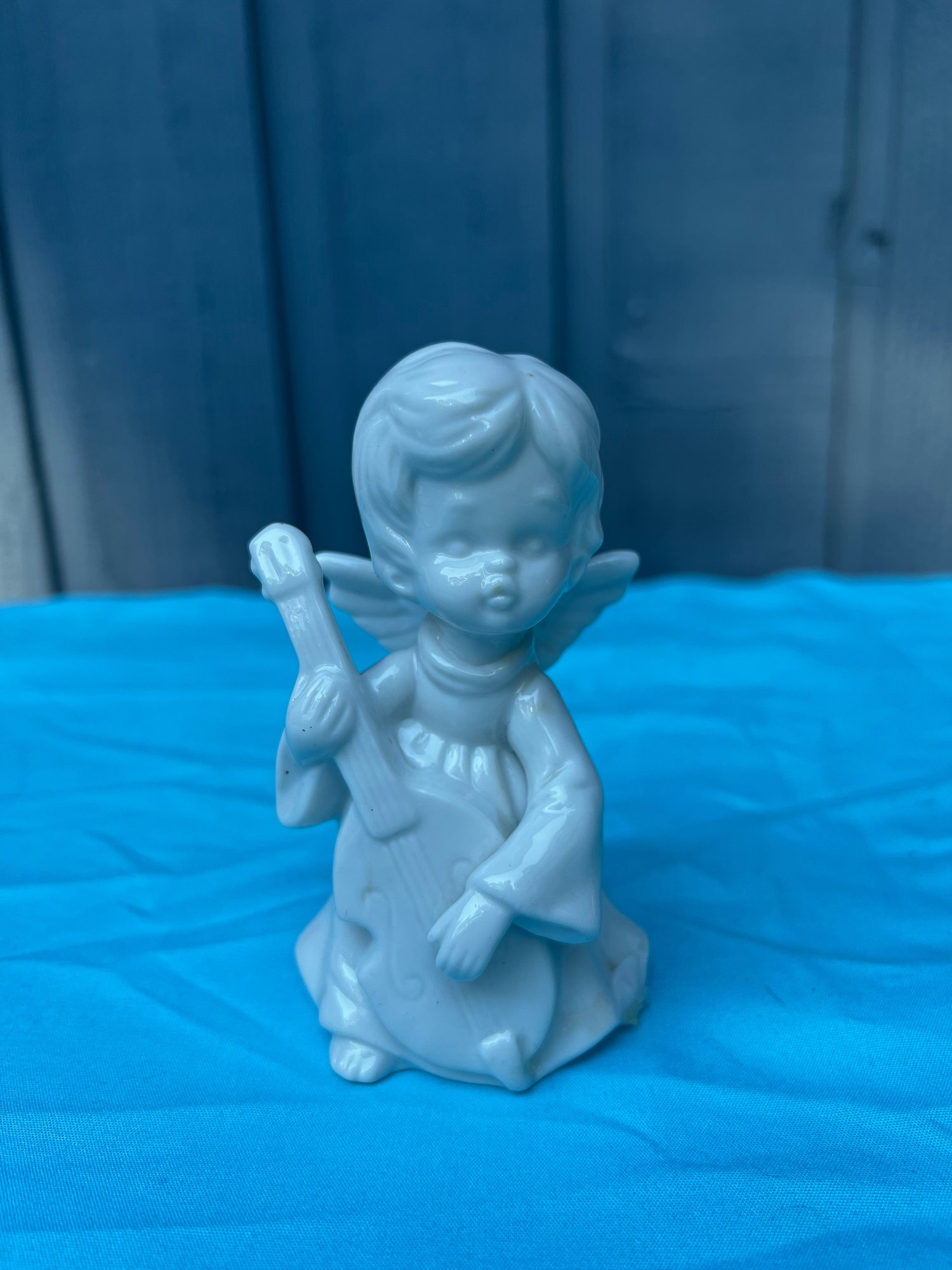 White Ceramic Cherub Angel Playing The Harp in glossy finish.