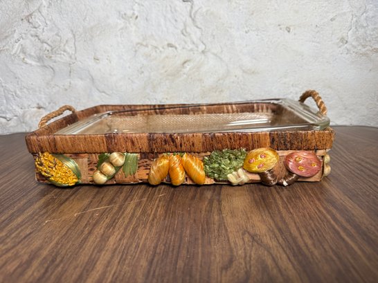 Wonderfully retro vintage Pyrex clear glass casserole dish with a raffia trivet holder "handmade in the Philippines" featuring mushrooms, carrots, and other veggies.