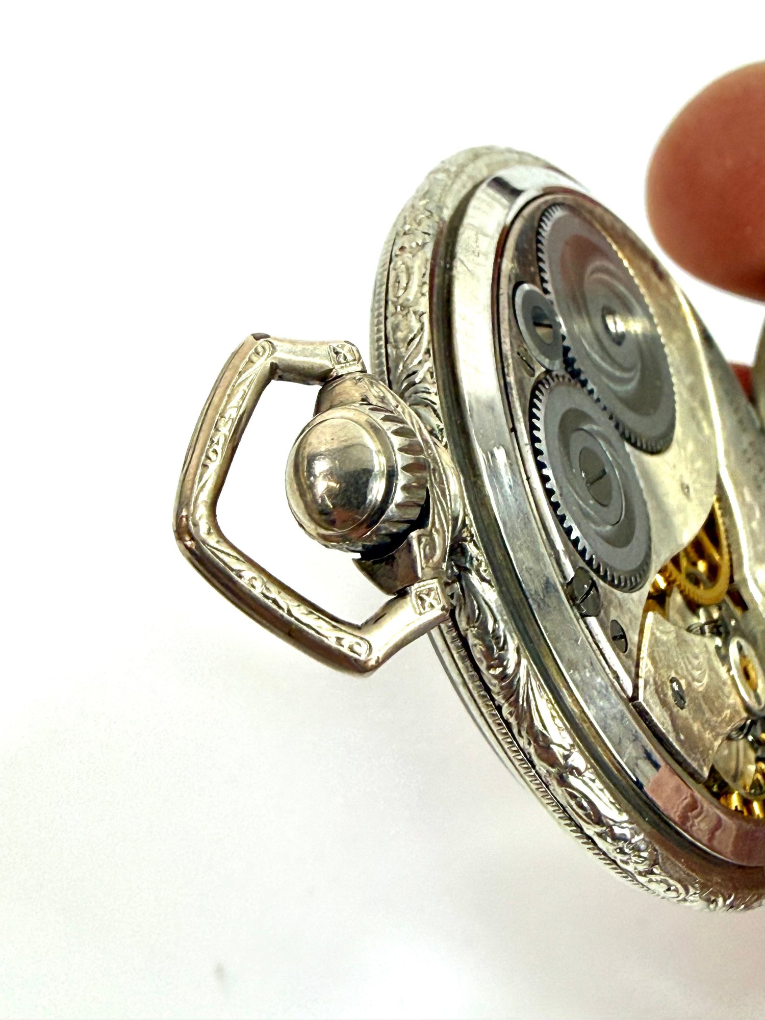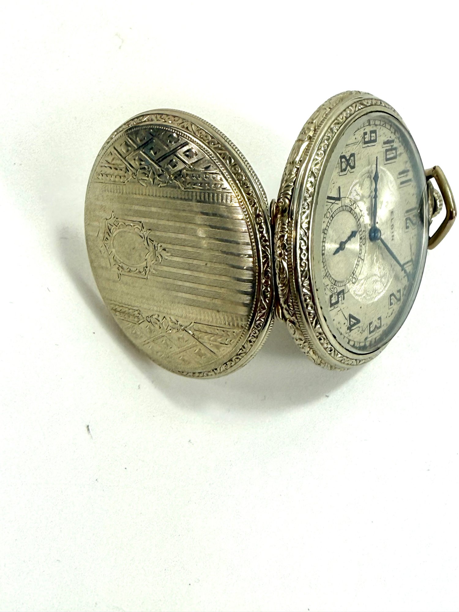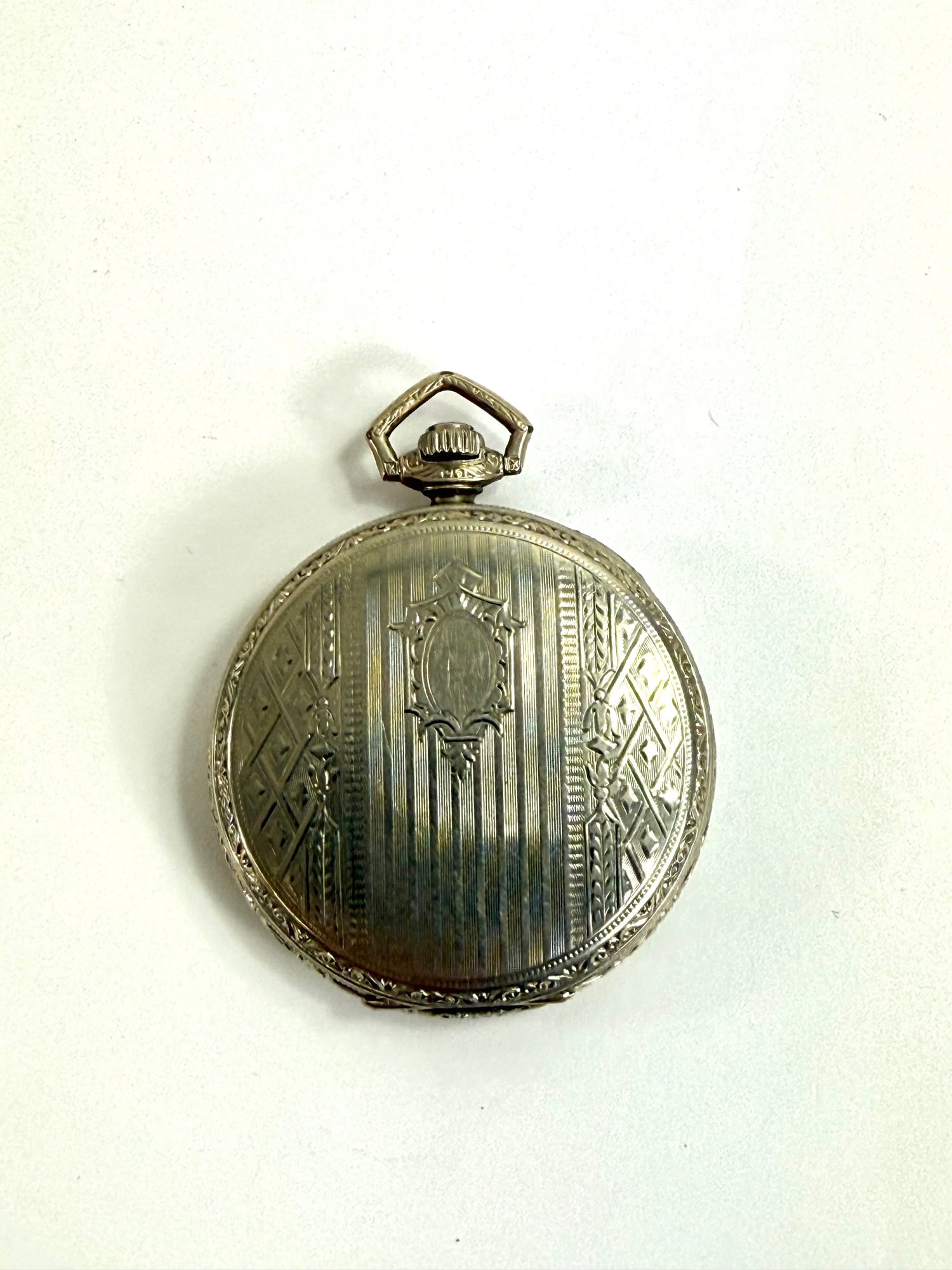 1920s white gold filled pocket watch with decorative engraving. It is not running.