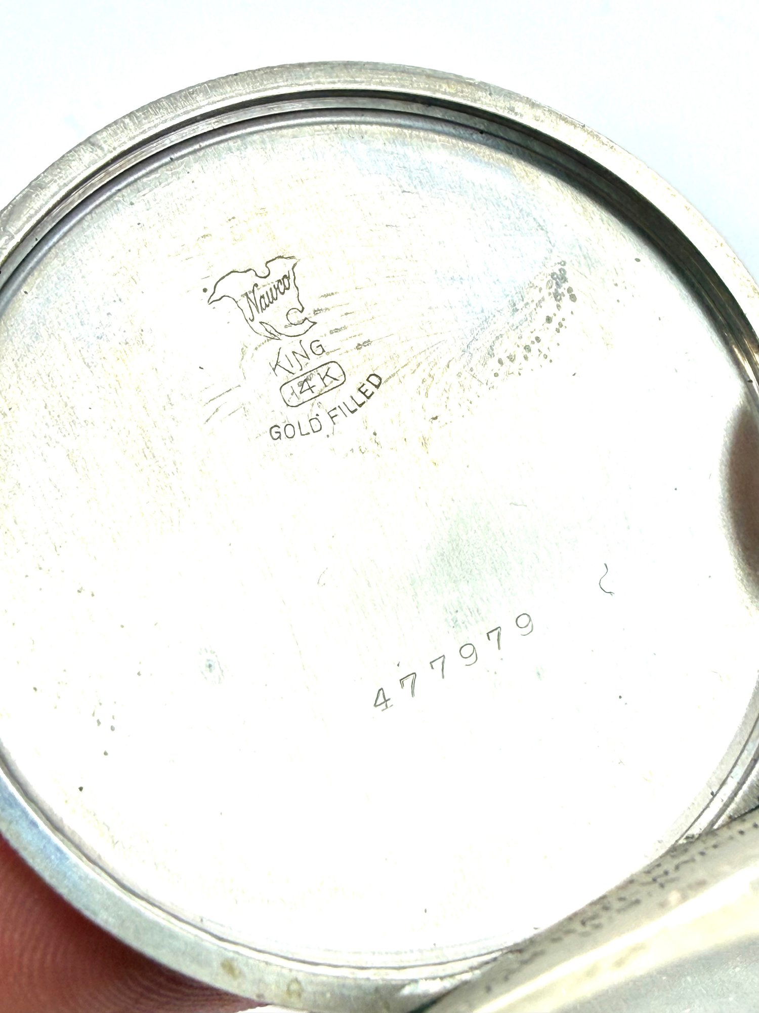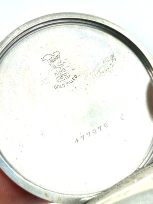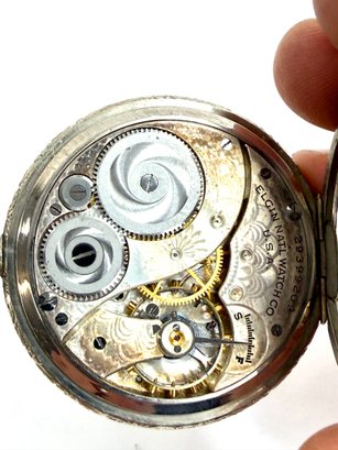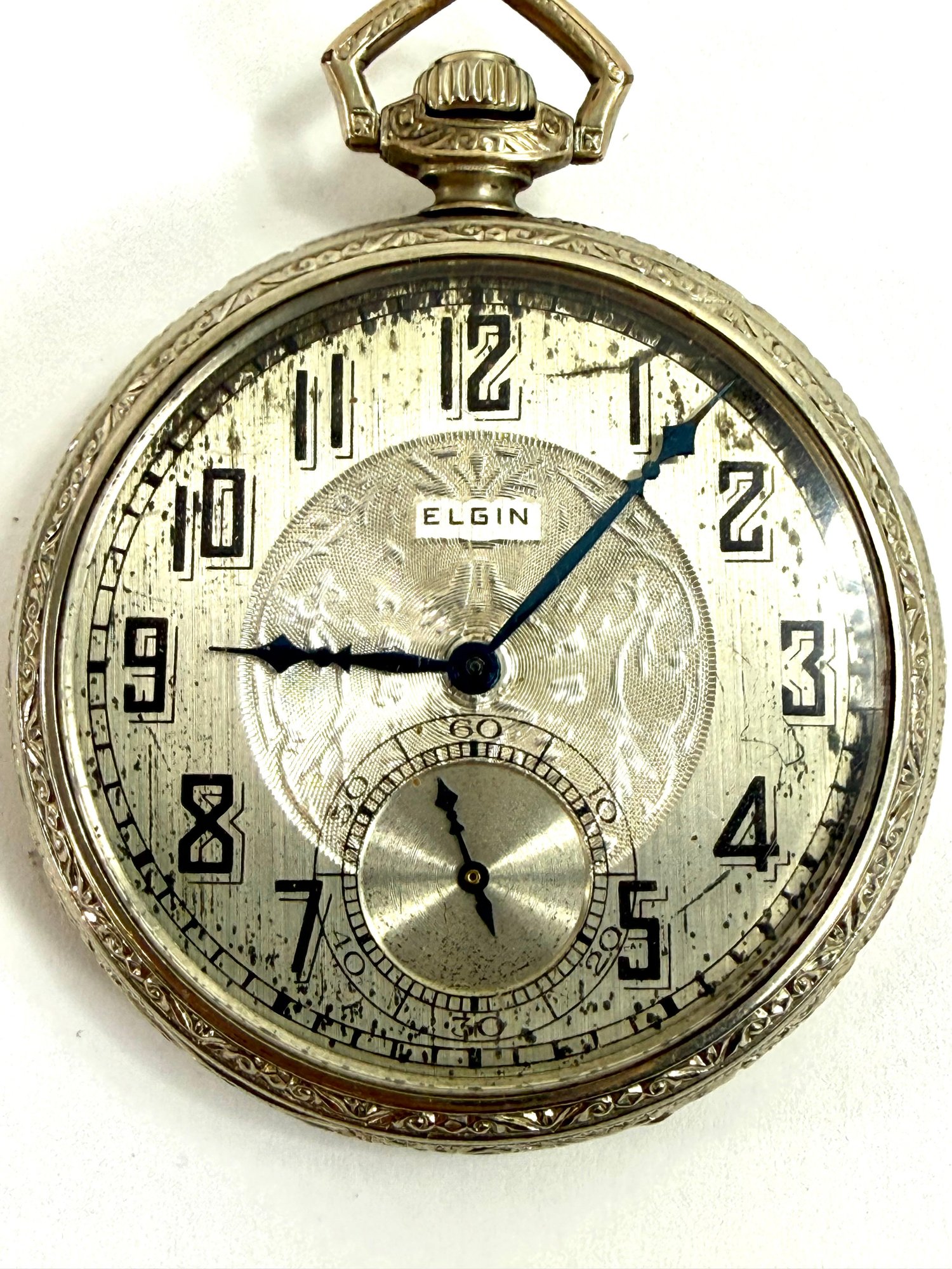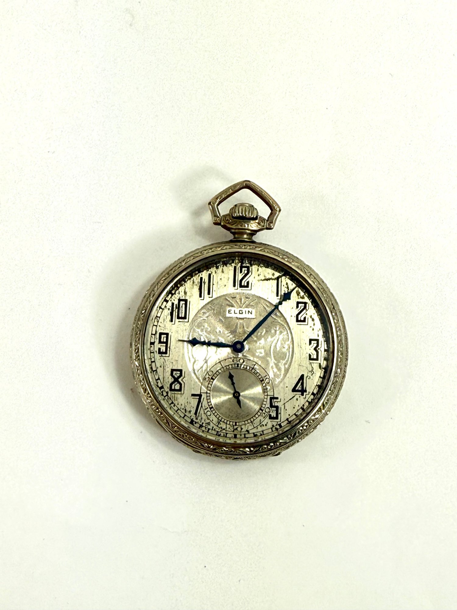 1920s white gold filled pocket watch with decorative engraving. It is not running.