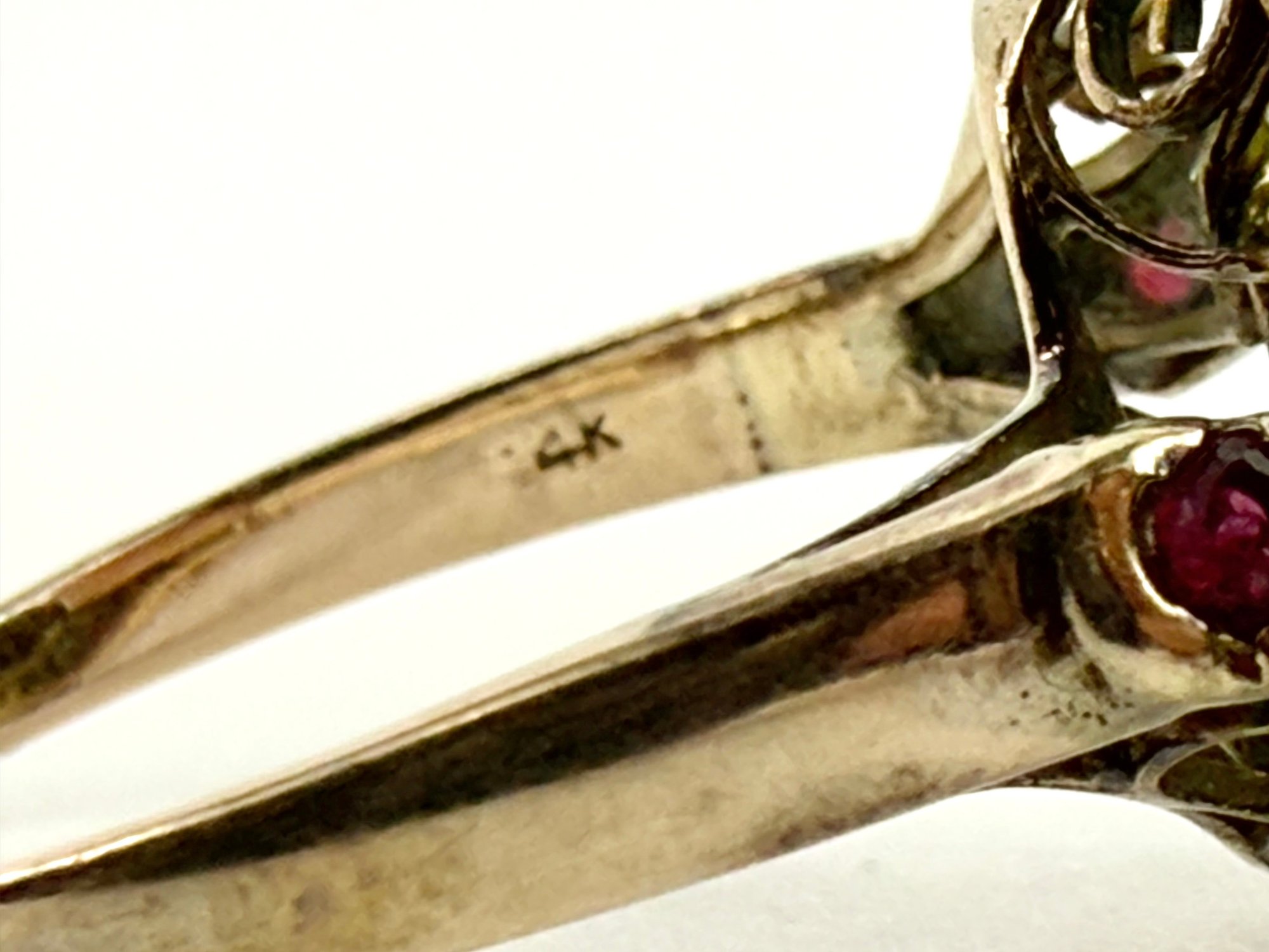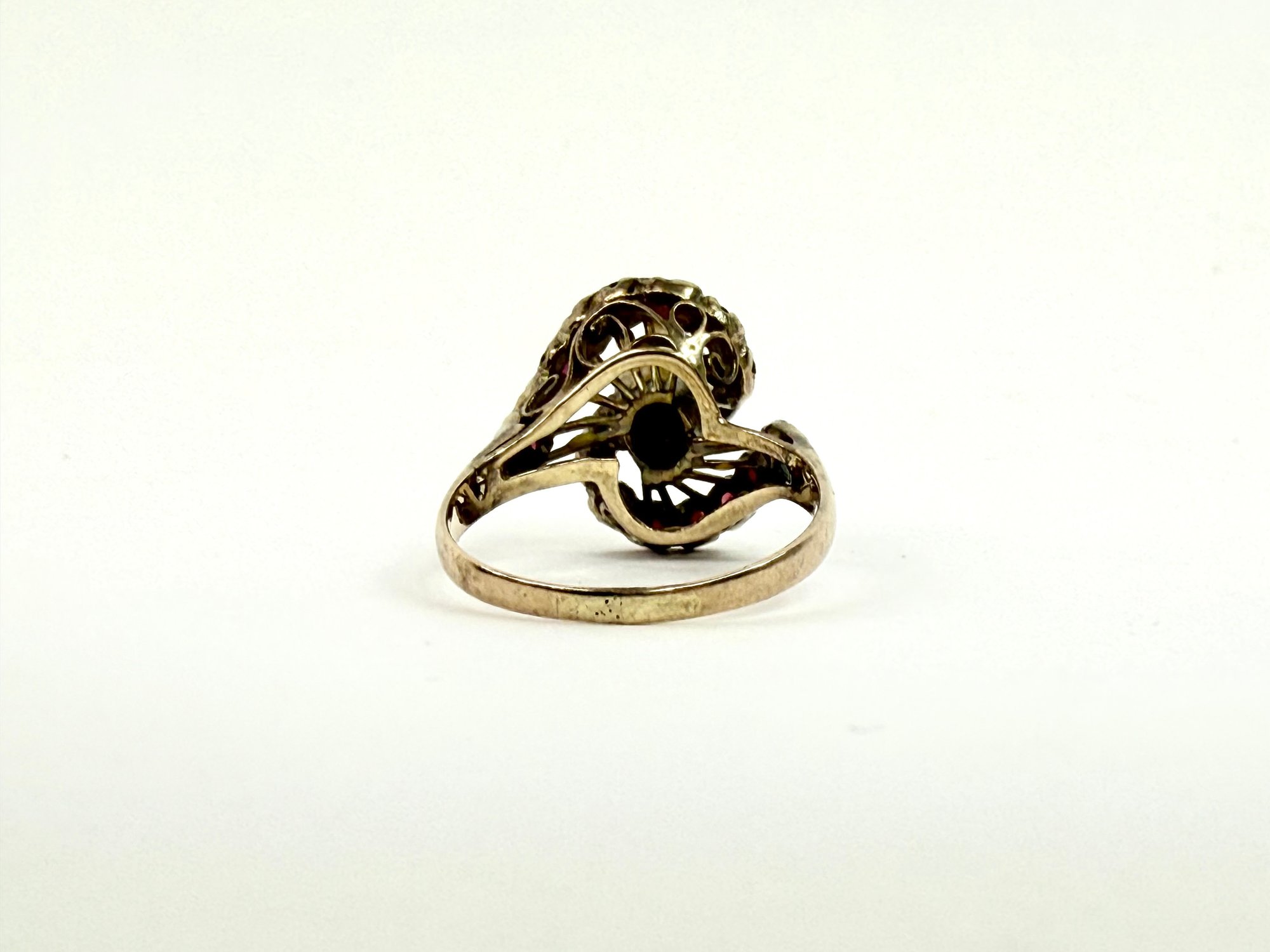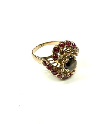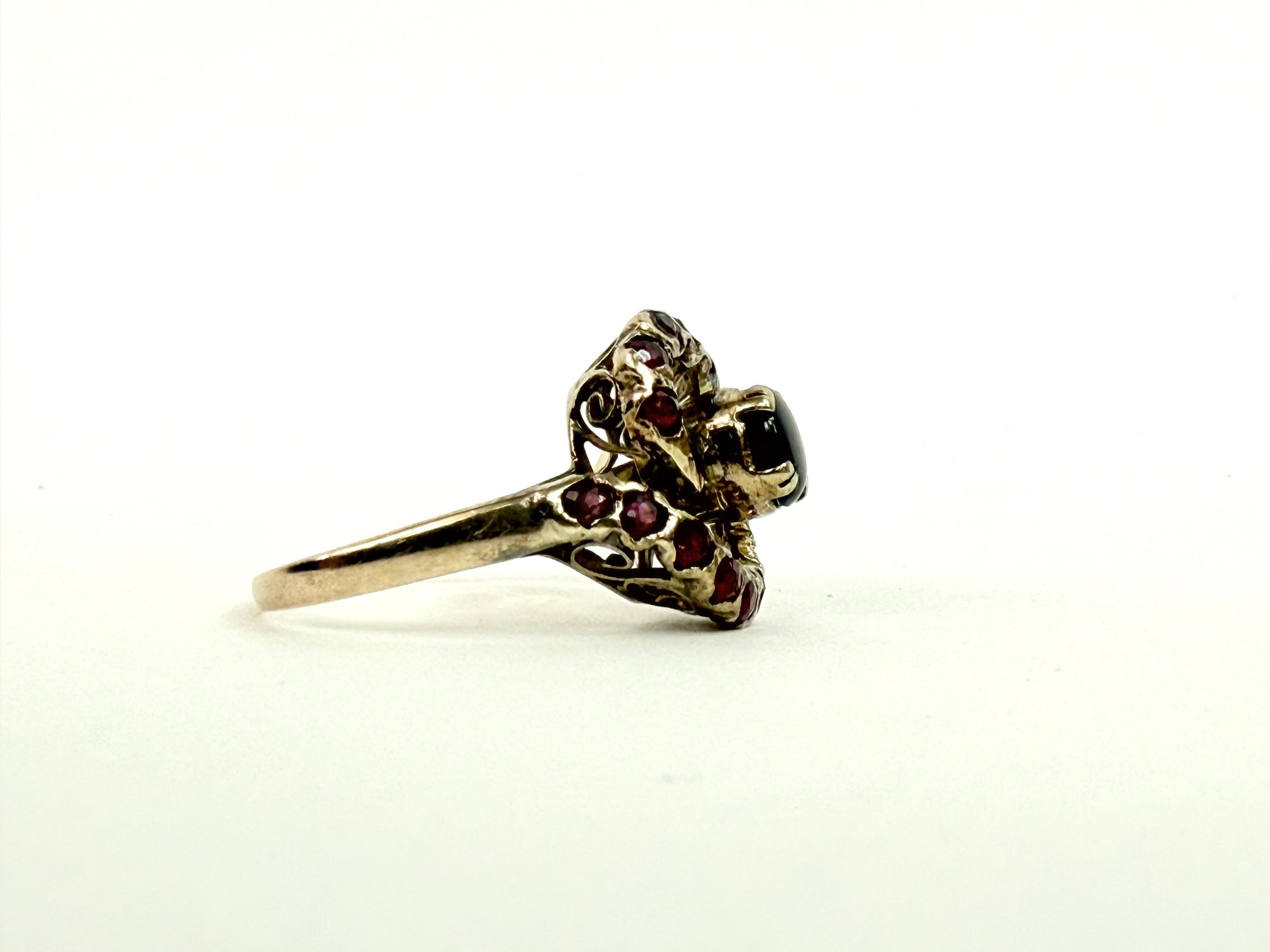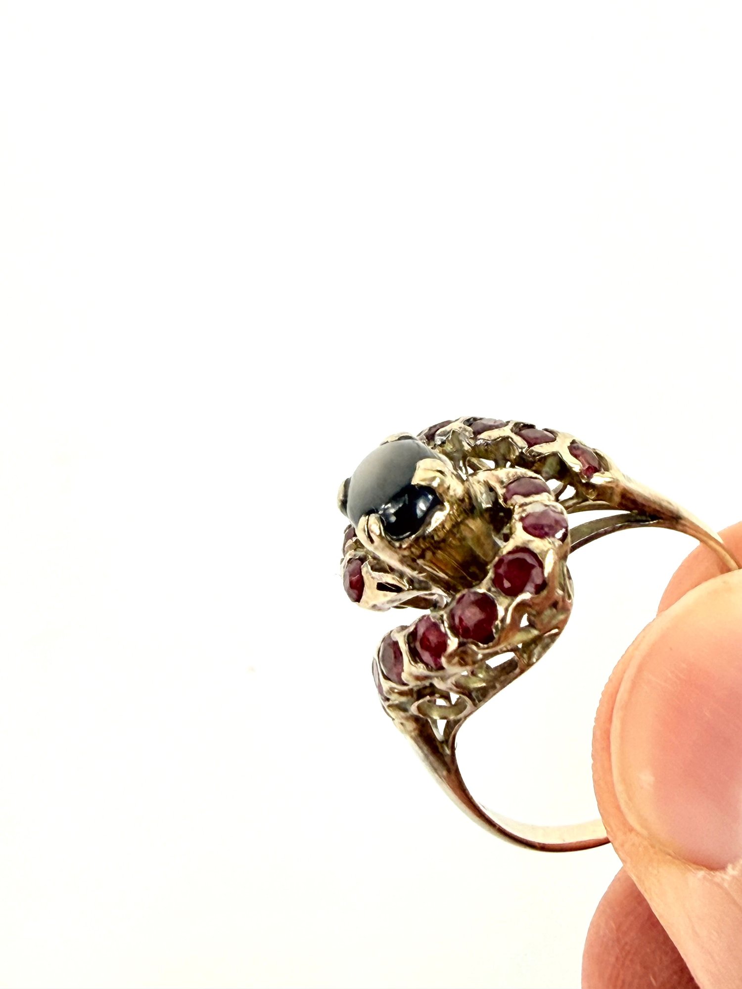 A total of six rubies surrounding a black star sapphire. Stamped 14k