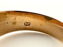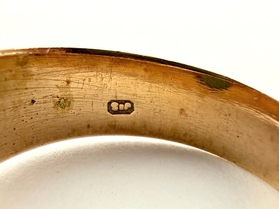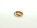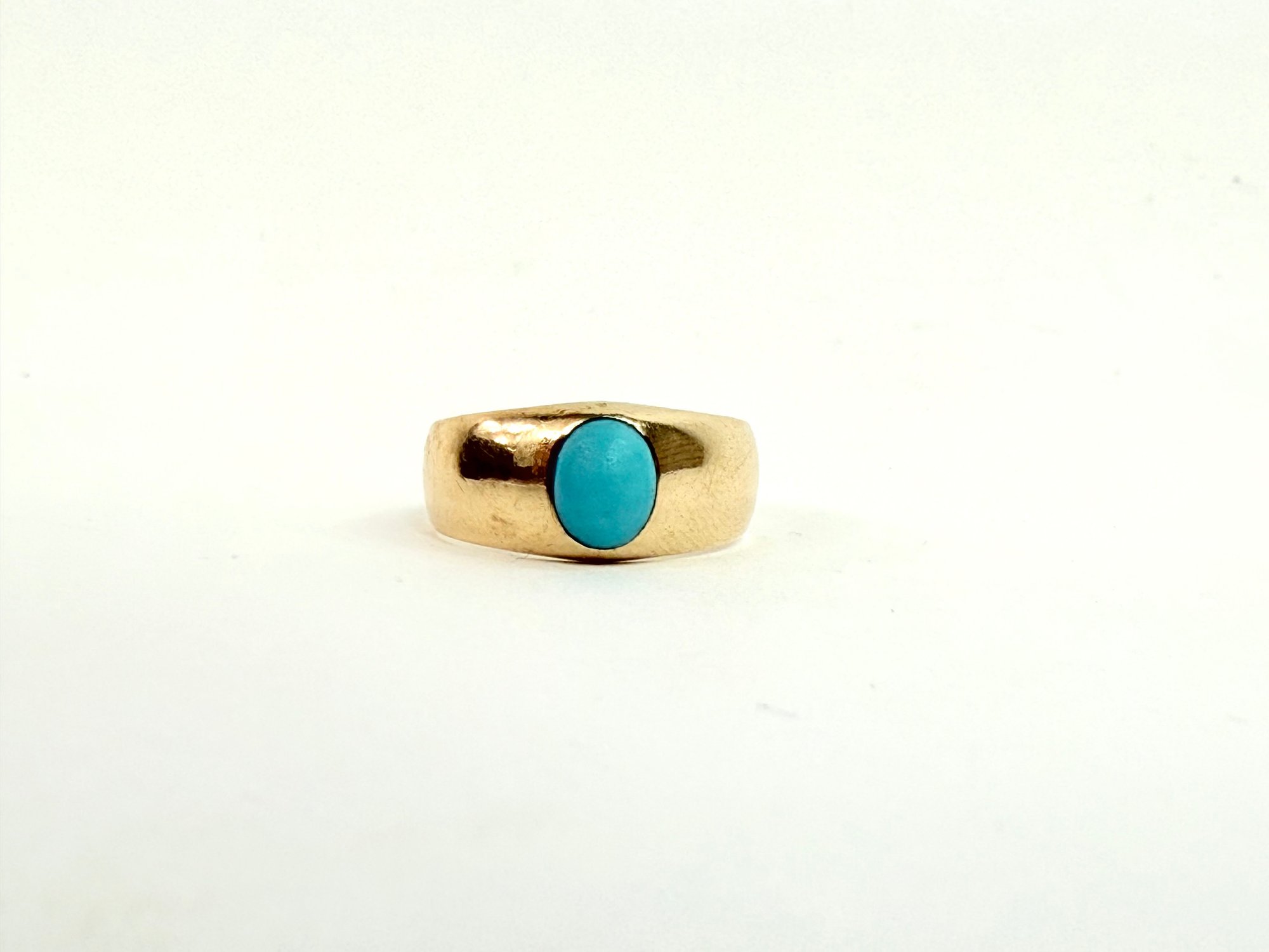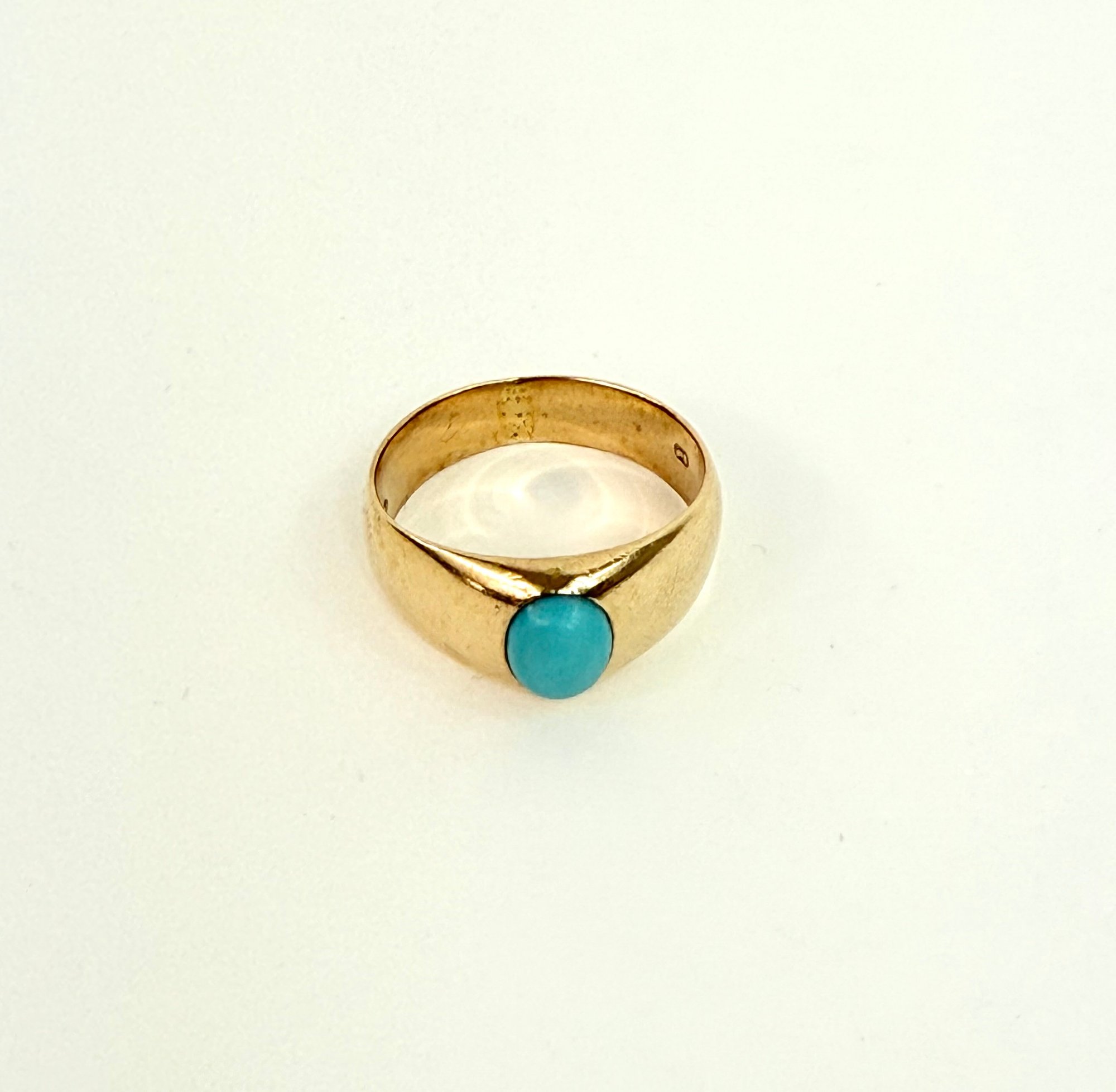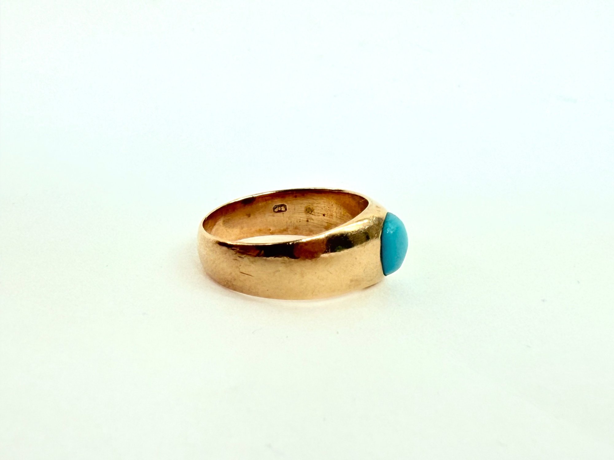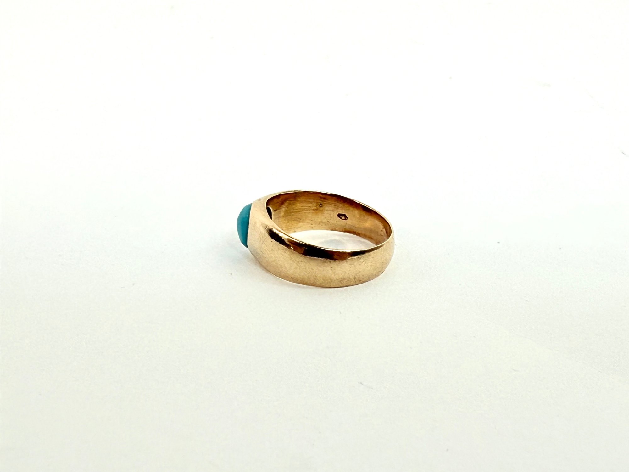 This European ring with turquoise stone has been electronically tested 14 karat with two stamp markings inside.