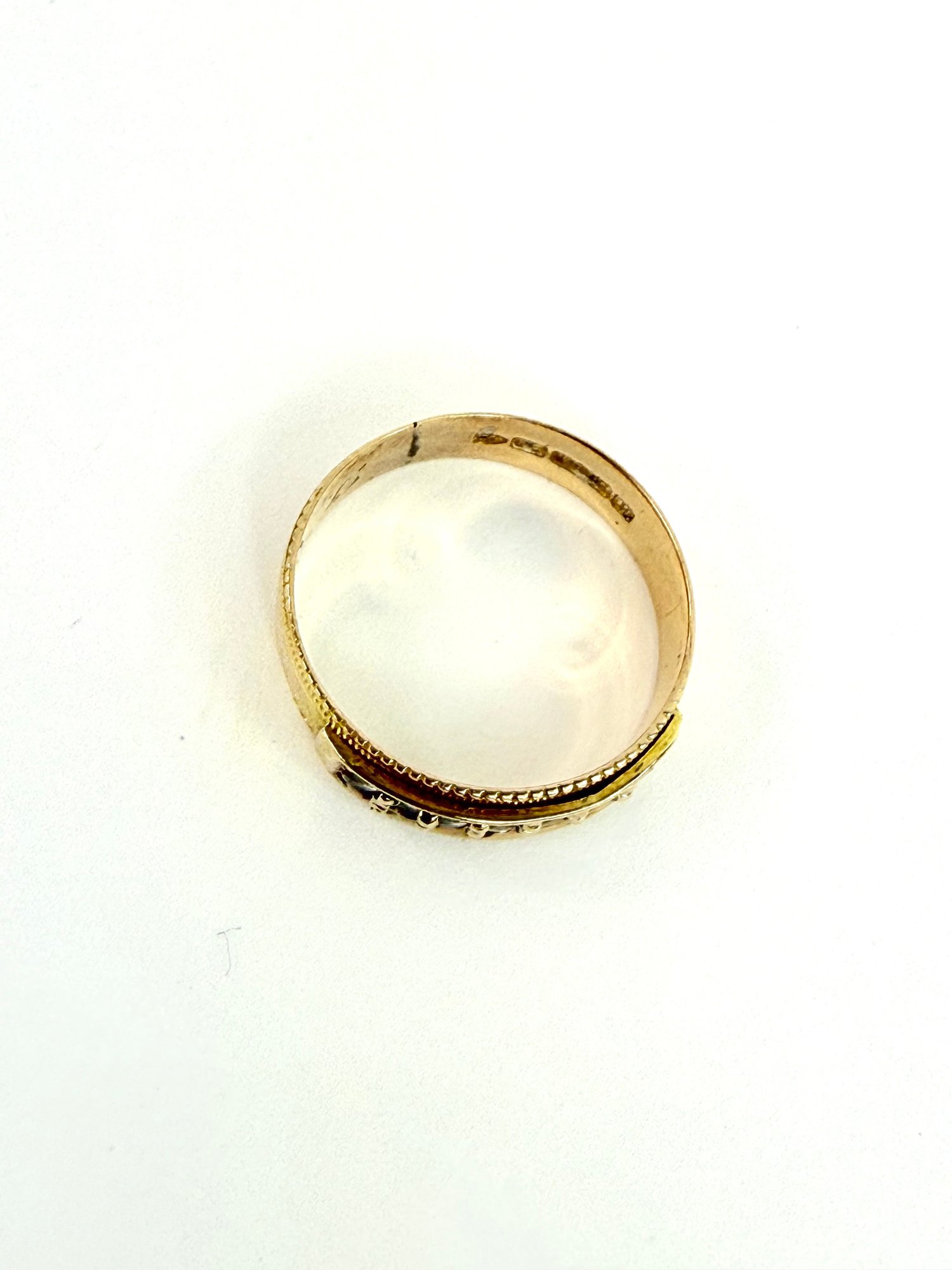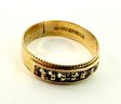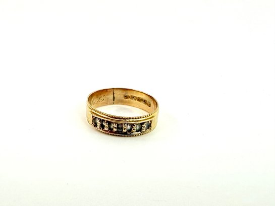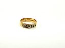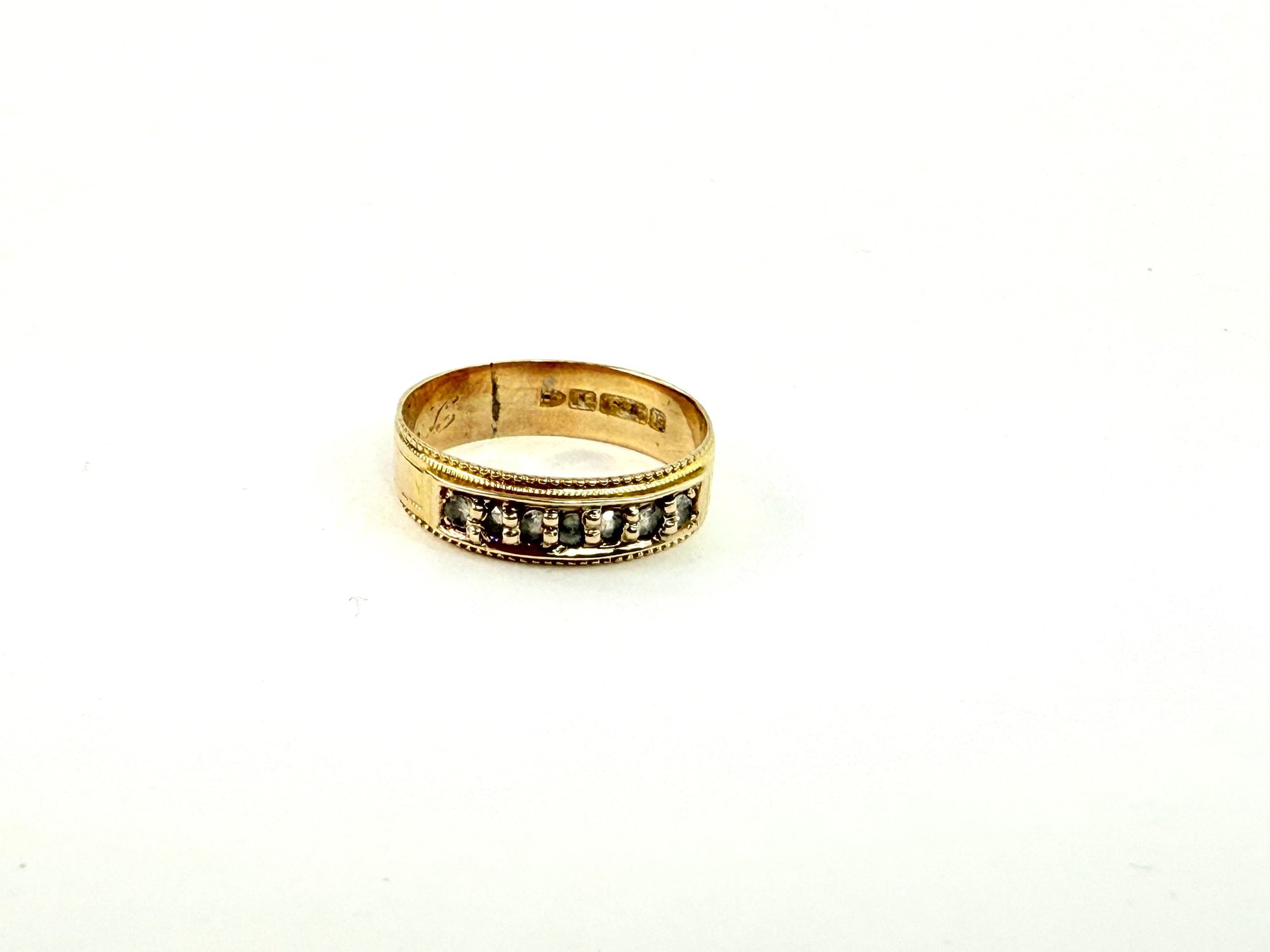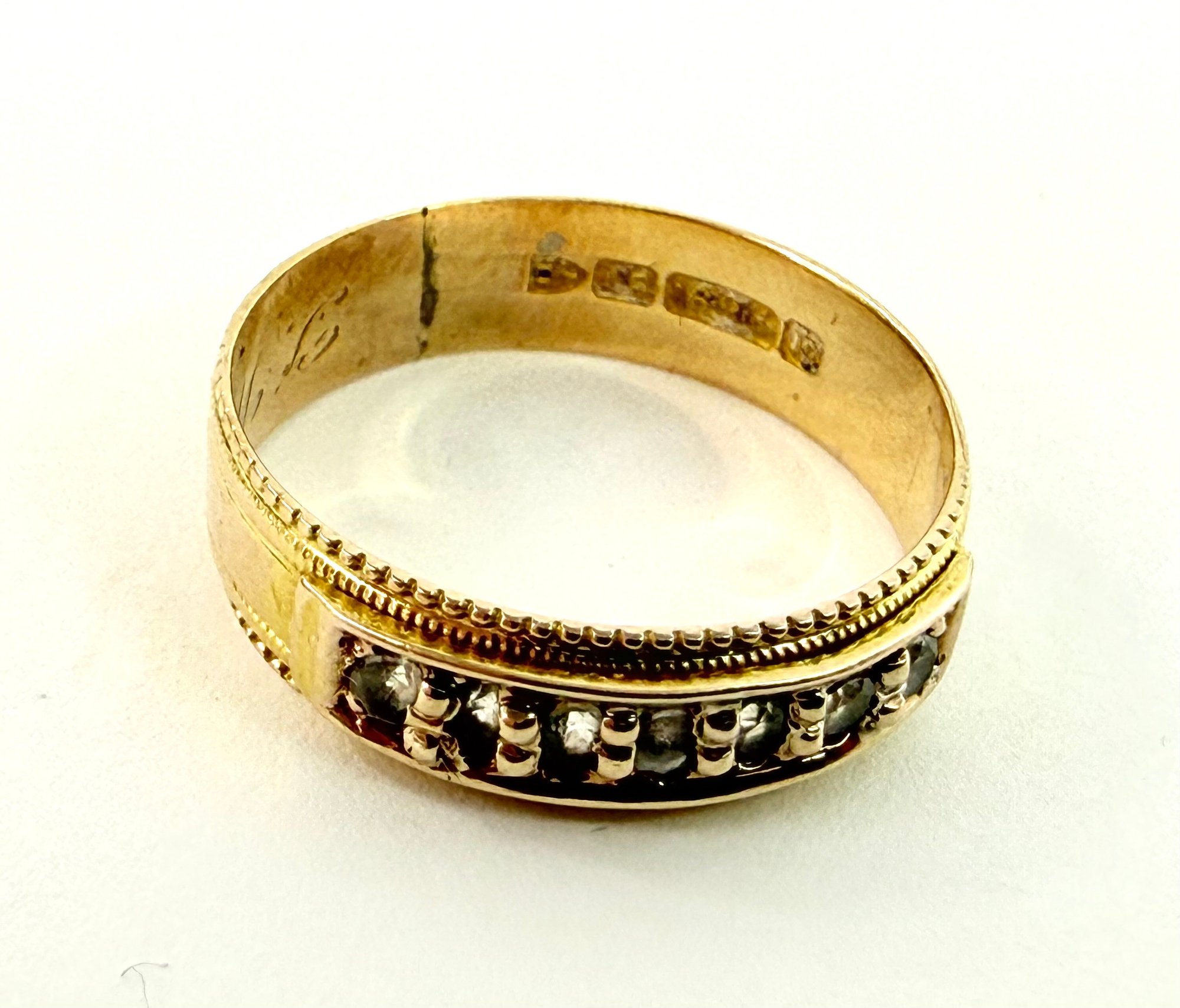 This stamped 15 karat gold ring has seven clear stones stamped inside with European hallmarks. Electronically tested..