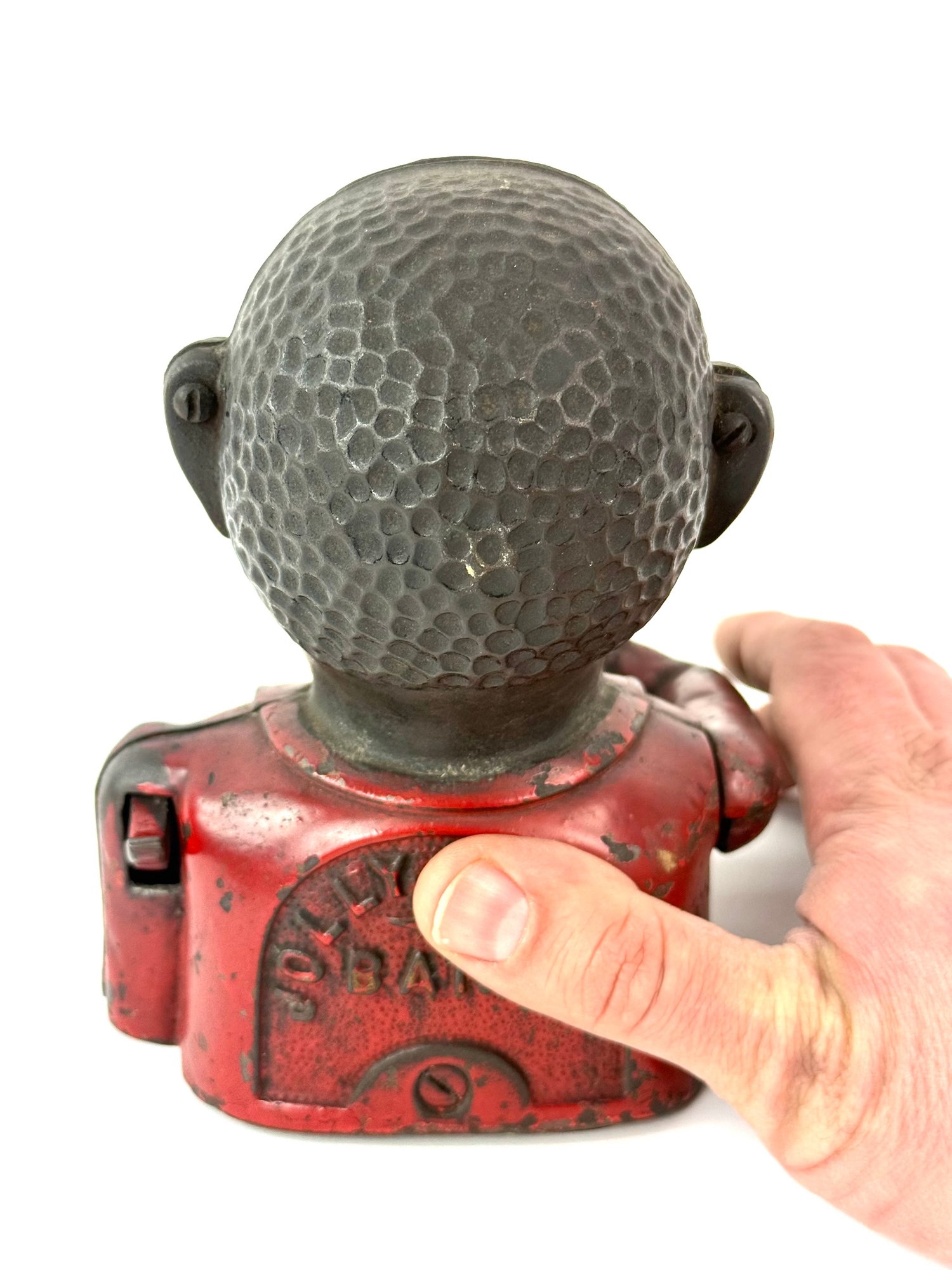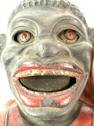 This Jolly Joe coin Bank has a mechanical arm. Its paint is original and is in good condition. Please see photos.