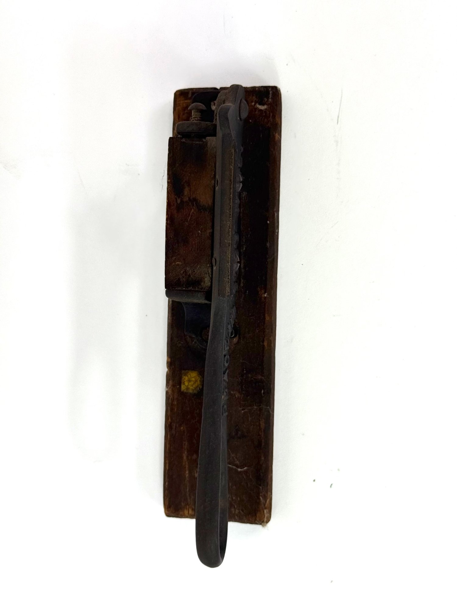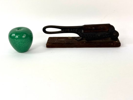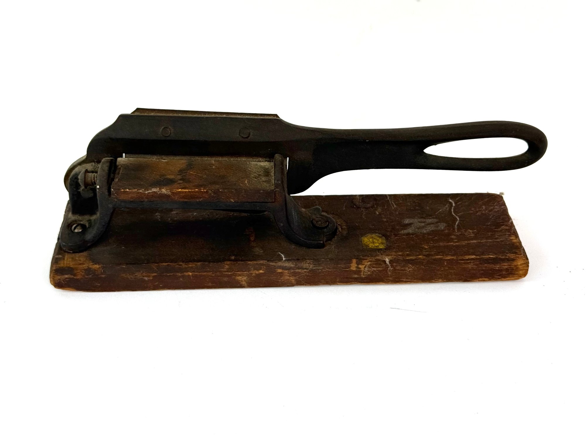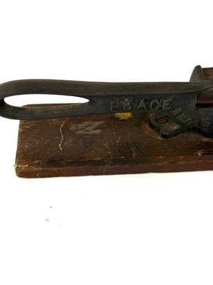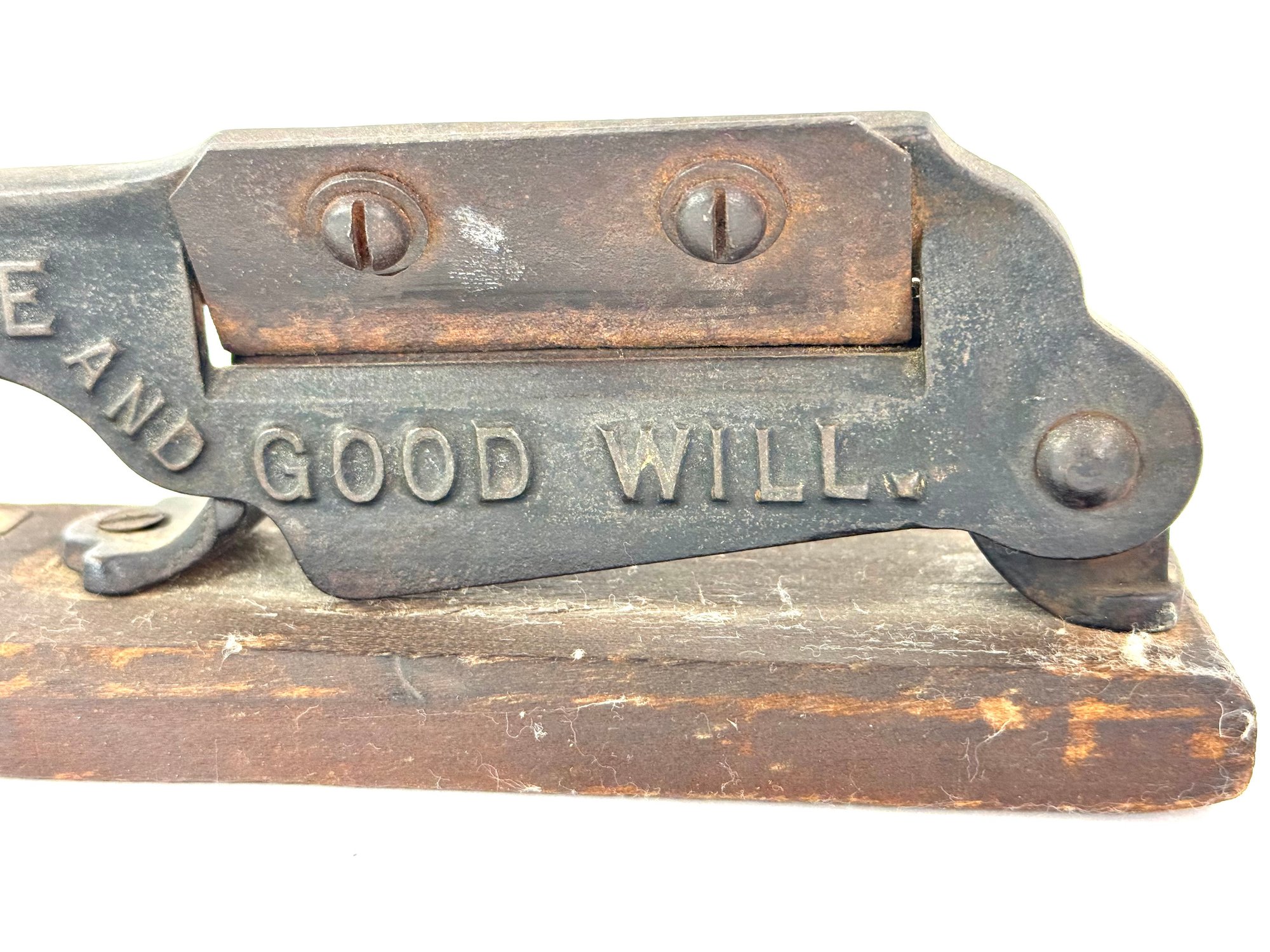 Made of iron and wood ,Peace and Good will embossed on this traveling tobacco cutter.