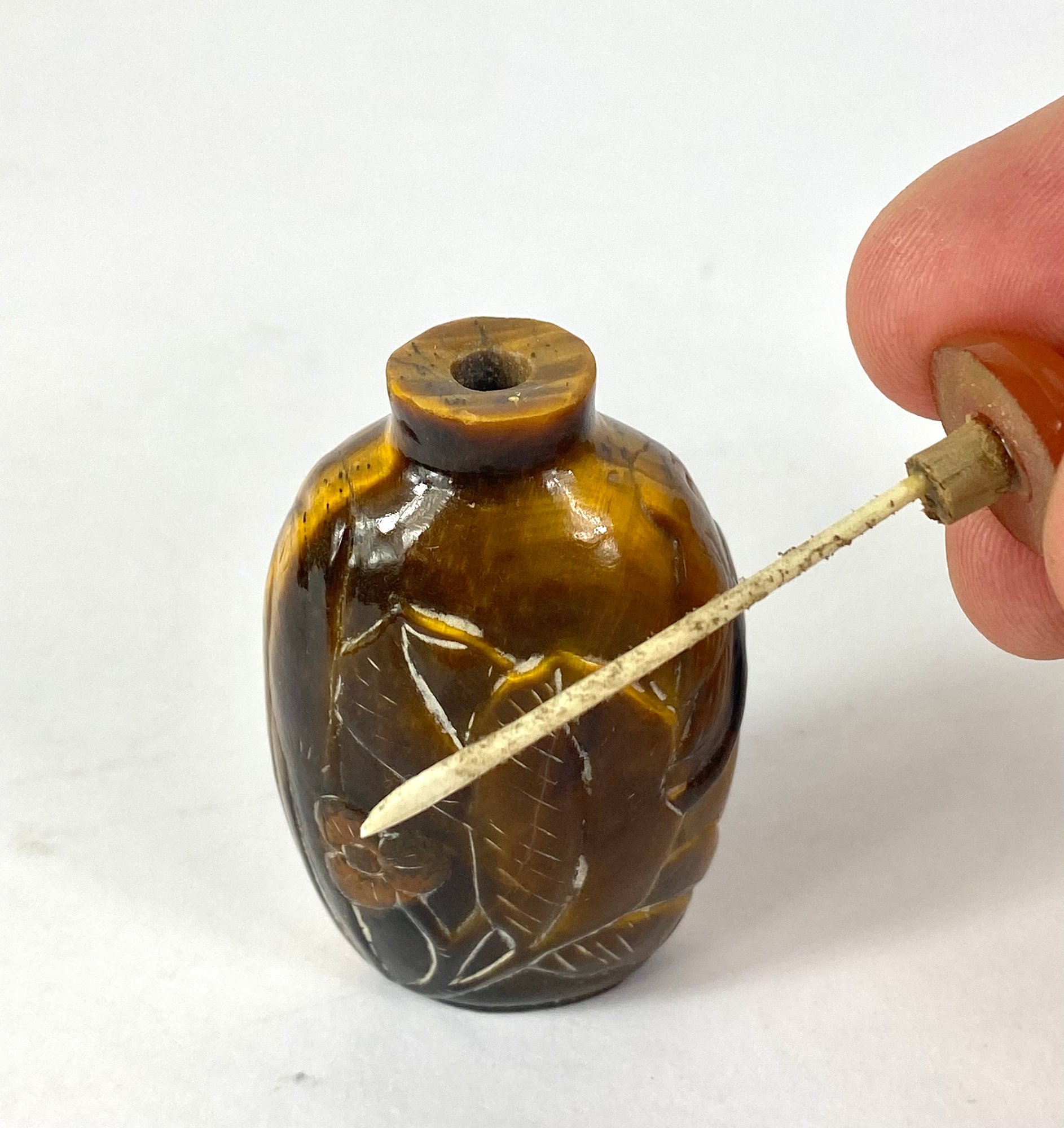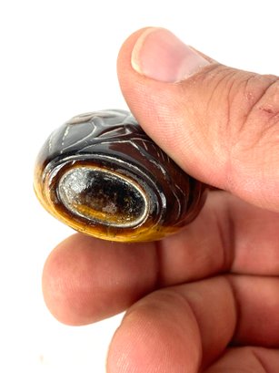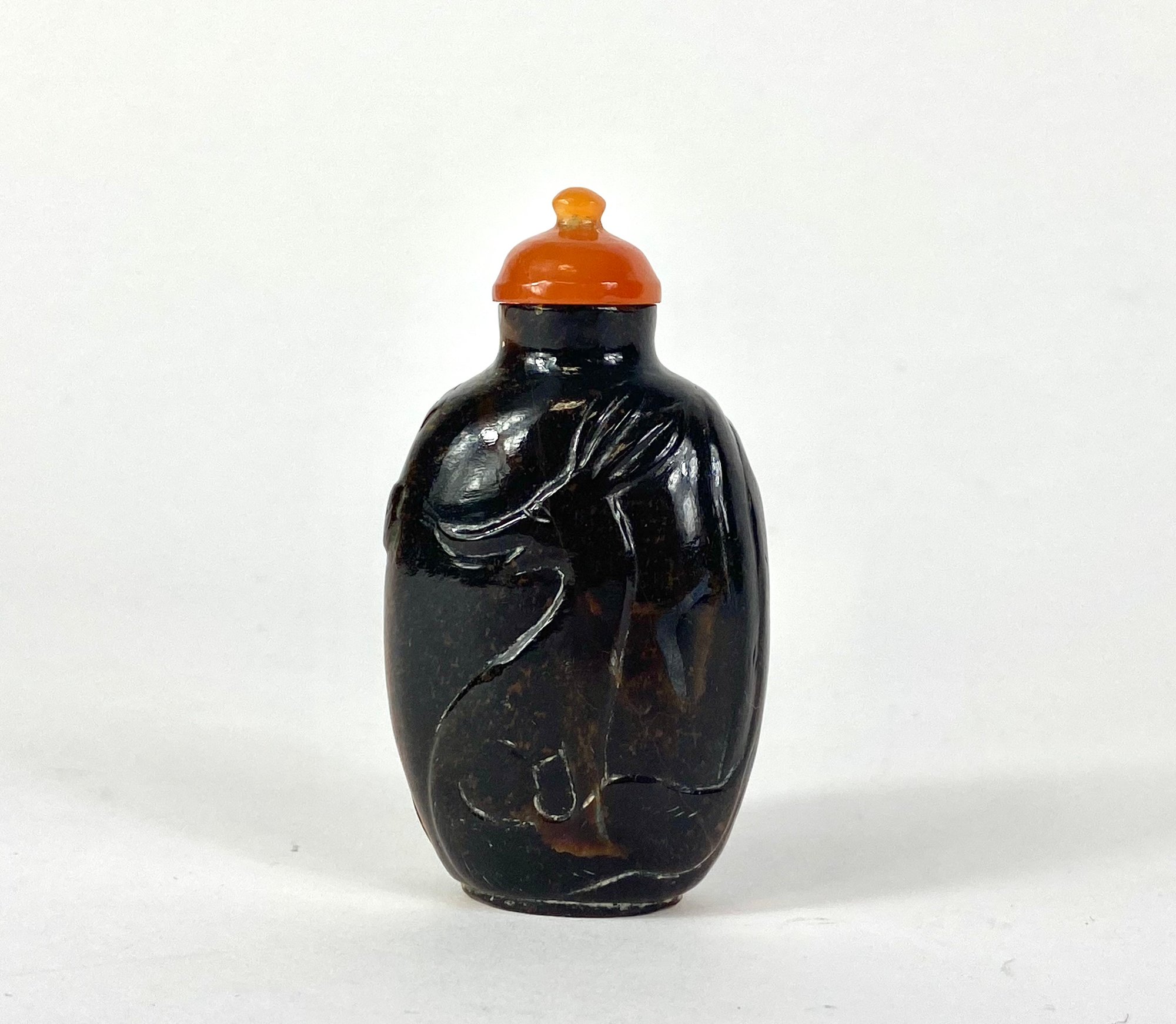Has an indigo fluorescent glass like surface with figure and leaves around its surface.