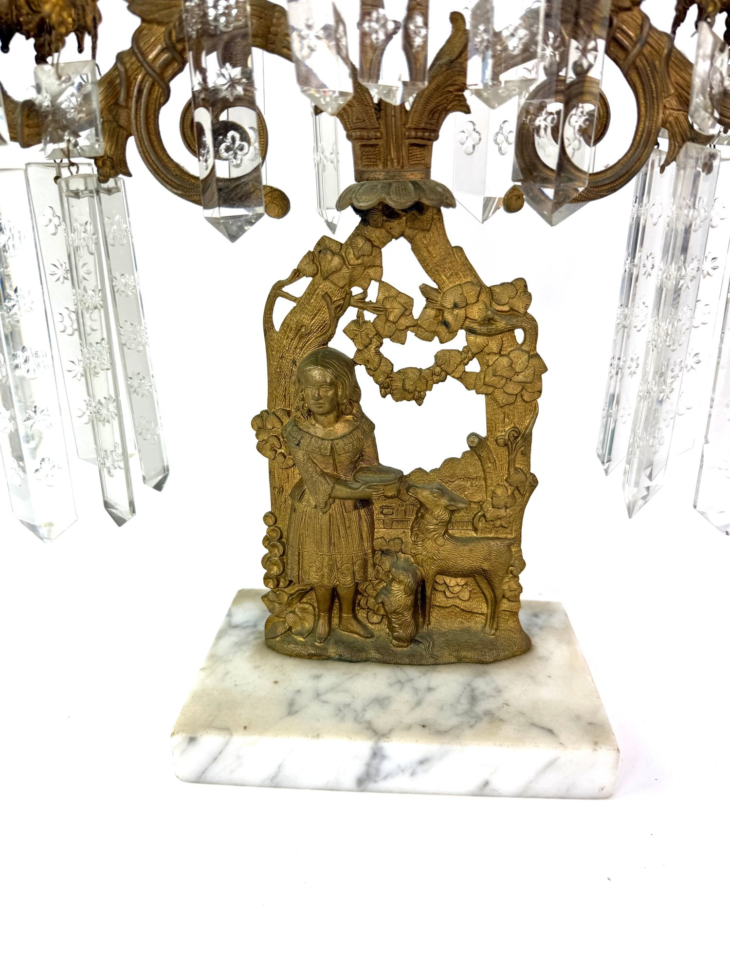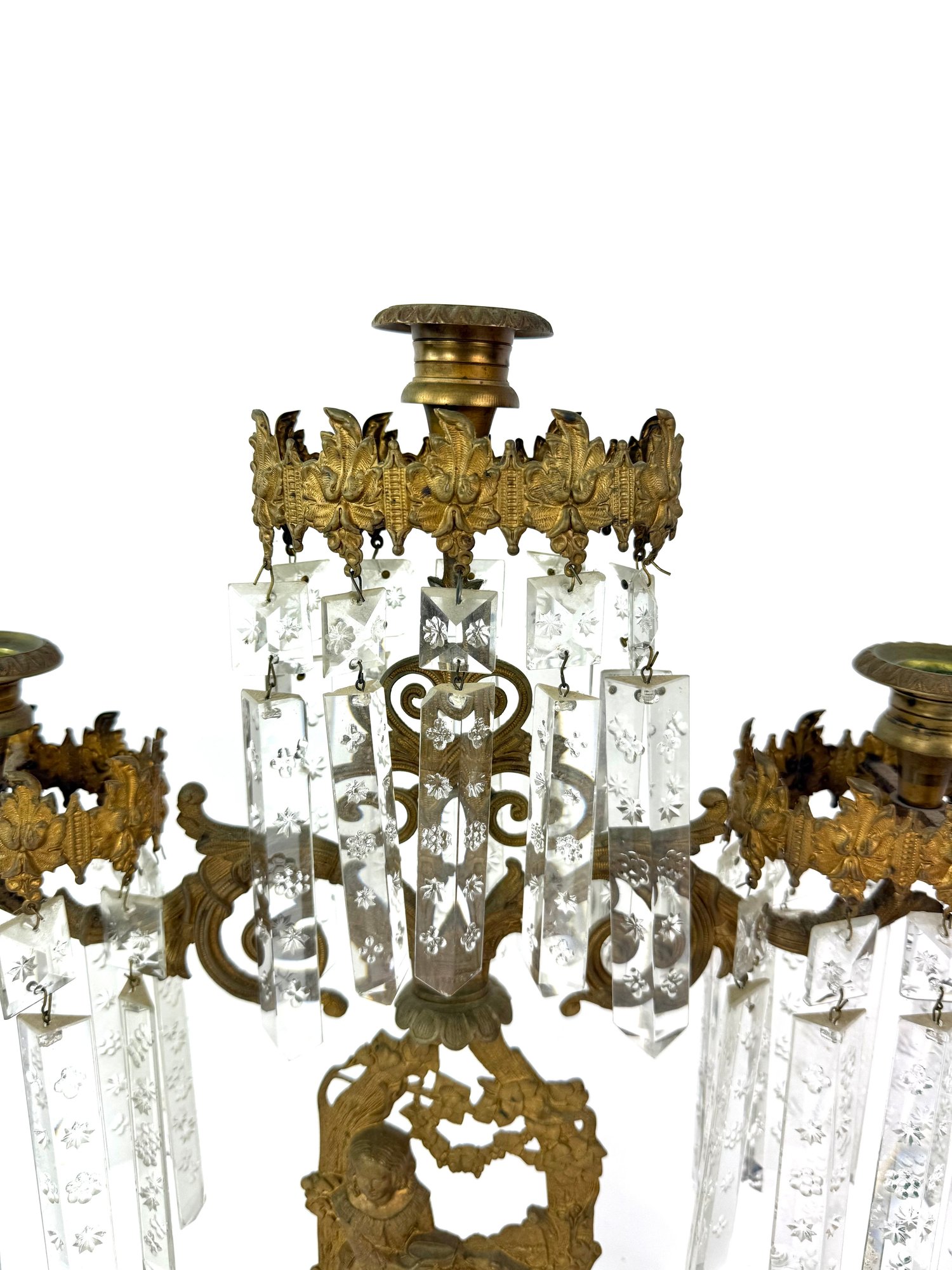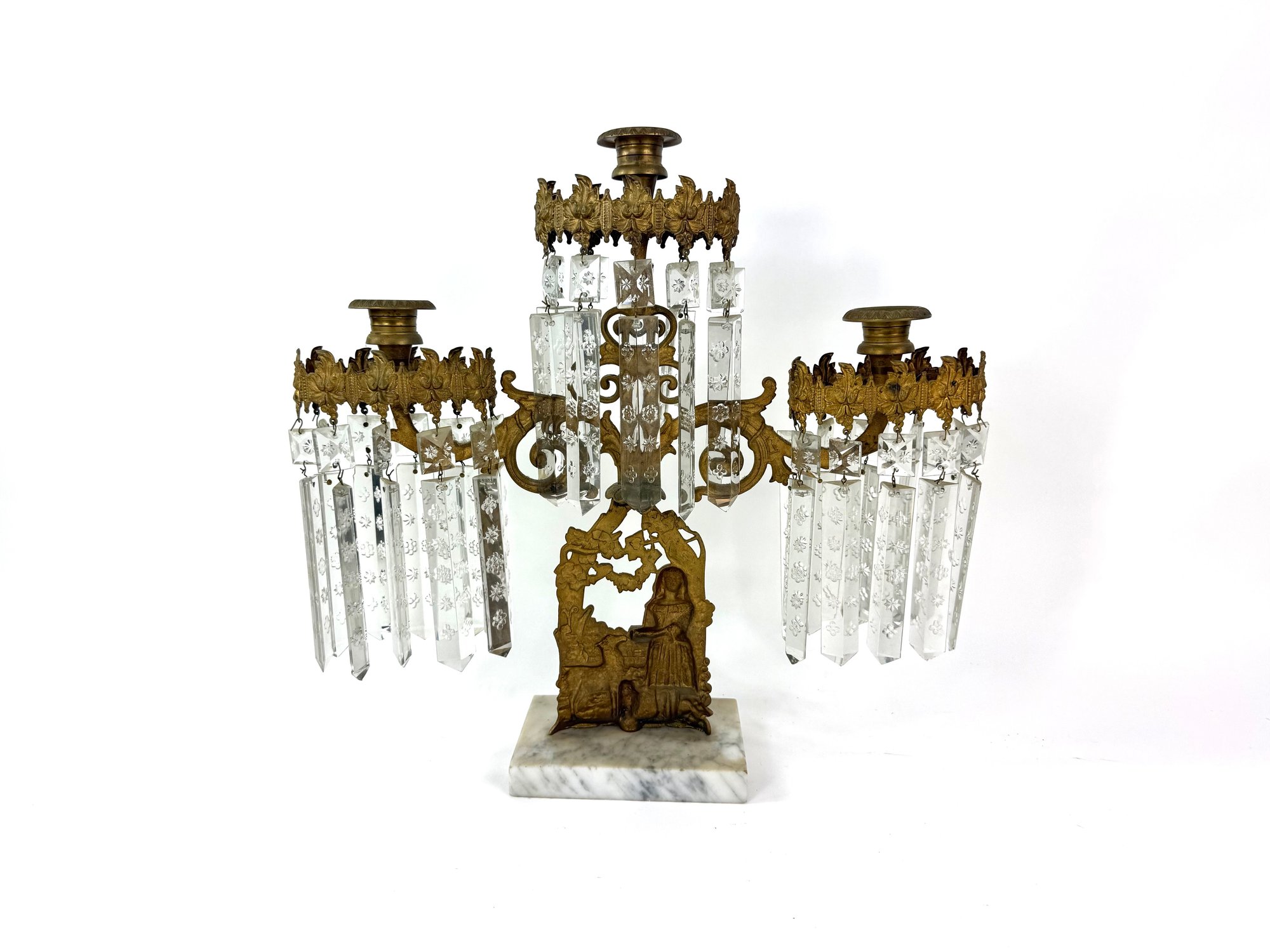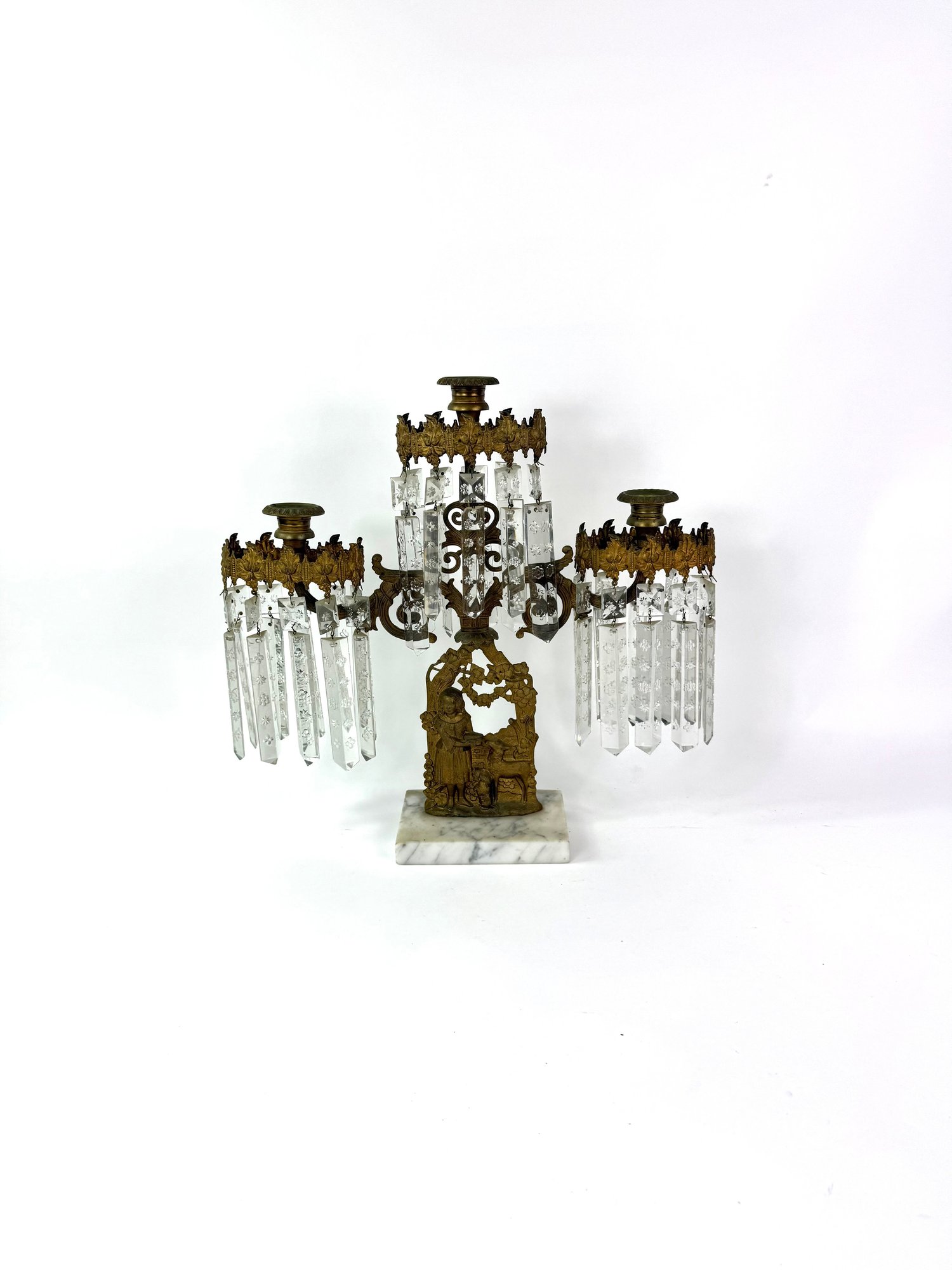 Three brass candle holders with intricate surrounding patterns. The base depicts a woman and two dogs.